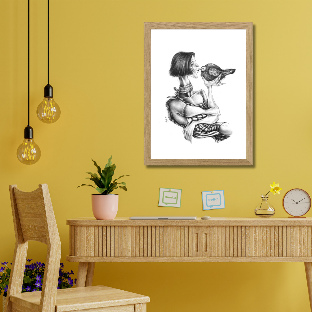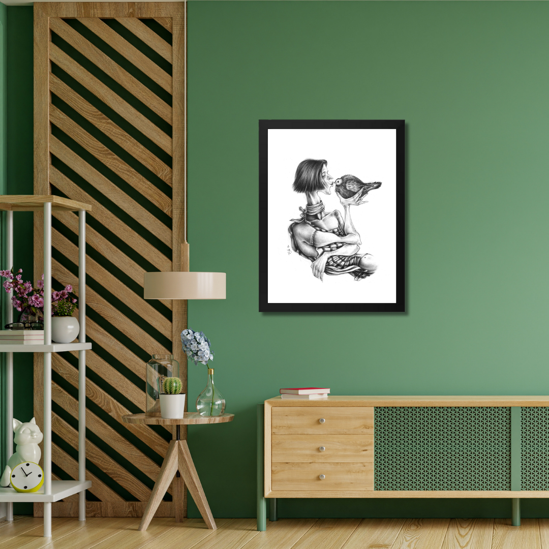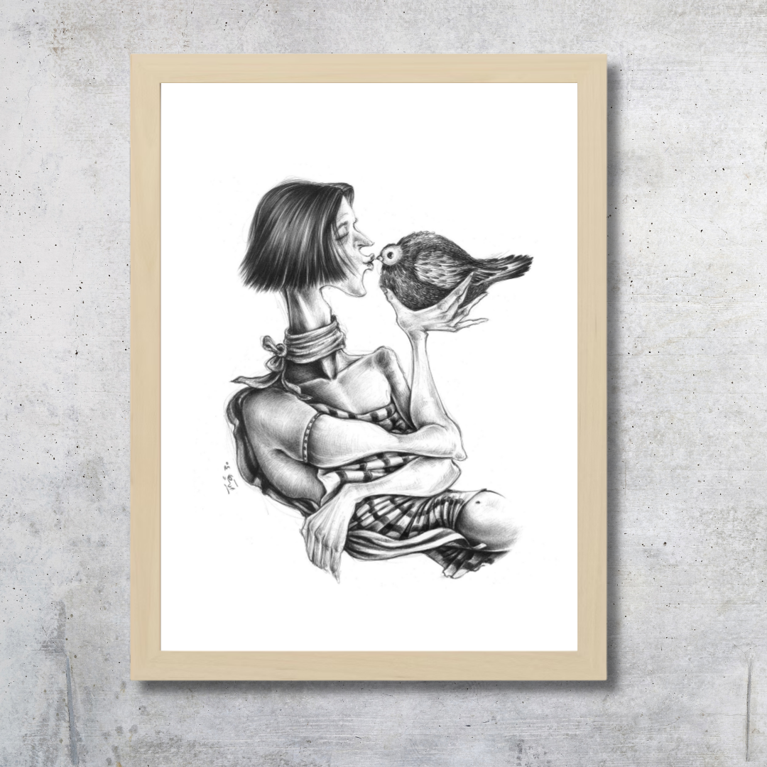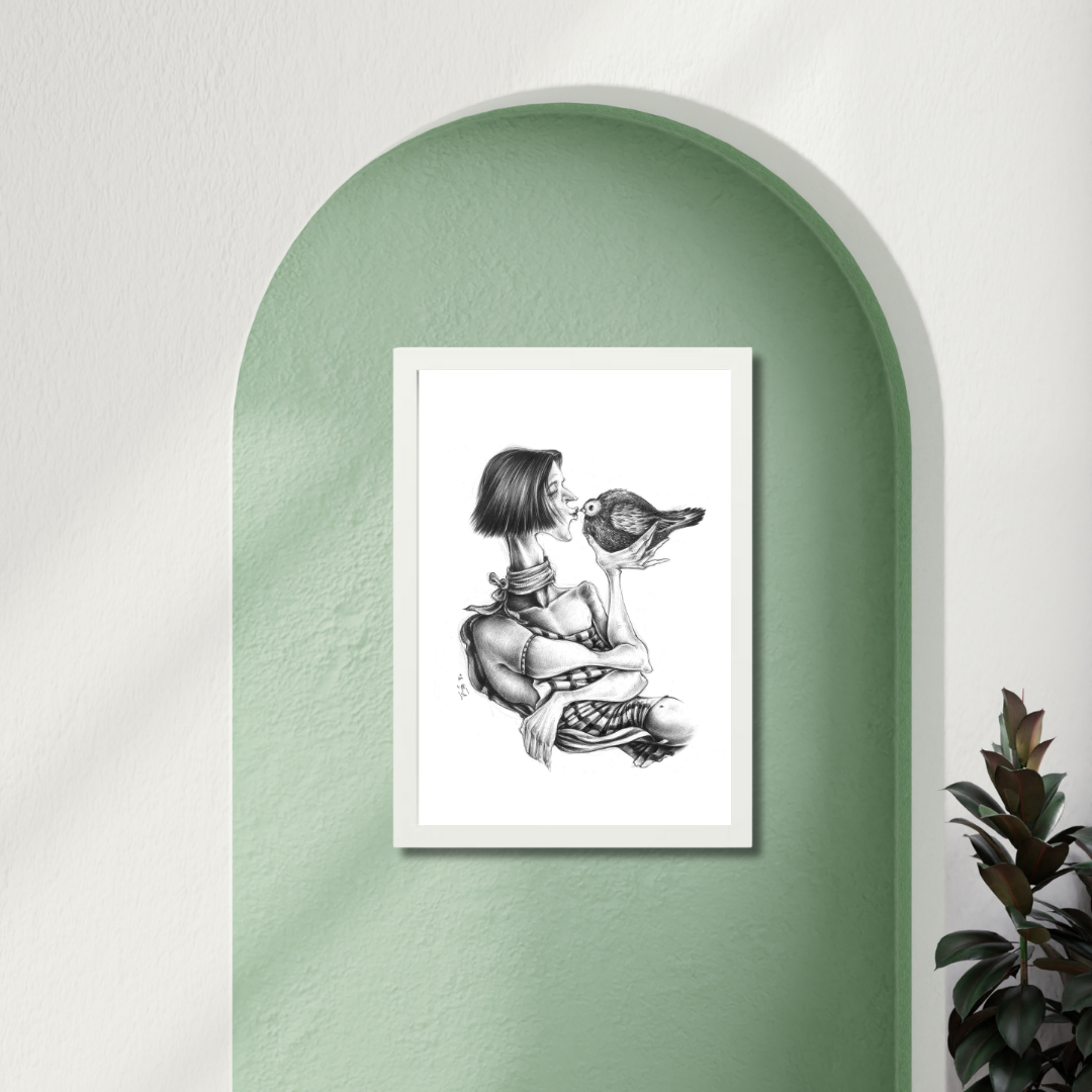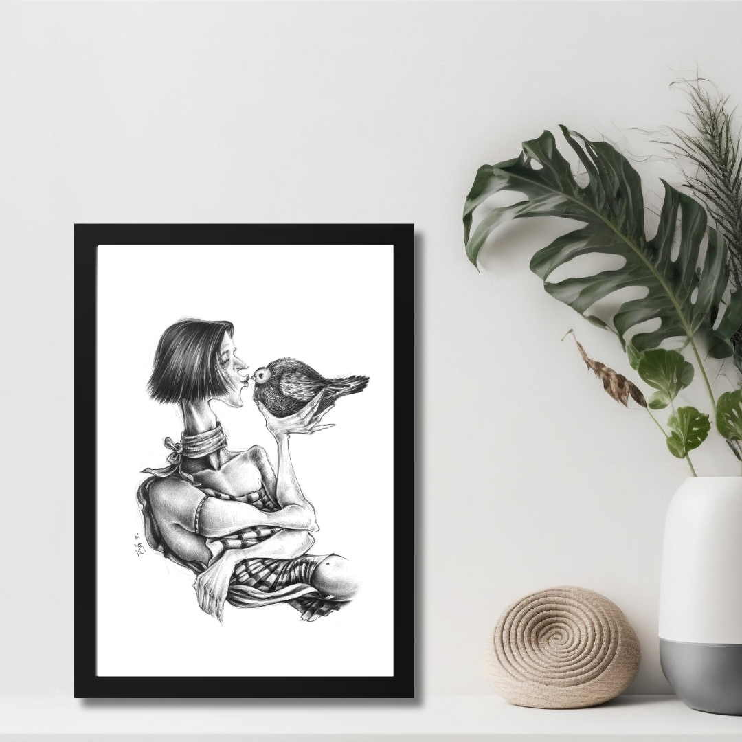 A poetic portrayal of tenderness and trust, A Kiss for Being captures the quiet intimacy between human and creature. With delicate pencil work and surreal proportions, Raeeka explores vulnerability, affection, and the universal need for connection. The simplicity of black and white brings emotional clarity, inviting the viewer to pause and feel the calm of this intimate exchange.