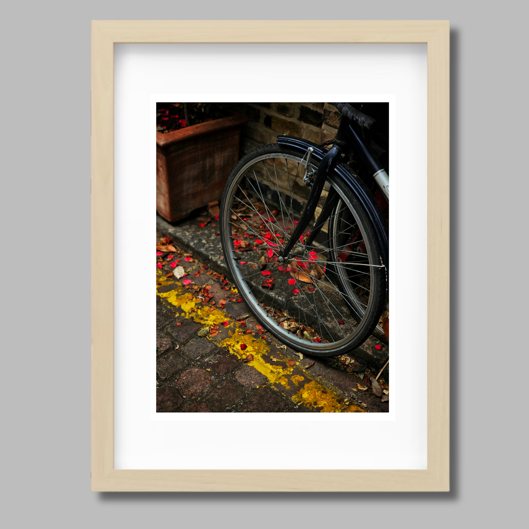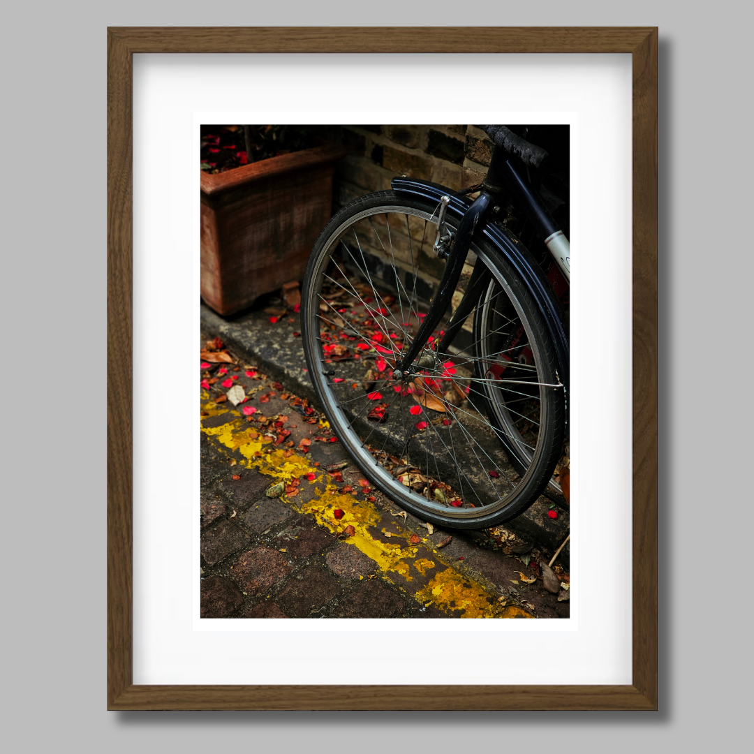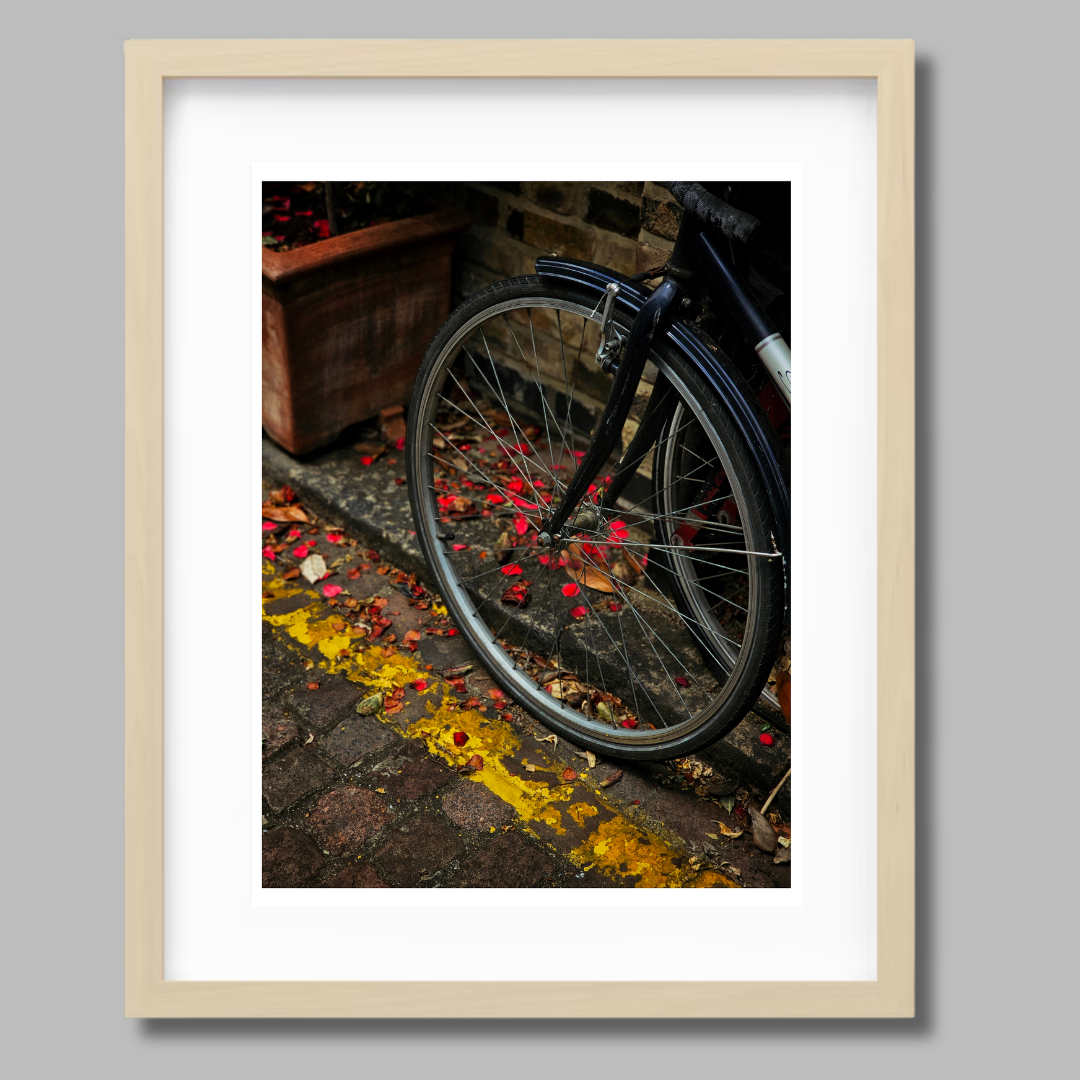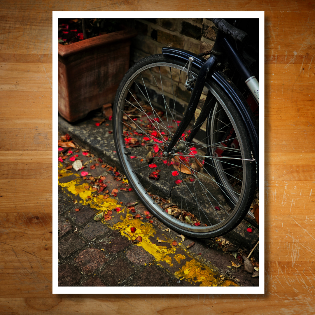 An intimate study of motion and stillness, Details 3 by Sandeep Gupta captures the poetry of street life through a tightly framed scene. The black bicycle wheel anchors the composition with industrial clarity, while the stone curb’s weathered yellow line speaks of passage and time. Scattered red petals and brittle leaves add organic drama, juxtaposed with the quiet geometry of brick and wood in the background. Every element—from the tension in the spokes to the softened textures on the ground—draws the eye to contrast and harmony, inviting reflection on the unnoticed beauty of everyday moments.