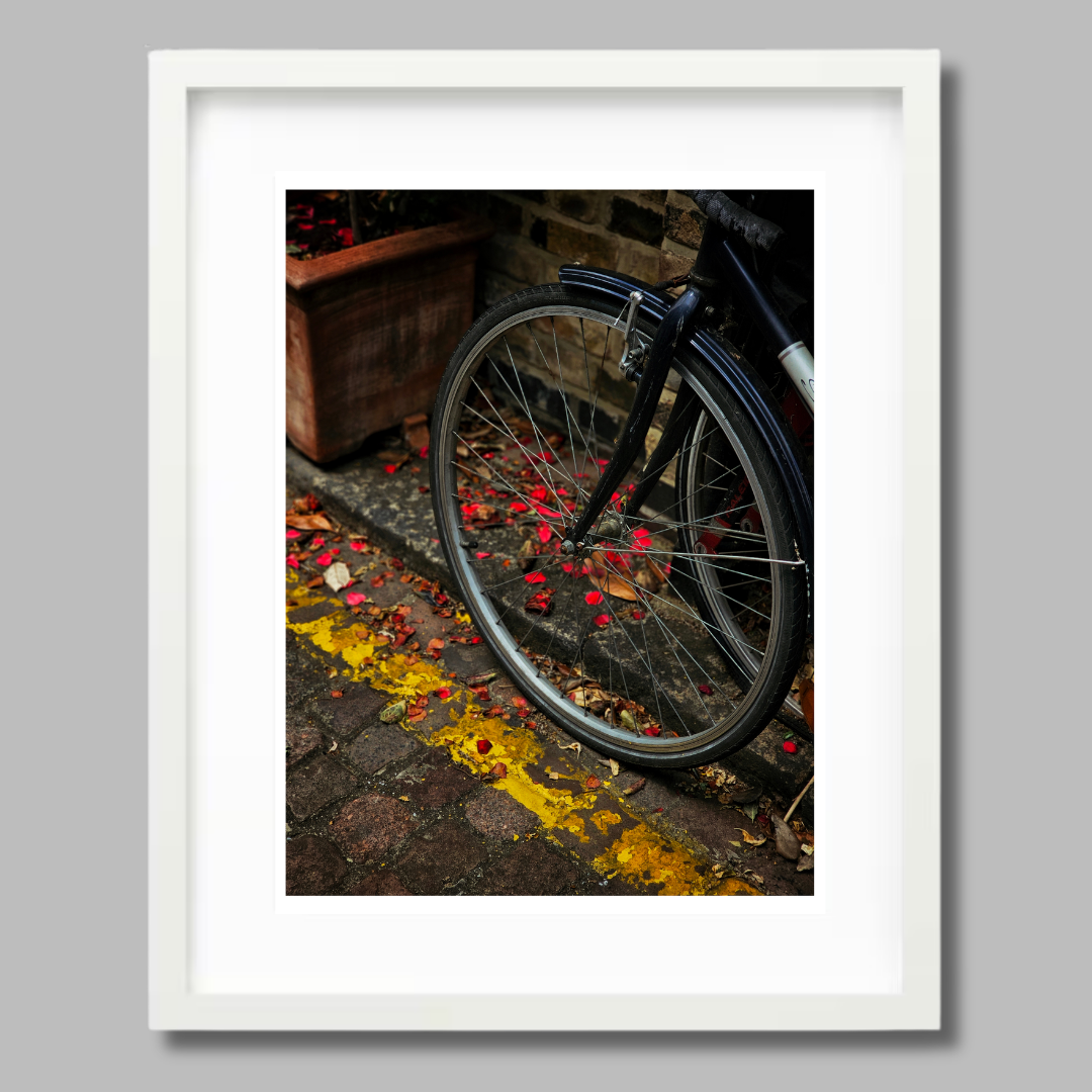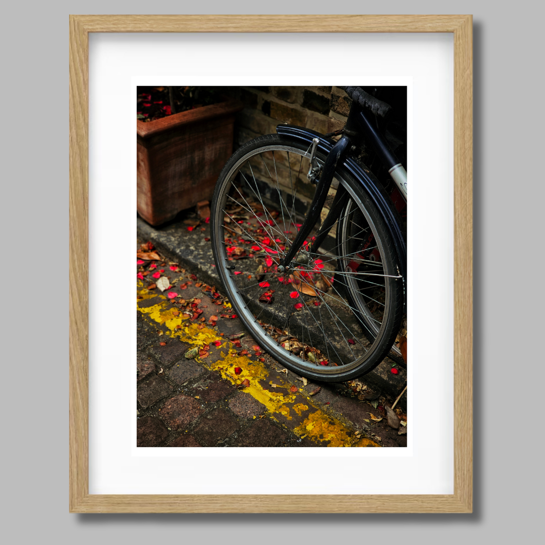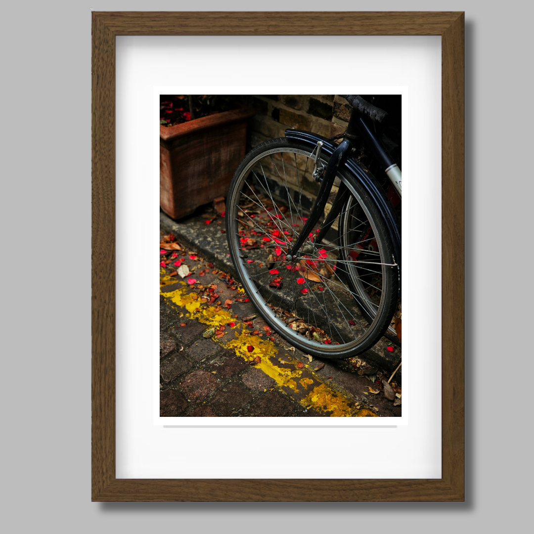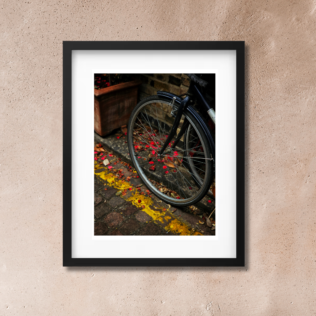 An intimate study of motion and stillness, Details 3 by Sandeep Gupta captures the poetry of street life through a tightly framed scene. The black bicycle wheel anchors the composition with industrial clarity, while the stone curb’s weathered yellow line speaks of passage and time. Scattered red petals and brittle leaves add organic drama, juxtaposed with the quiet geometry of brick and wood in the background. Every element—from the tension in the spokes to the softened textures on the ground—draws the eye to contrast and harmony, inviting reflection on the unnoticed beauty of everyday moments.