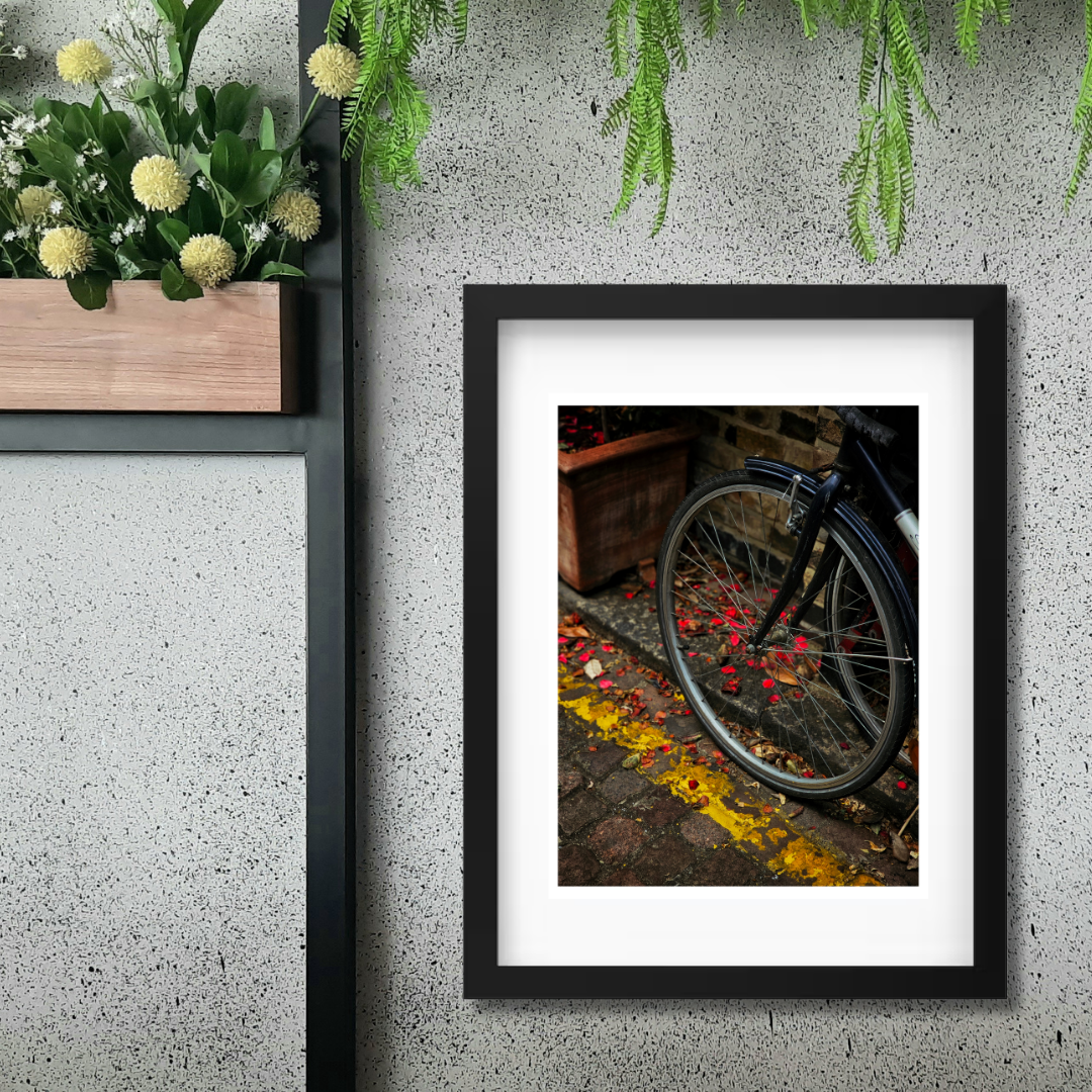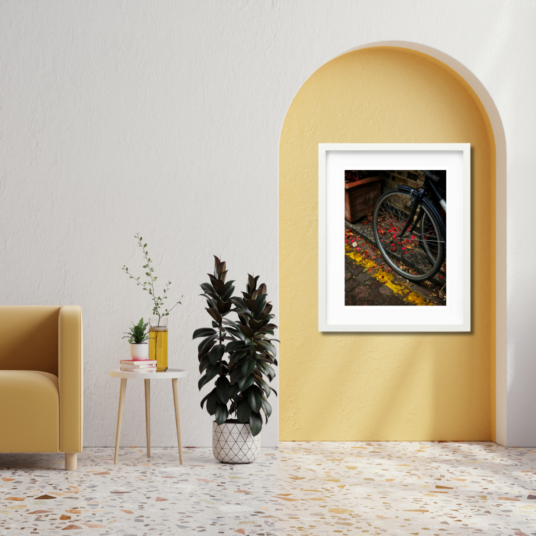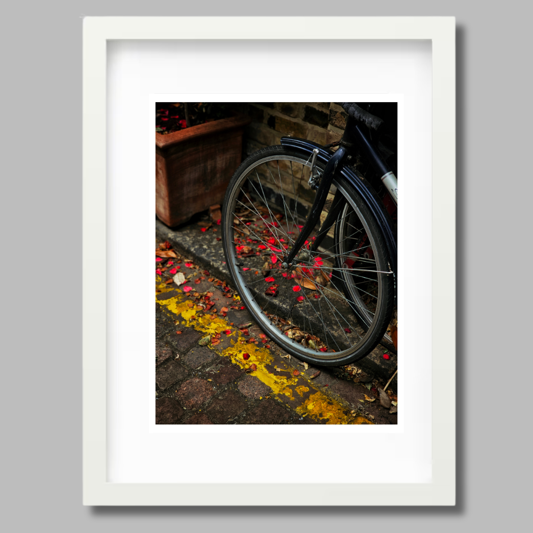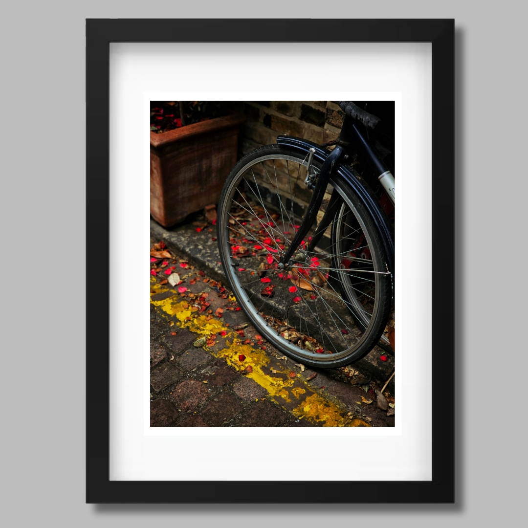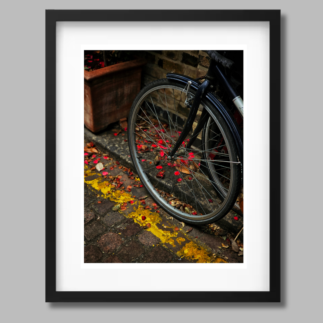 An intimate study of motion and stillness, Details 3 by Sandeep Gupta captures the poetry of street life through a tightly framed scene. The black bicycle wheel anchors the composition with industrial clarity, while the stone curb’s weathered yellow line speaks of passage and time. Scattered red petals and brittle leaves add organic drama, juxtaposed with the quiet geometry of brick and wood in the background. Every element—from the tension in the spokes to the softened textures on the ground—draws the eye to contrast and harmony, inviting reflection on the unnoticed beauty of everyday moments.