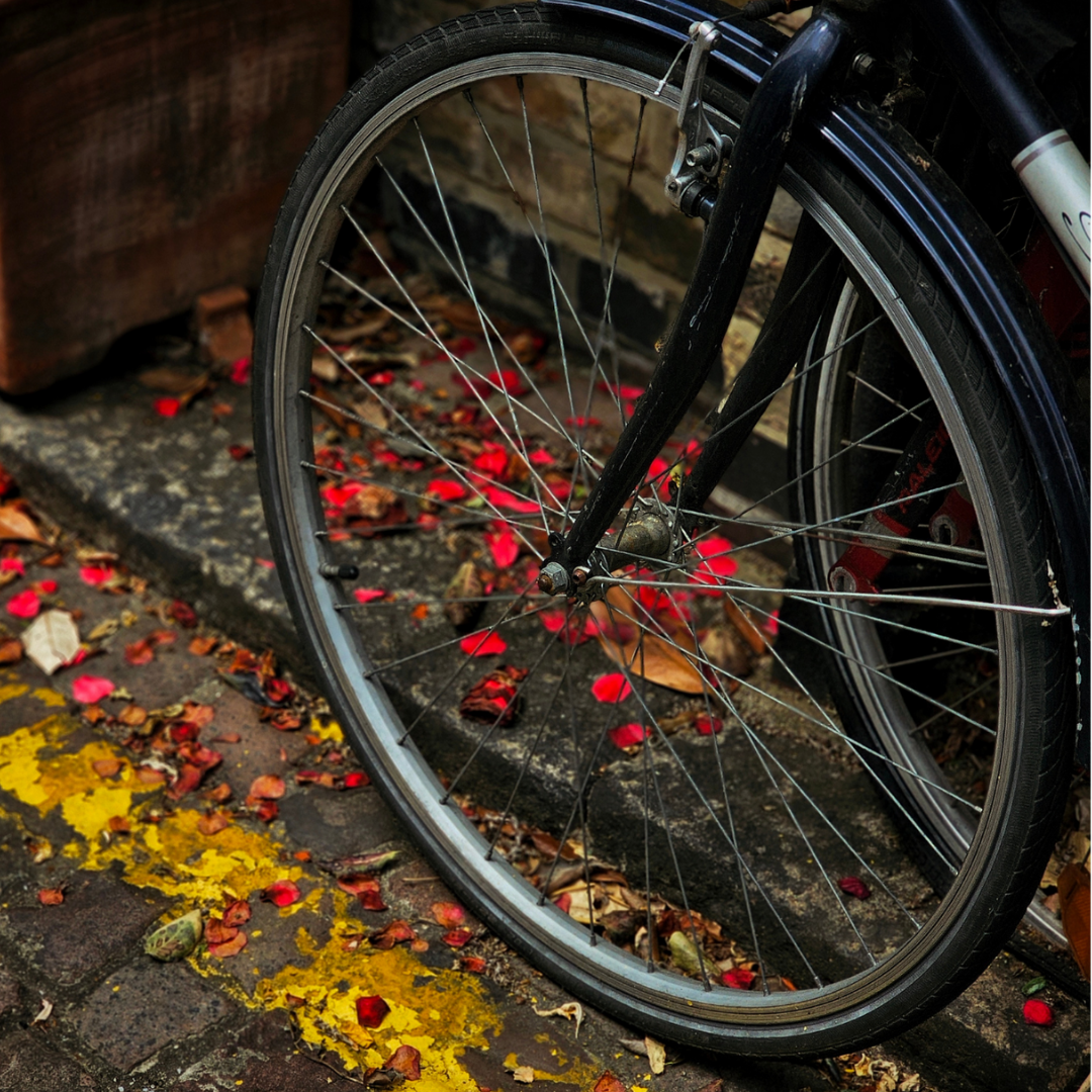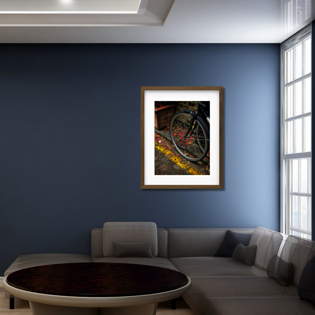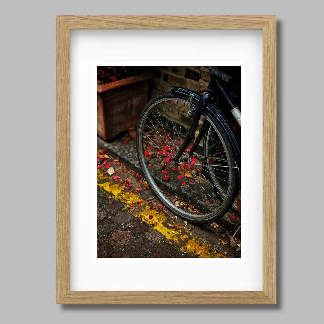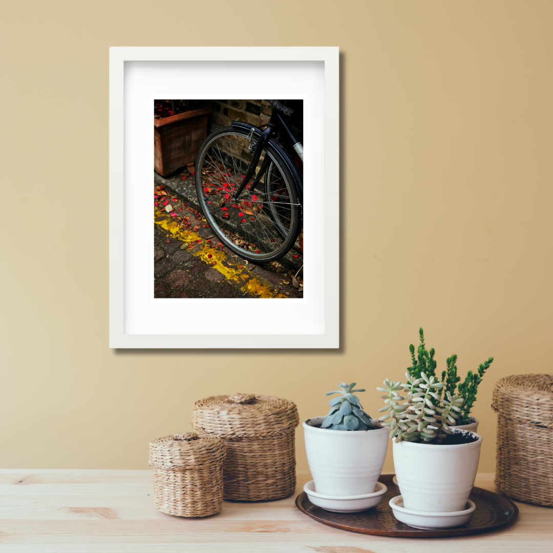 An intimate study of motion and stillness, Details 3 by Sandeep Gupta captures the poetry of street life through a tightly framed scene. The black bicycle wheel anchors the composition with industrial clarity, while the stone curb’s weathered yellow line speaks of passage and time. Scattered red petals and brittle leaves add organic drama, juxtaposed with the quiet geometry of brick and wood in the background. Every element—from the tension in the spokes to the softened textures on the ground—draws the eye to contrast and harmony, inviting reflection on the unnoticed beauty of everyday moments.