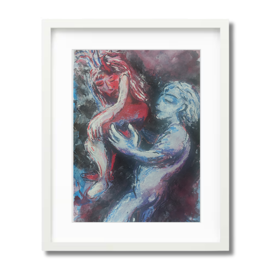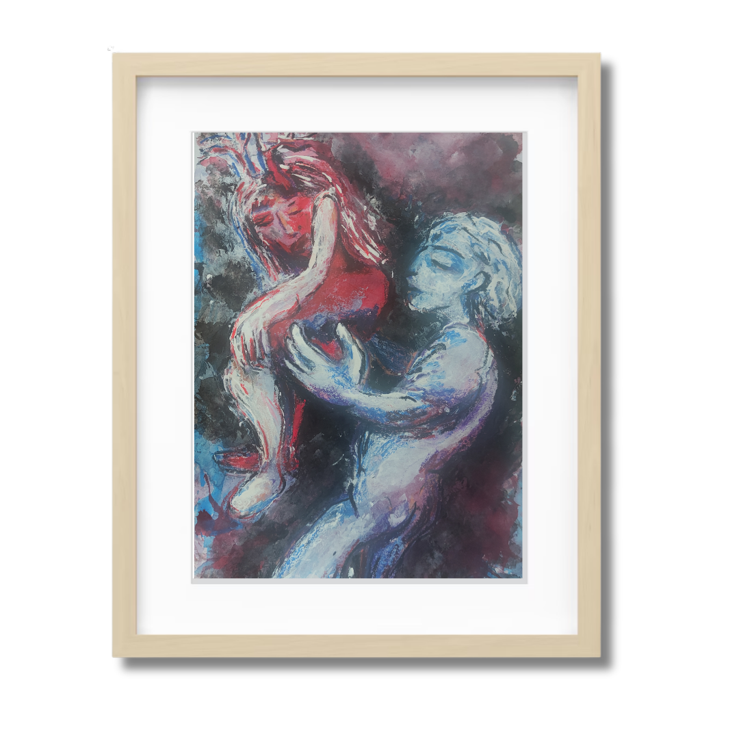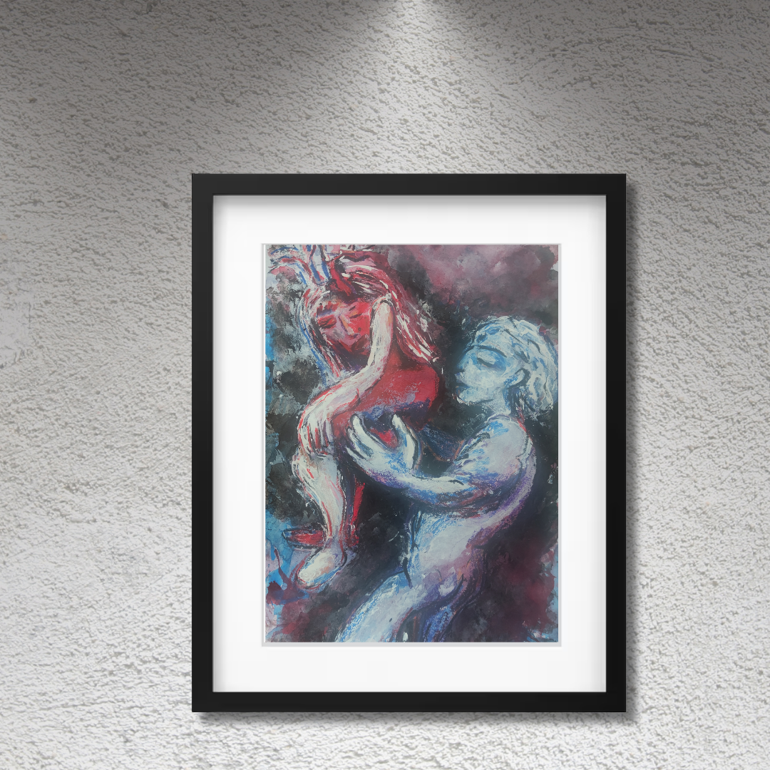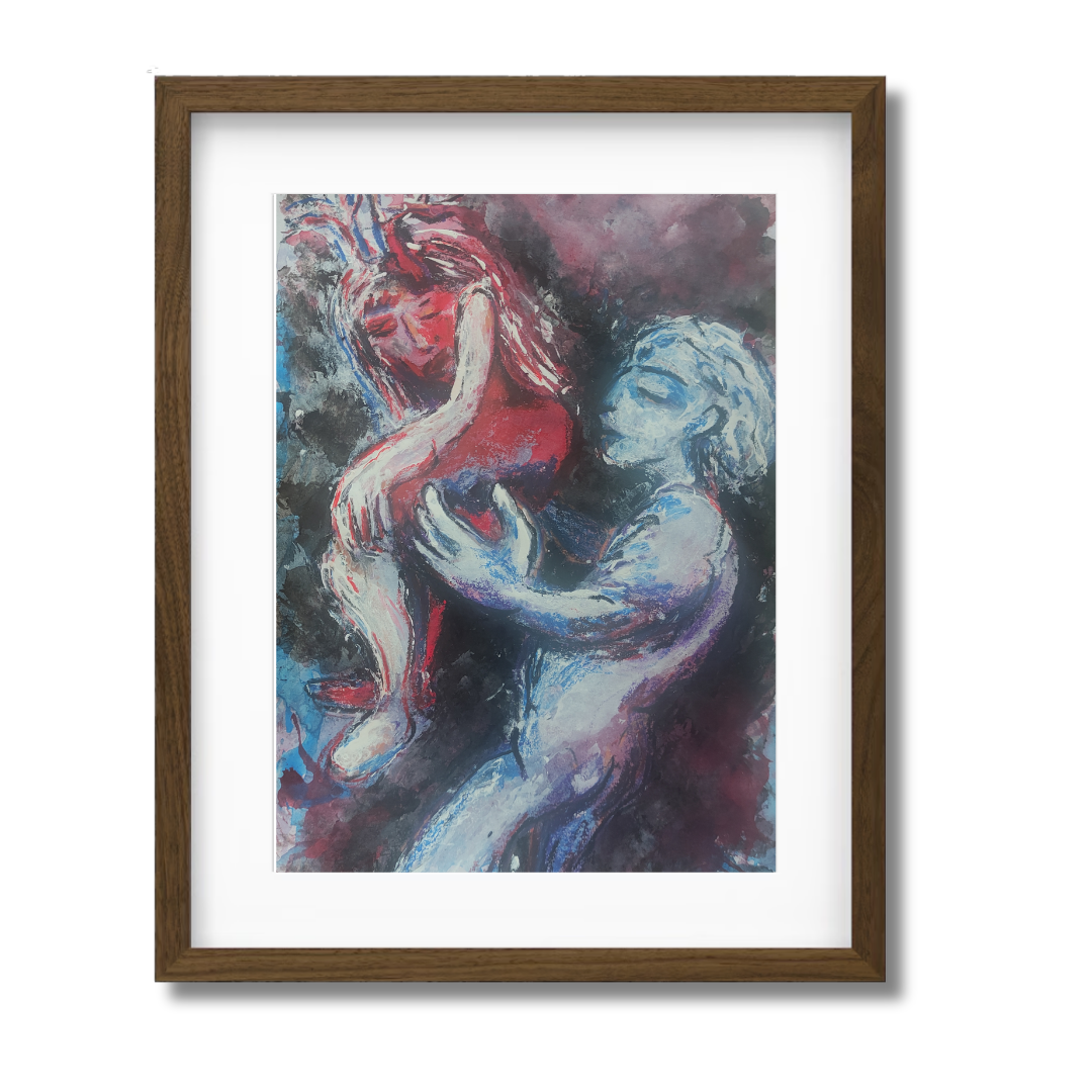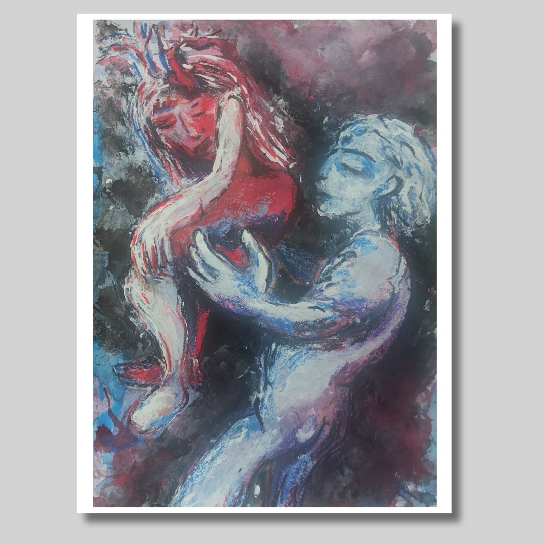 An intimate and emotive composition, Hold Me explores the vulnerability and strength of human connection. Rendered in expressive strokes and deep, moody tones, the original acrylic painting evokes tenderness and emotional depth through intertwined figures bathed in contrasting hues of red and blue. This piece brings powerful visual storytelling to any personal or contemplative space.