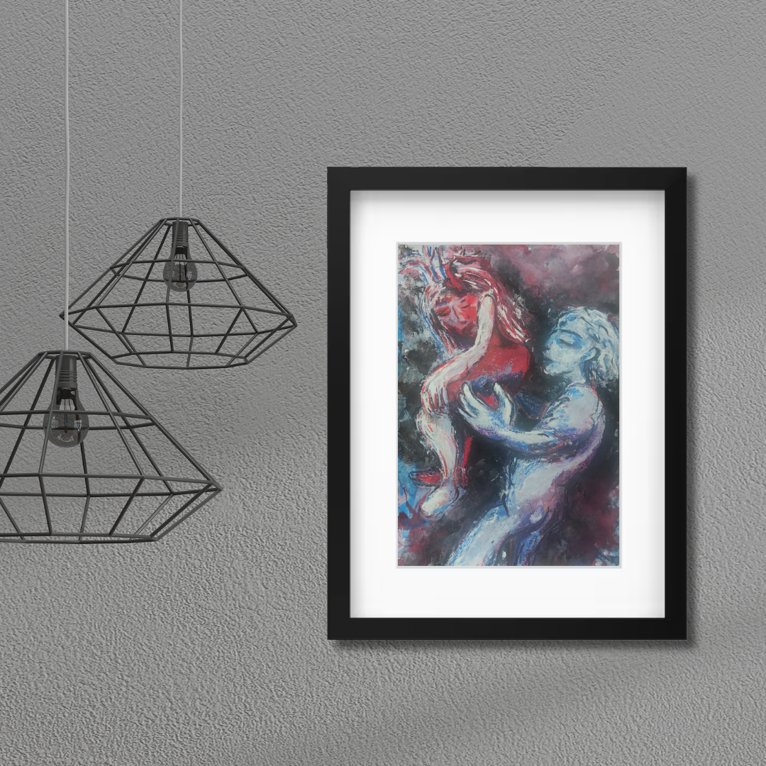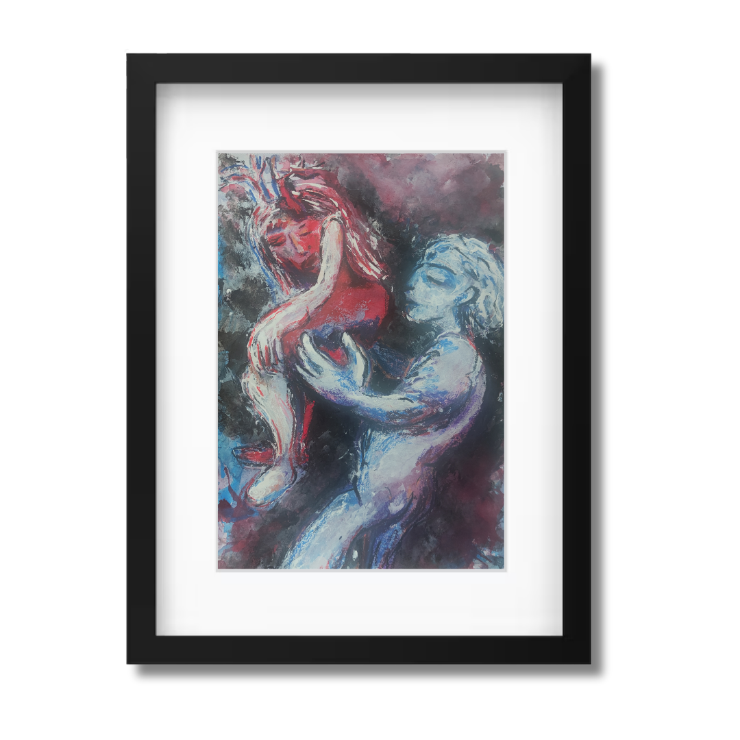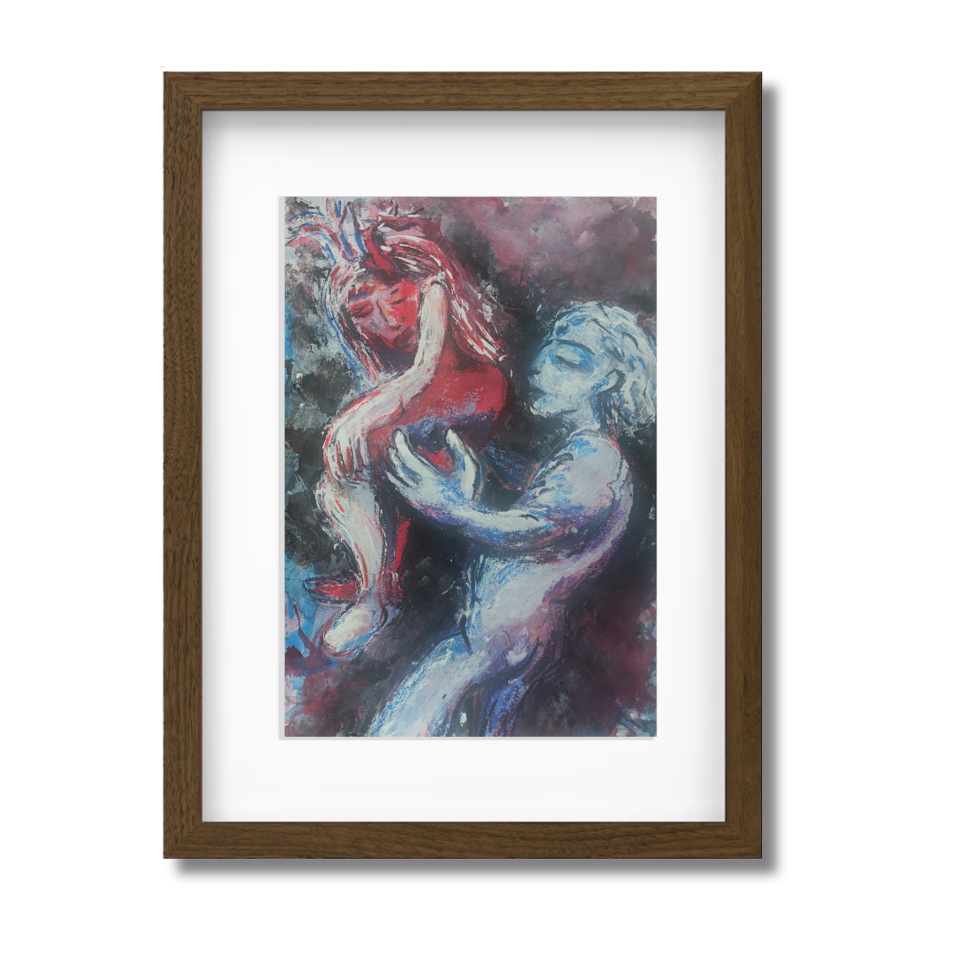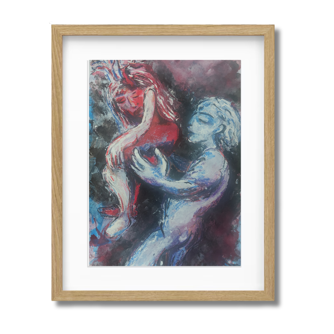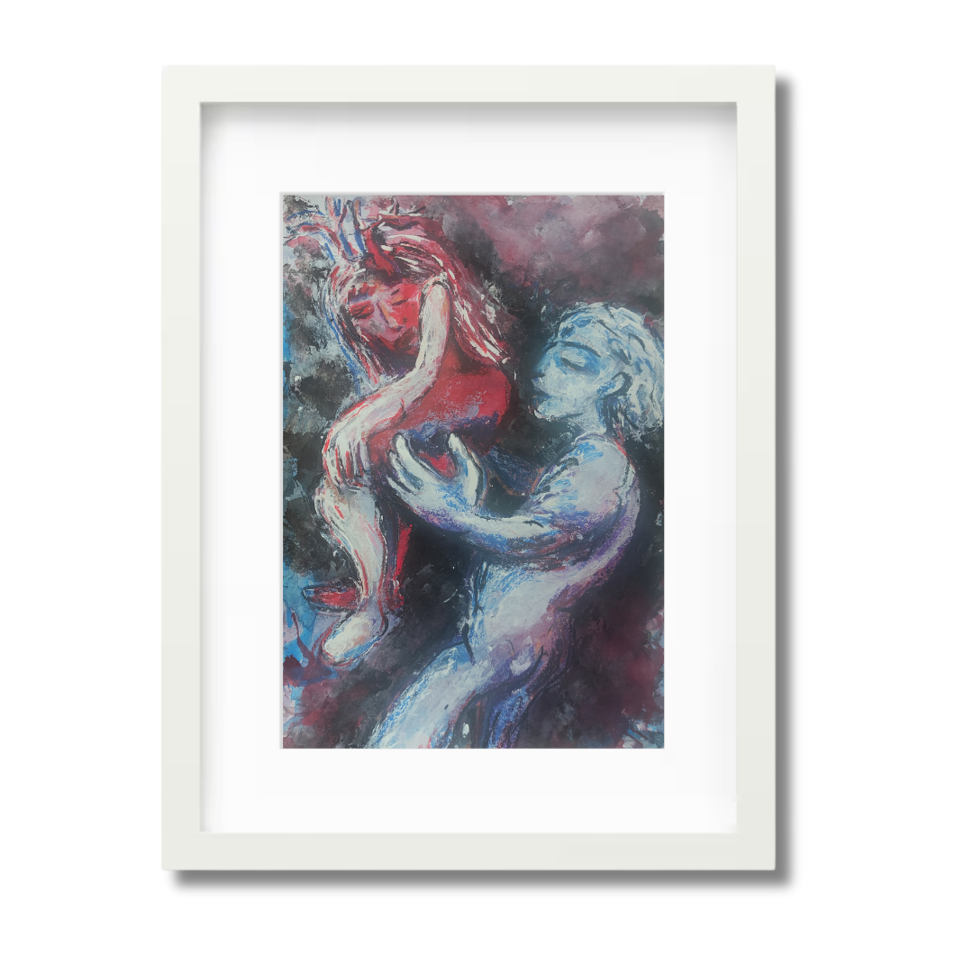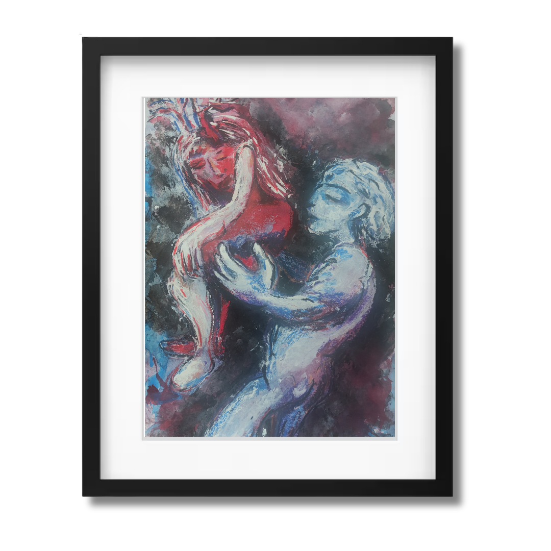 An intimate and emotive composition, Hold Me explores the vulnerability and strength of human connection. Rendered in expressive strokes and deep, moody tones, the original acrylic painting evokes tenderness and emotional depth through intertwined figures bathed in contrasting hues of red and blue. This piece brings powerful visual storytelling to any personal or contemplative space.
