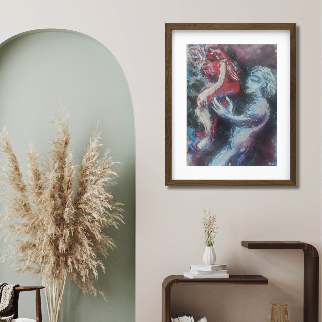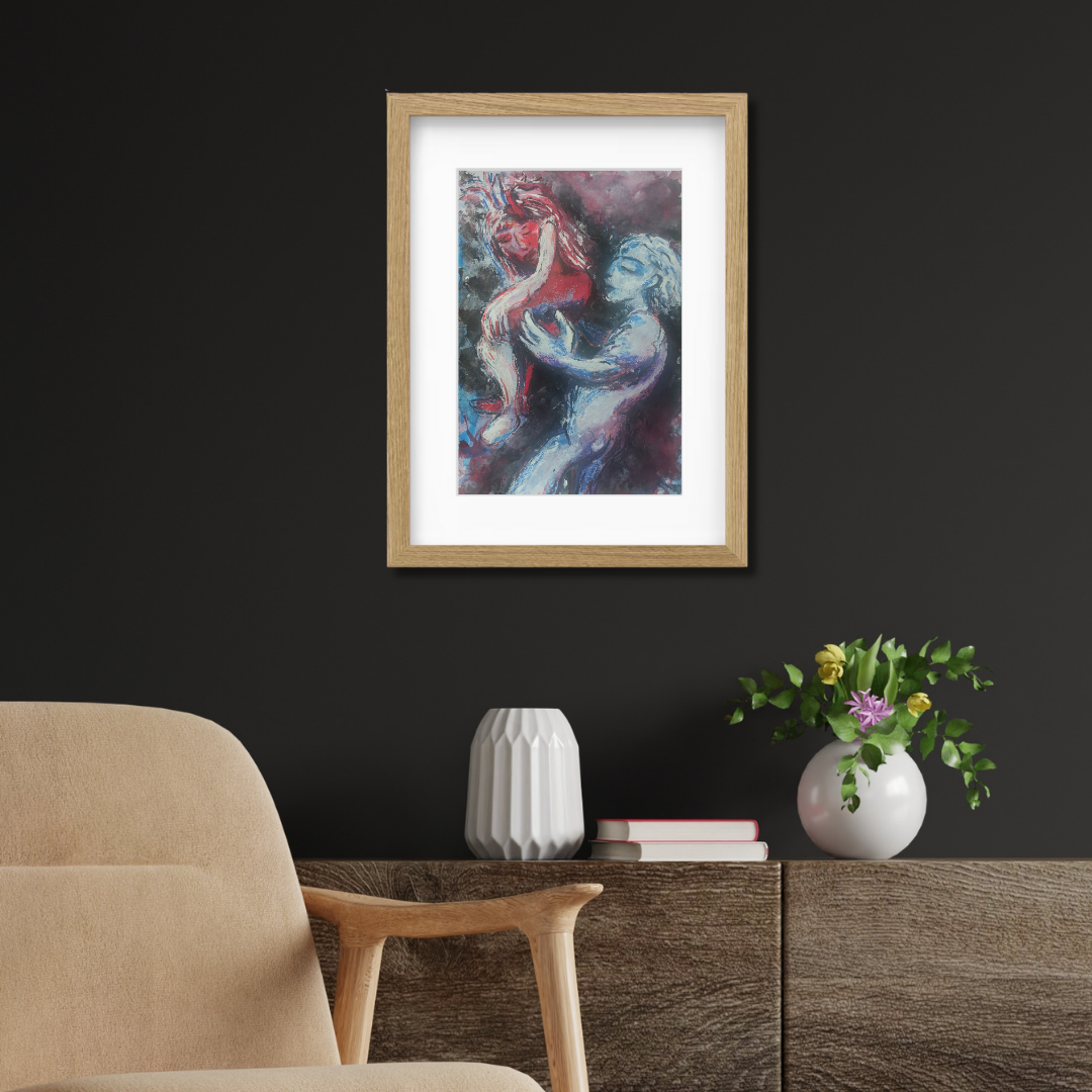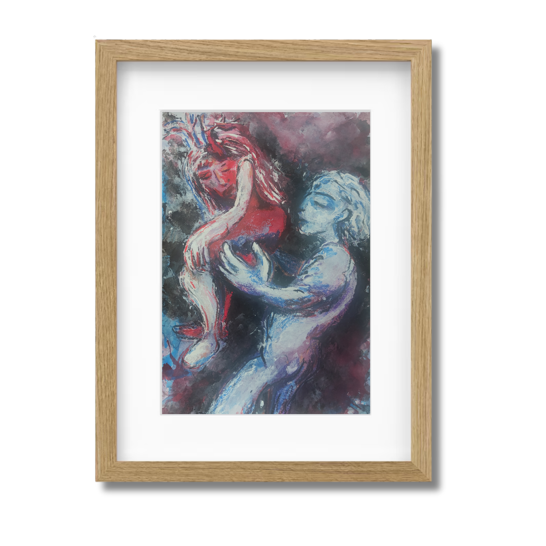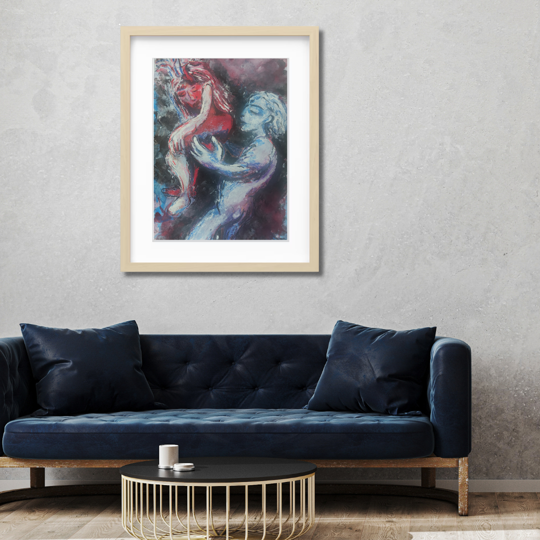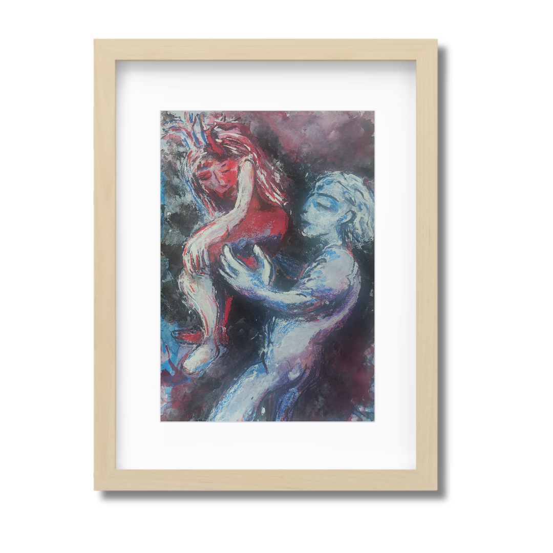 An intimate and emotive composition, Hold Me explores the vulnerability and strength of human connection. Rendered in expressive strokes and deep, moody tones, the original acrylic painting evokes tenderness and emotional depth through intertwined figures bathed in contrasting hues of red and blue. This piece brings powerful visual storytelling to any personal or contemplative space.