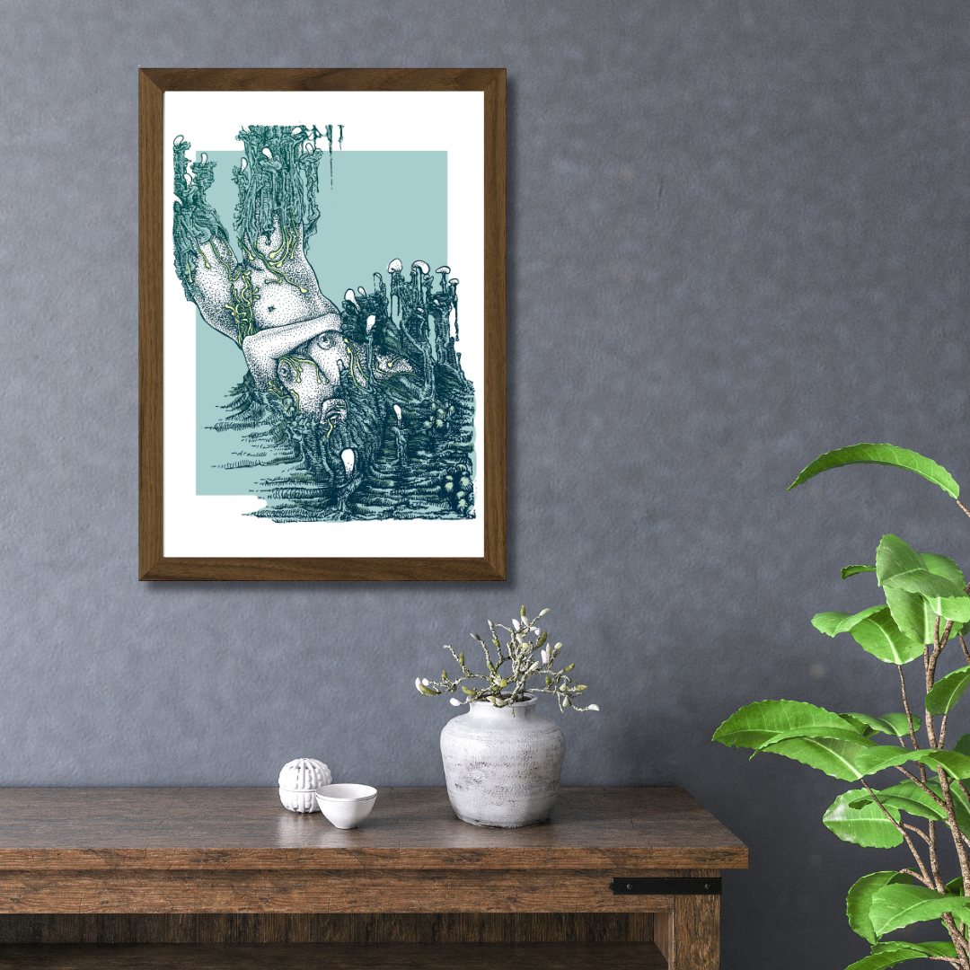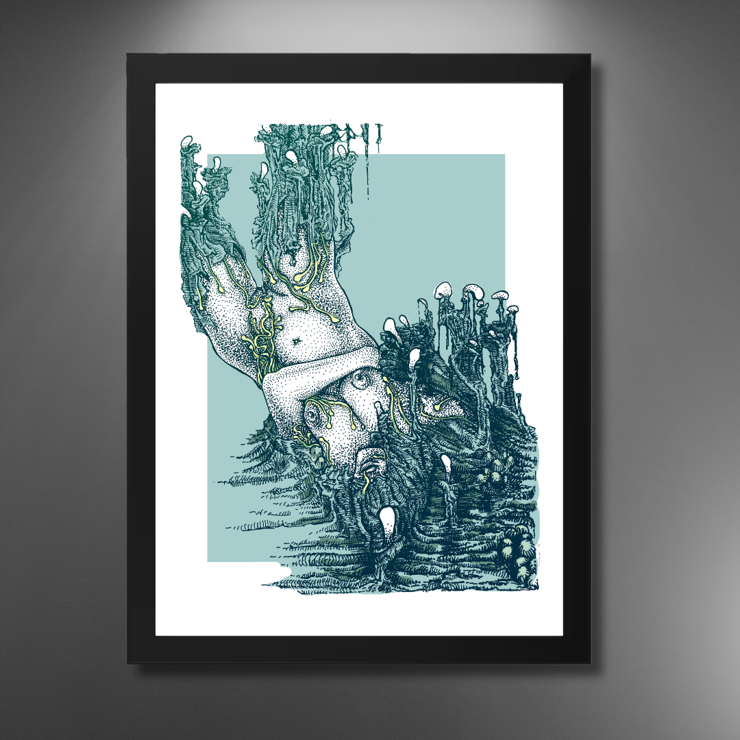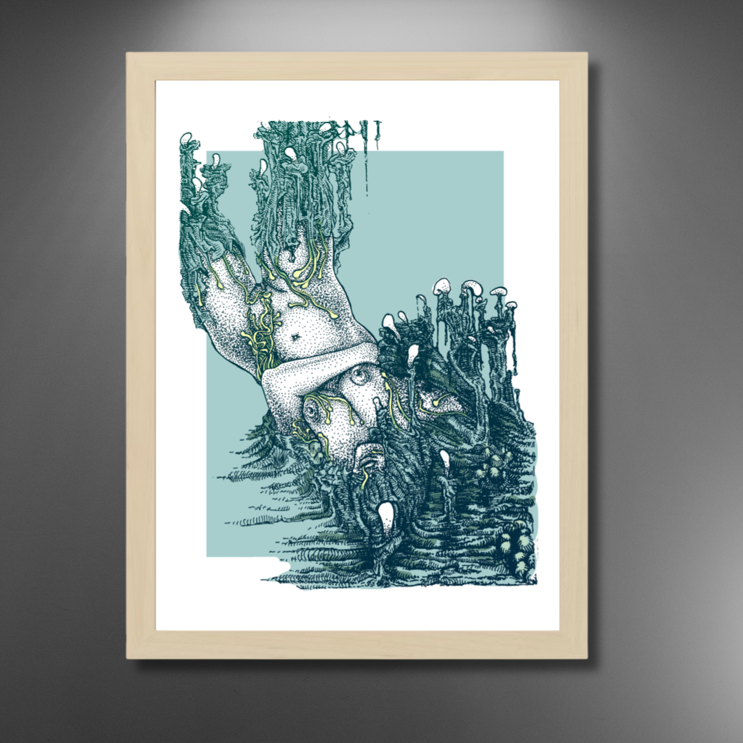 Merging surrealism and human form, In the Embrace of Objectivisation explores the delicate tension between identity, vulnerability, and transformation. Lukas Nosek’s intricate penwork and acrylic detail weave an organic, almost otherworldly figure-one that seems to both dissolve and emerge from its surroundings. The result is a hypnotic visual meditation on body and perception.