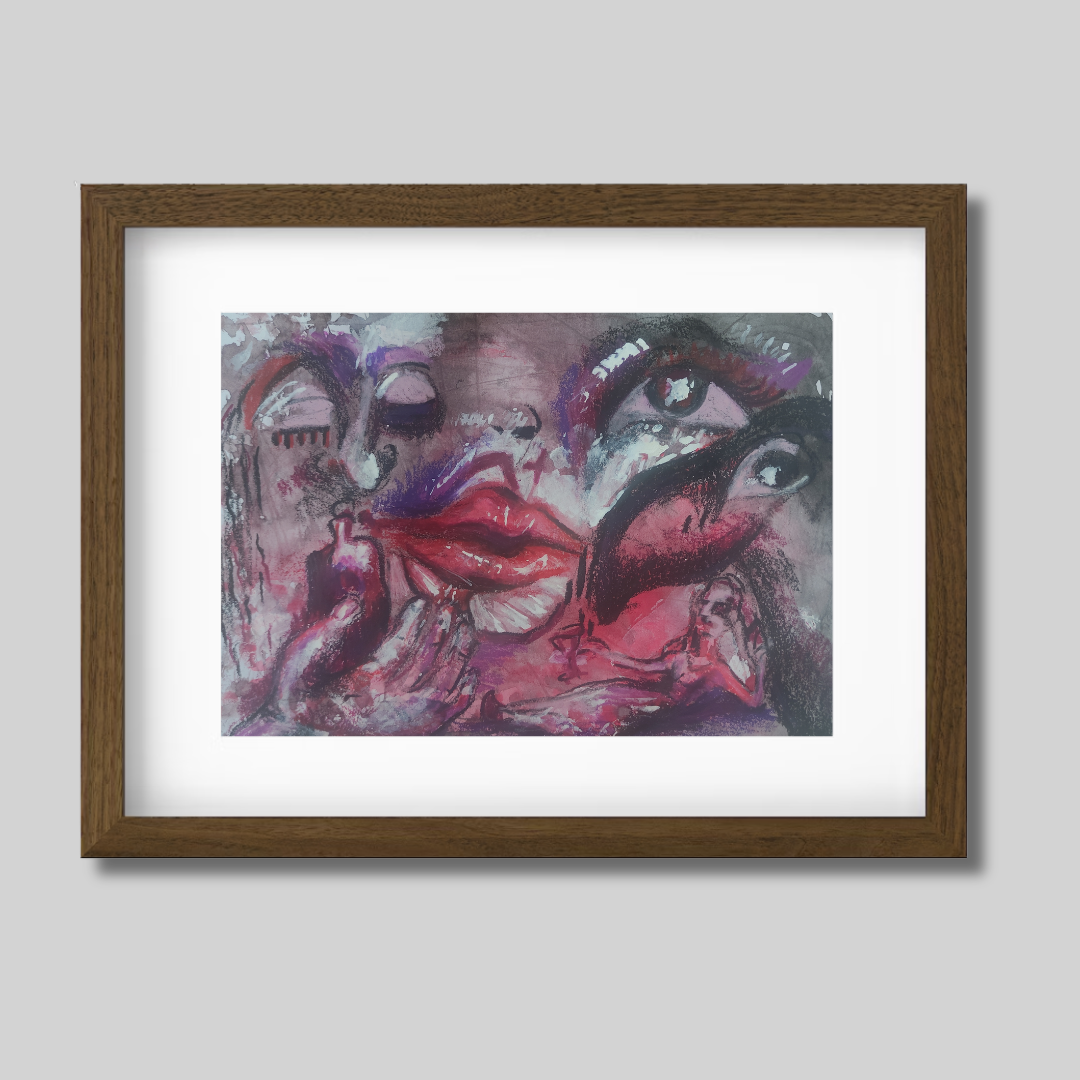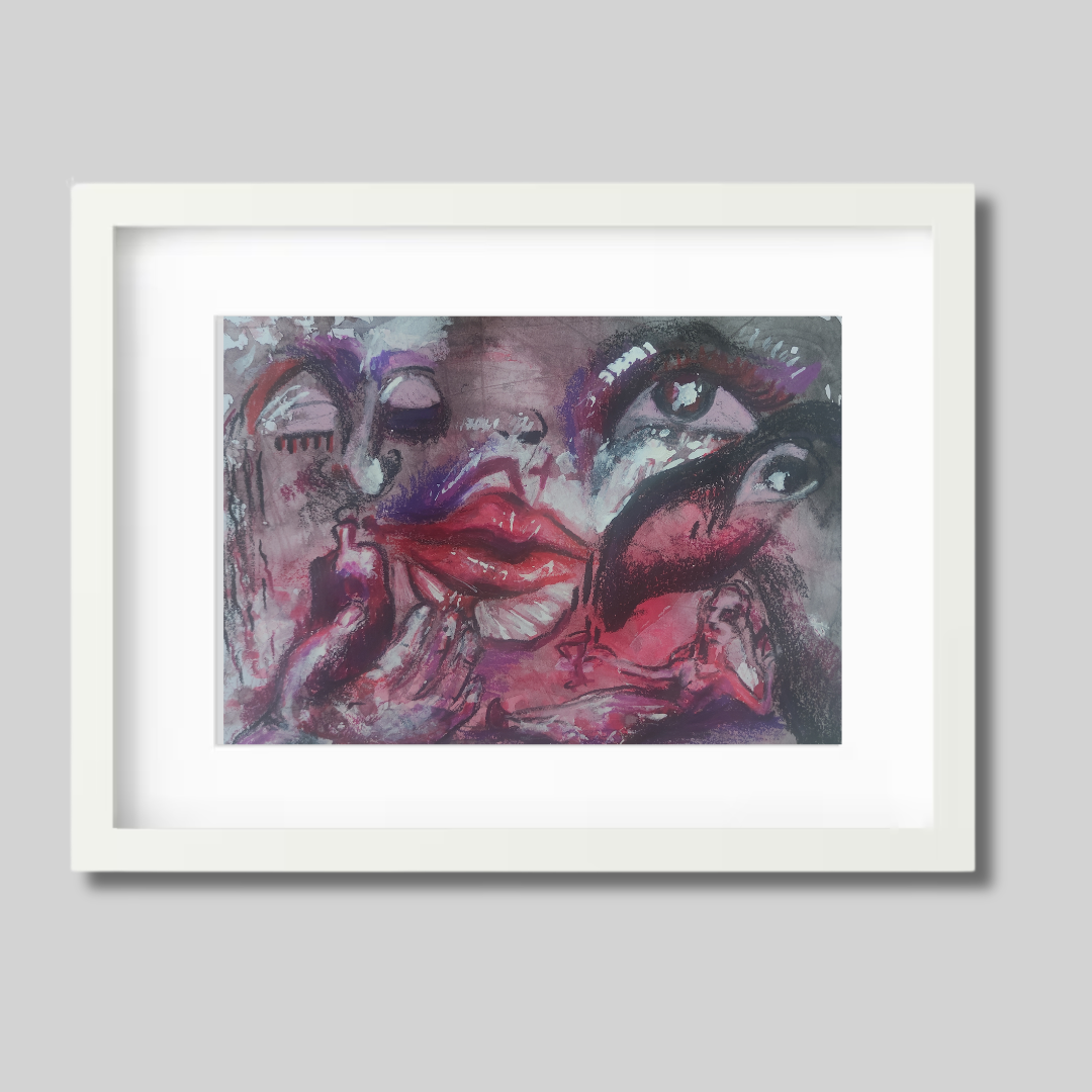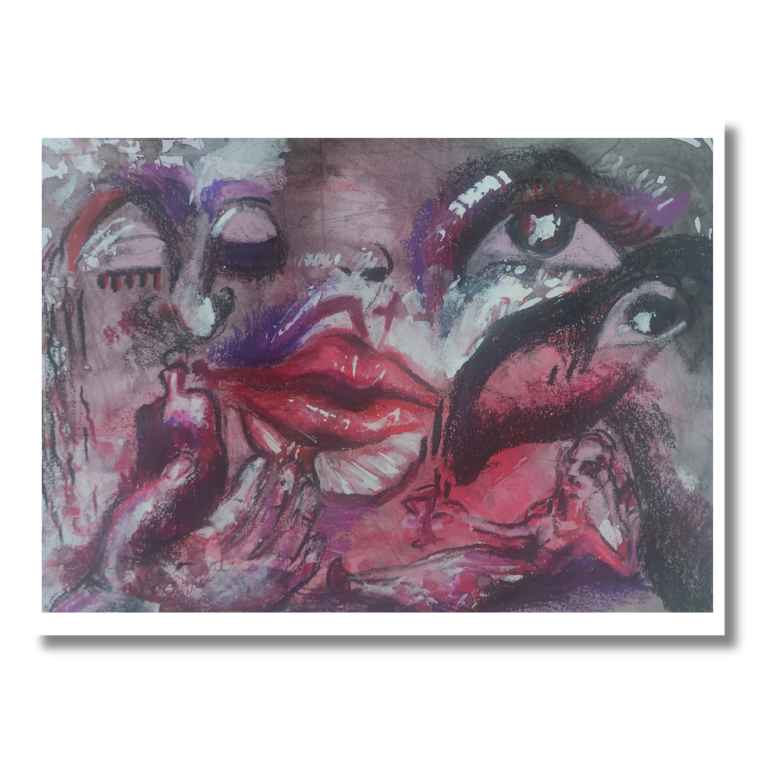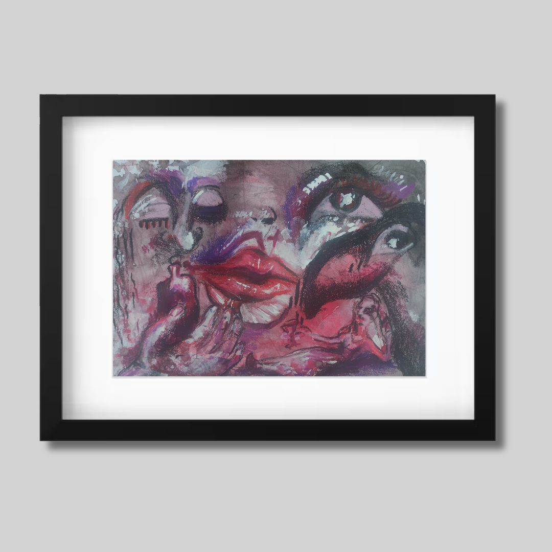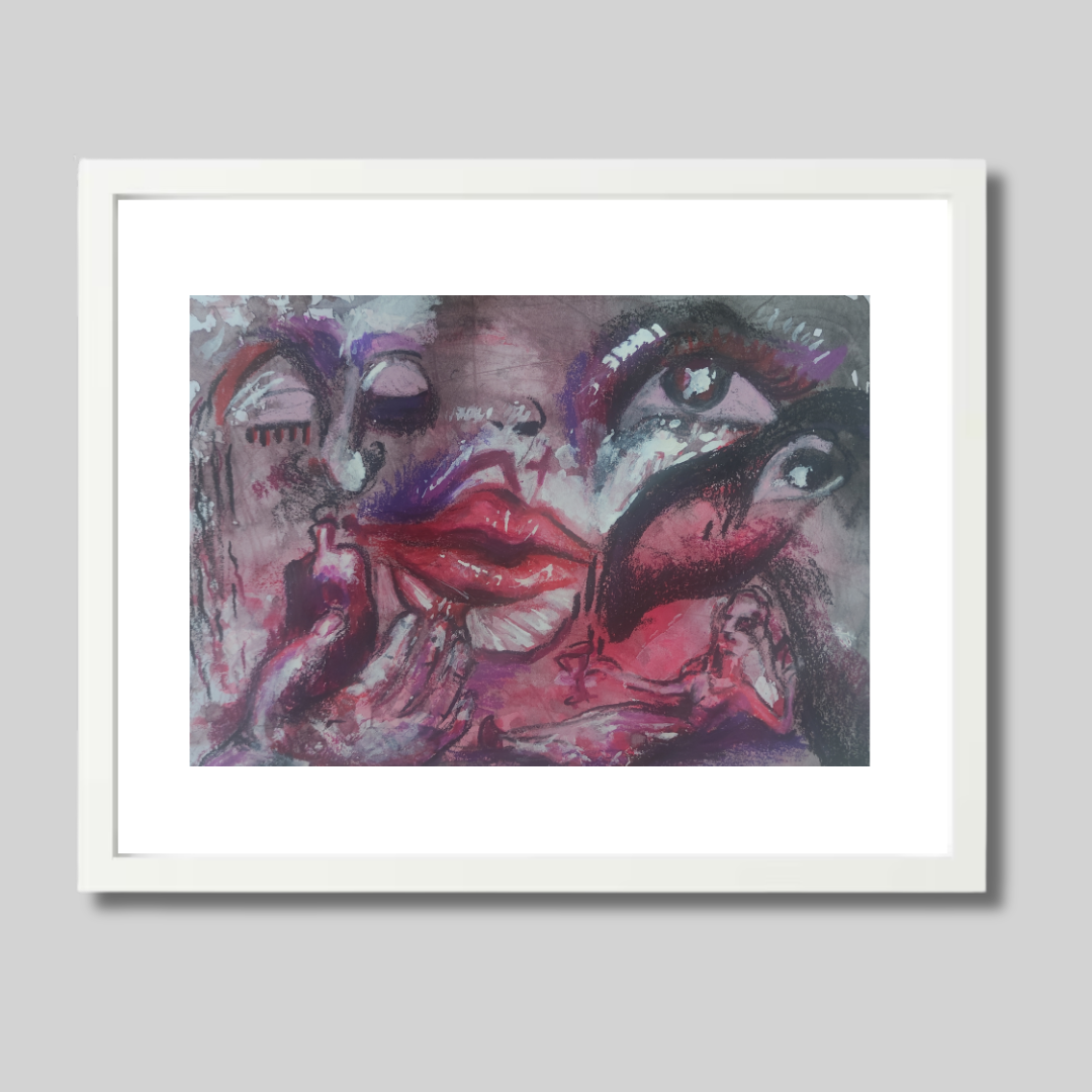 A fevered memory rendered in crimson and shadow, Last Night unfolds like a whispered confession. Faces melt into one another—soft, surreal, and unguarded—blurring the lines between passion, vulnerability, and dream. With ink and oil pastel as her medium, Ayda Pakzad Afshar creates a visceral intimacy that lingers.