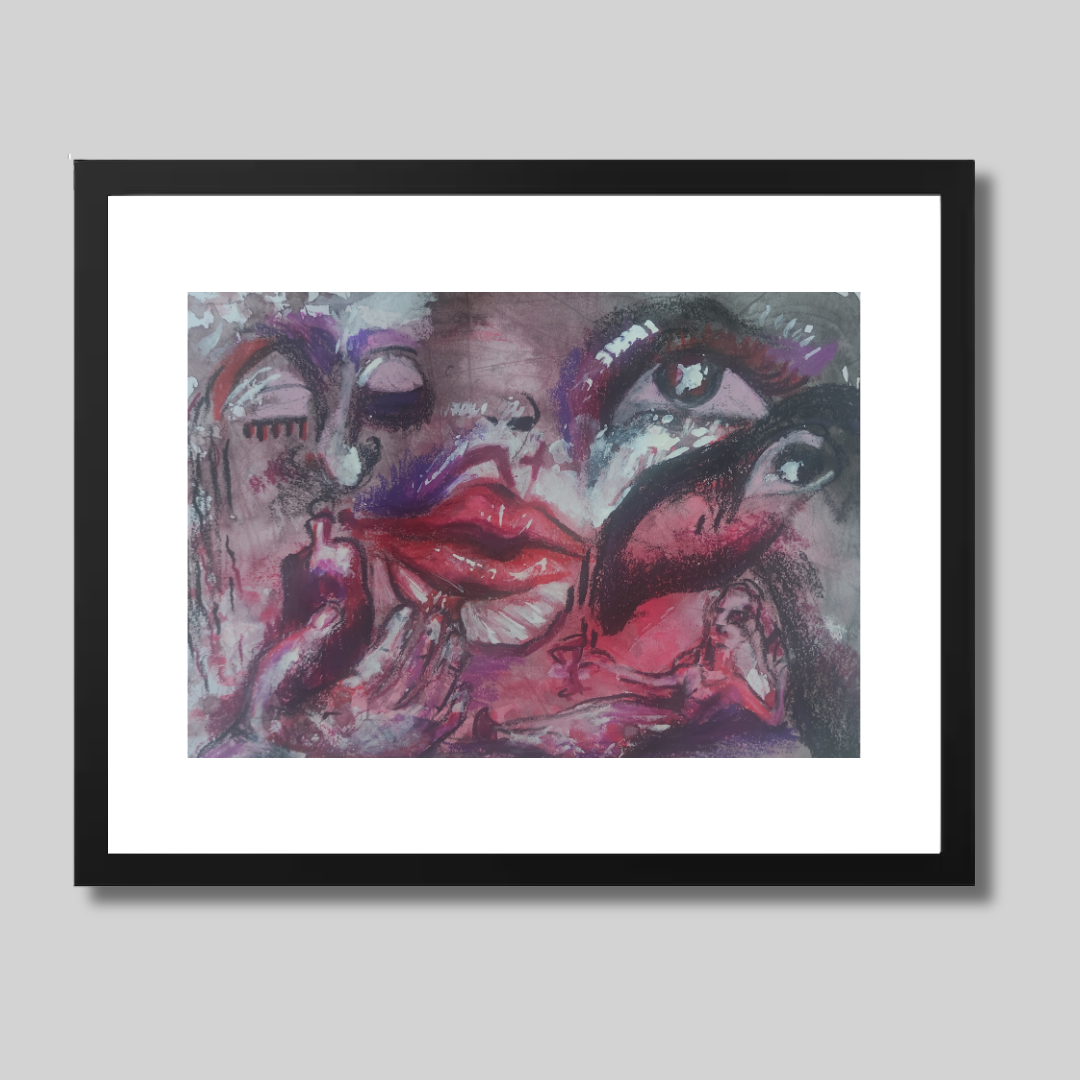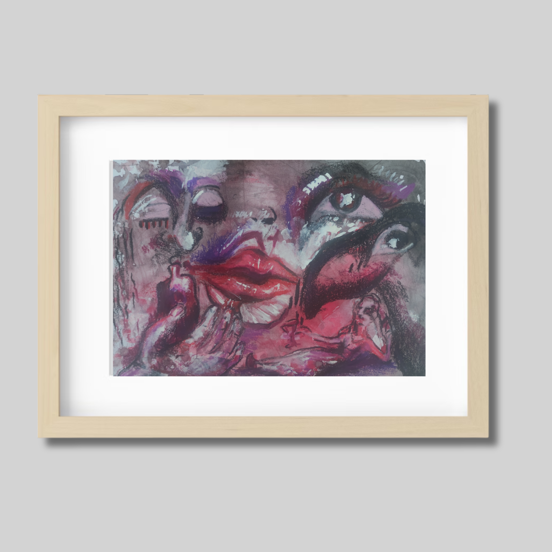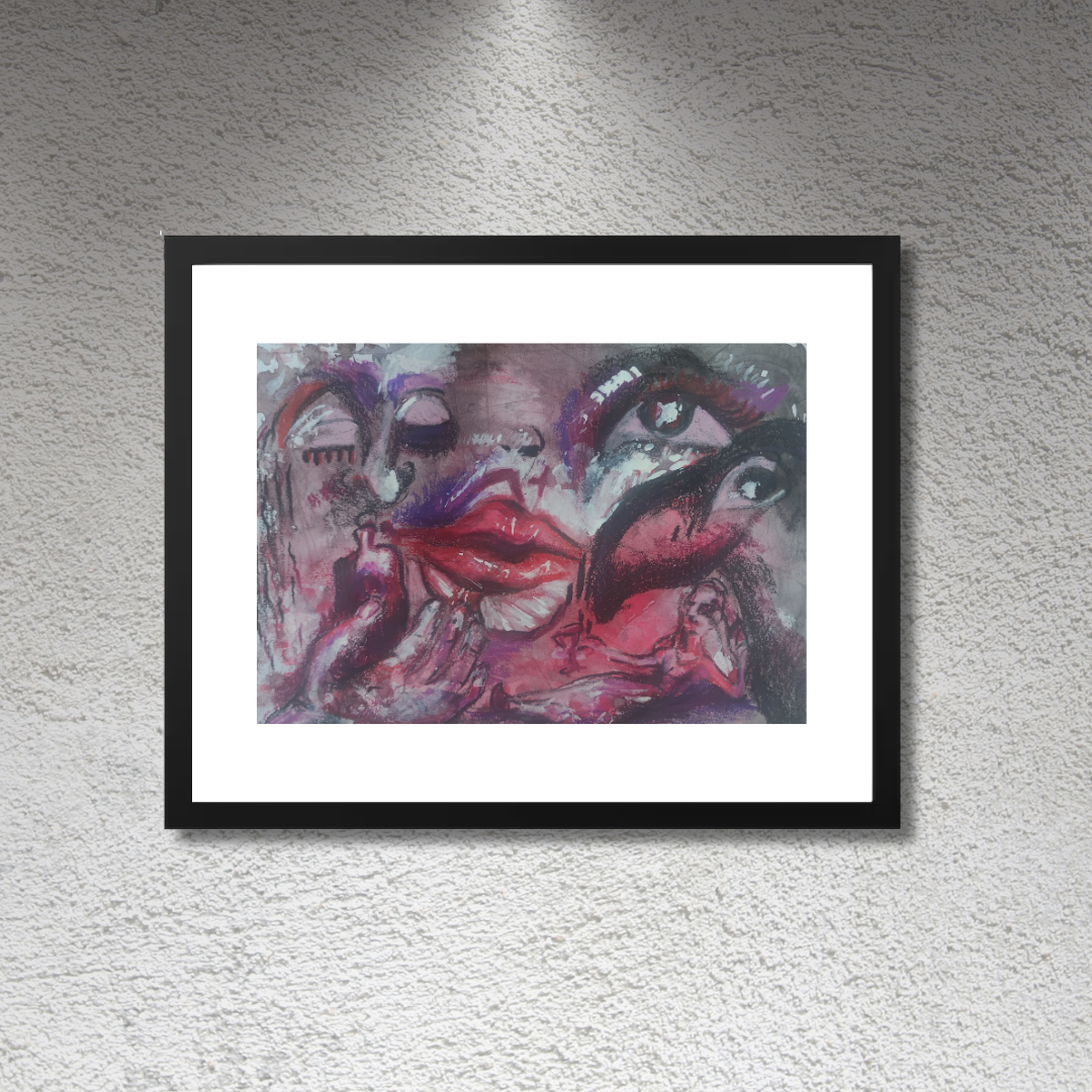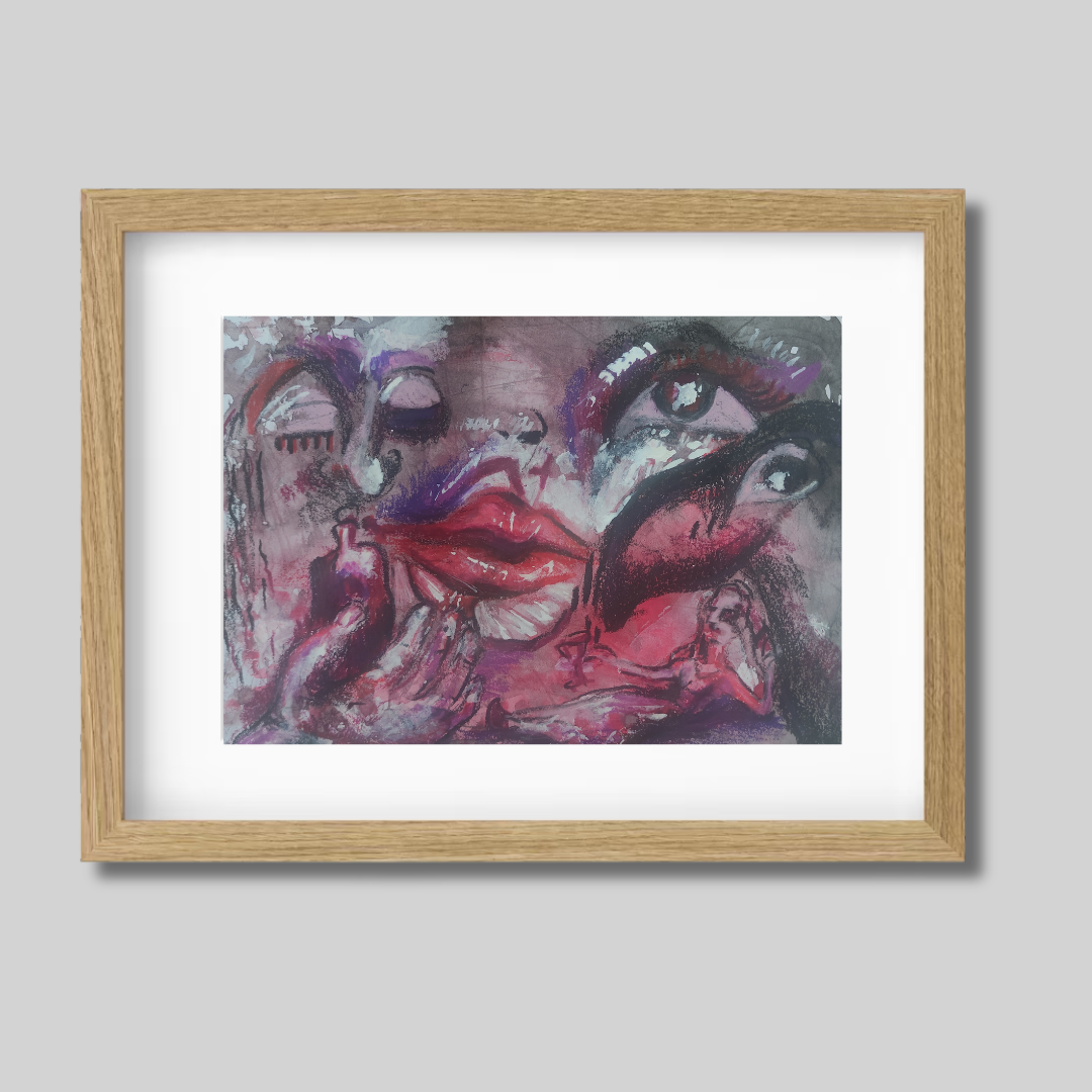 A fevered memory rendered in crimson and shadow, Last Night unfolds like a whispered confession. Faces melt into one another—soft, surreal, and unguarded—blurring the lines between passion, vulnerability, and dream. With ink and oil pastel as her medium, Ayda Pakzad Afshar creates a visceral intimacy that lingers.