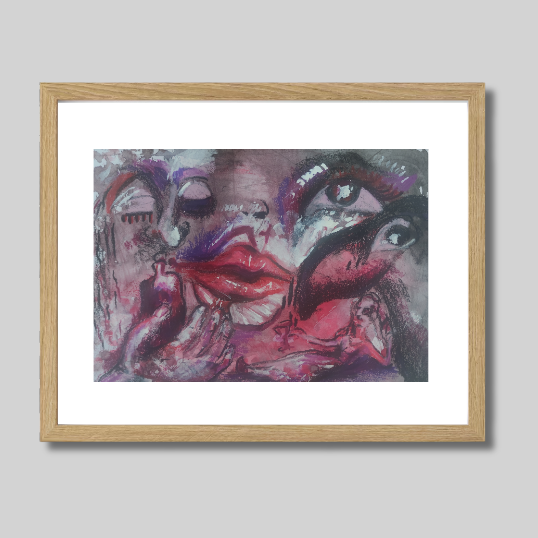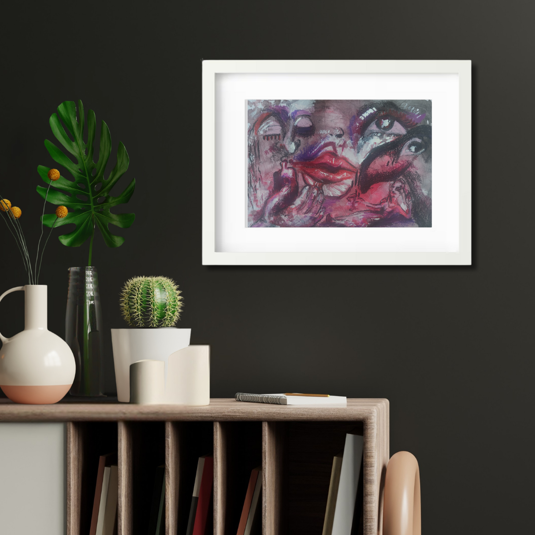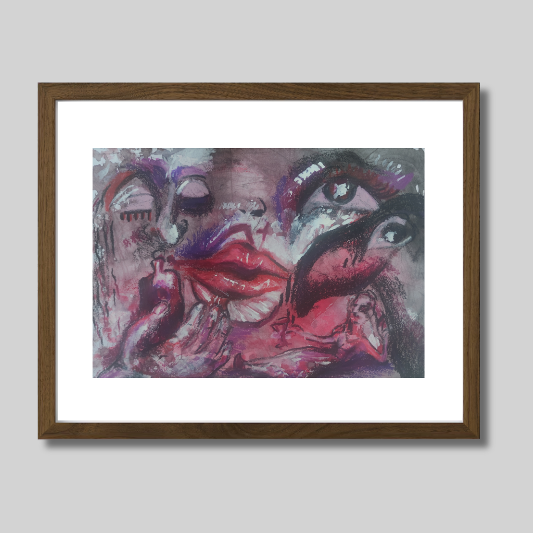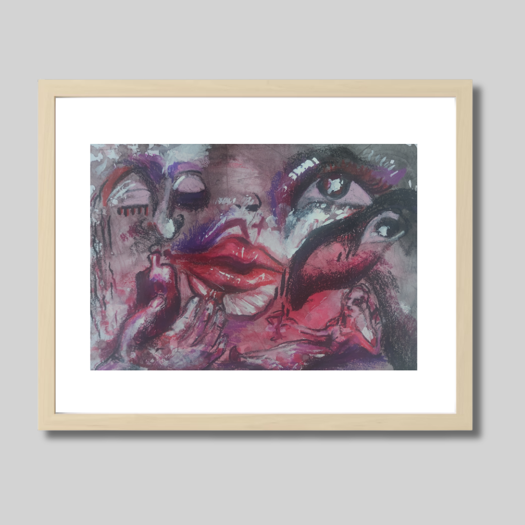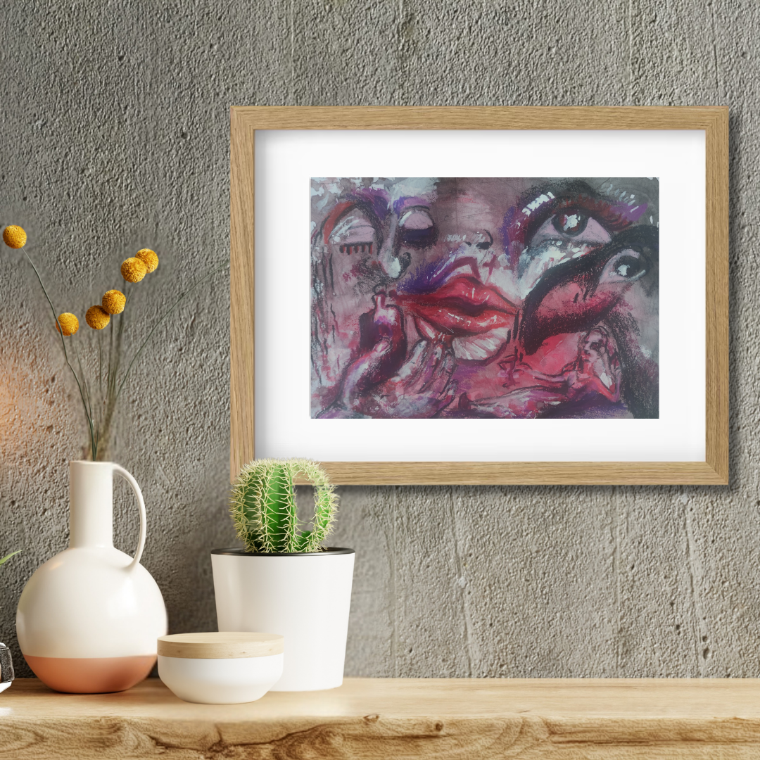 A fevered memory rendered in crimson and shadow, Last Night unfolds like a whispered confession. Faces melt into one another—soft, surreal, and unguarded—blurring the lines between passion, vulnerability, and dream. With ink and oil pastel as her medium, Ayda Pakzad Afshar creates a visceral intimacy that lingers.