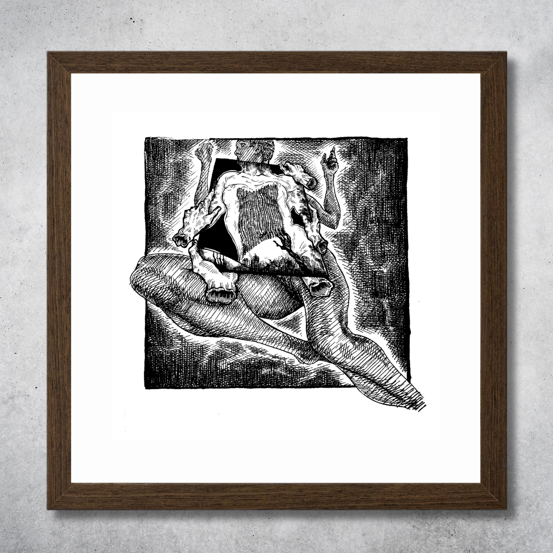 Exploring the dualities of control and surrender, Masochismus captures the tension between vulnerability and power through stark, anatomical precision. Lukas Nosek’s pen and acrylic marker technique reveals a fragmented human form—distorted yet composed, expressive yet restrained. The artwork becomes a psychological mirror, inviting viewers to confront the boundaries of body and emotion.