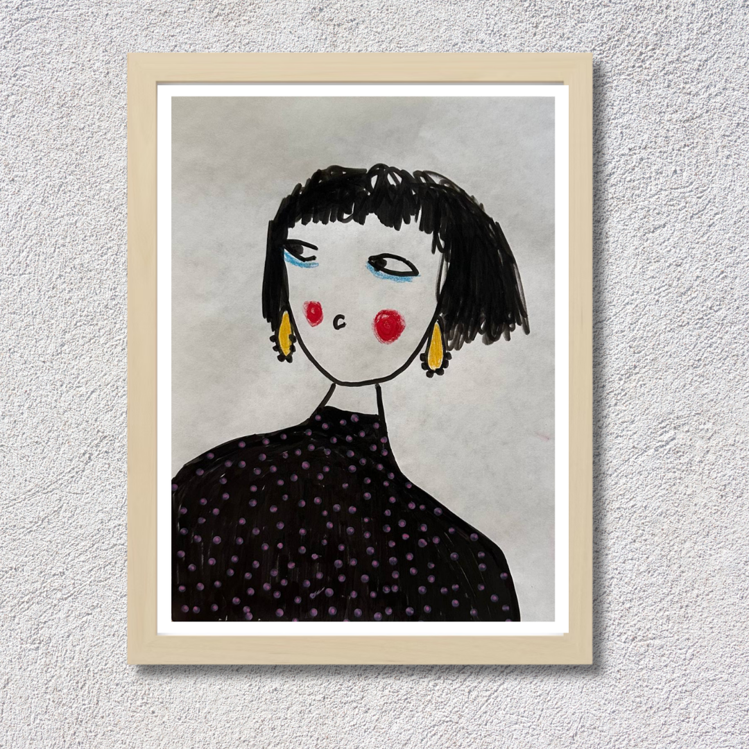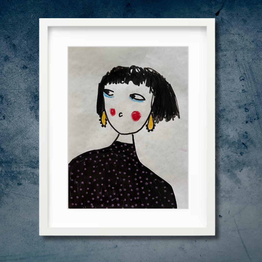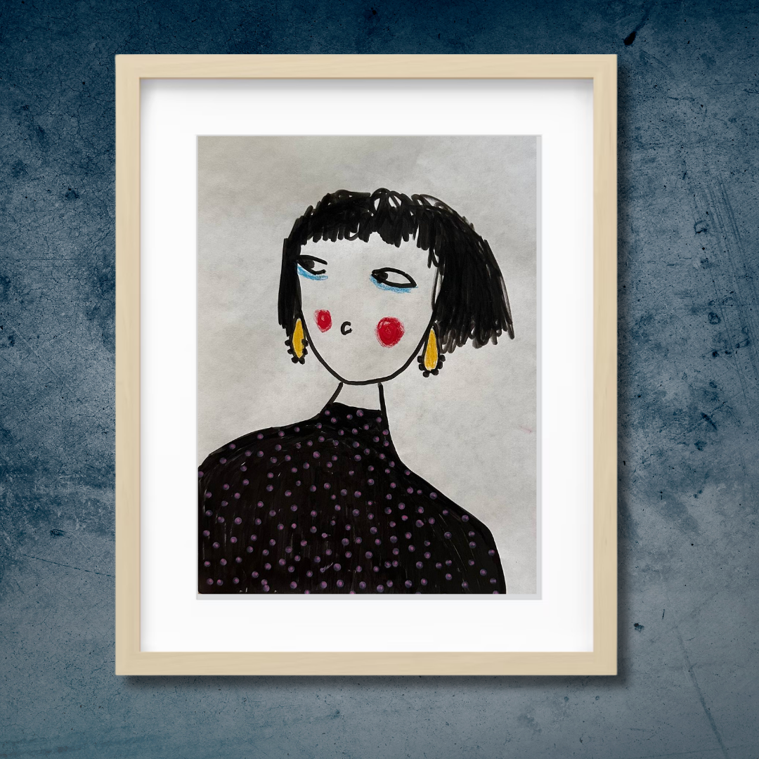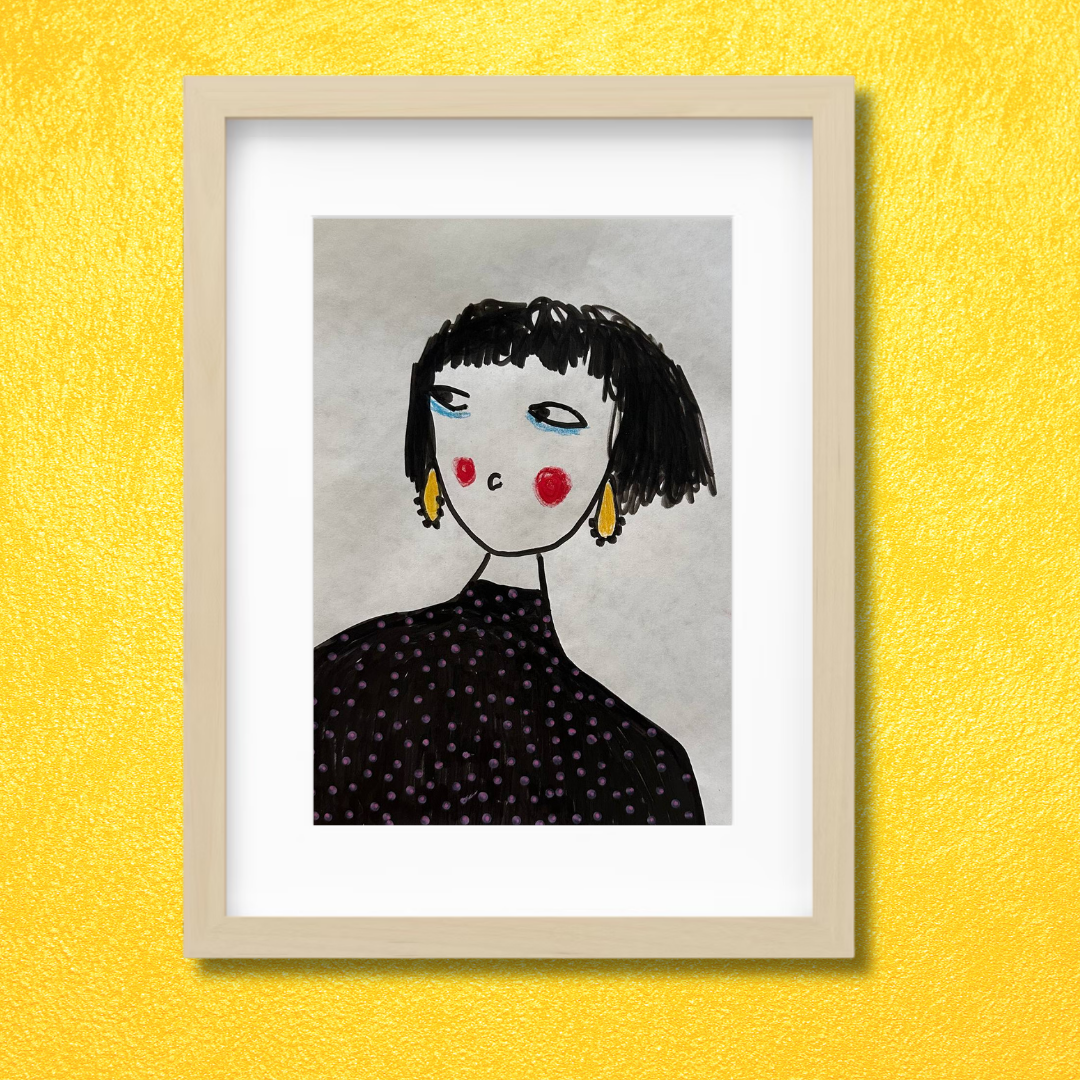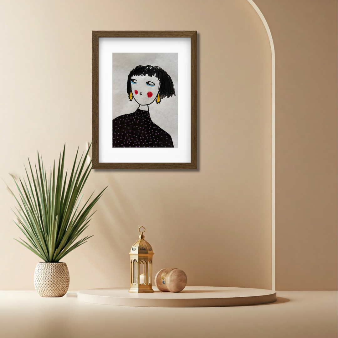 Celebrate personal style and character with this whimsical portrait by Azam Mahdavi. “My Earrings” features a stylized figure with expressive eyes, bright red cheeks, and oversized yellow earrings—all painted in bold, minimal strokes. With its hand-drawn charm and modern fashion twist, this fine art print adds personality and playfulness to any wall.