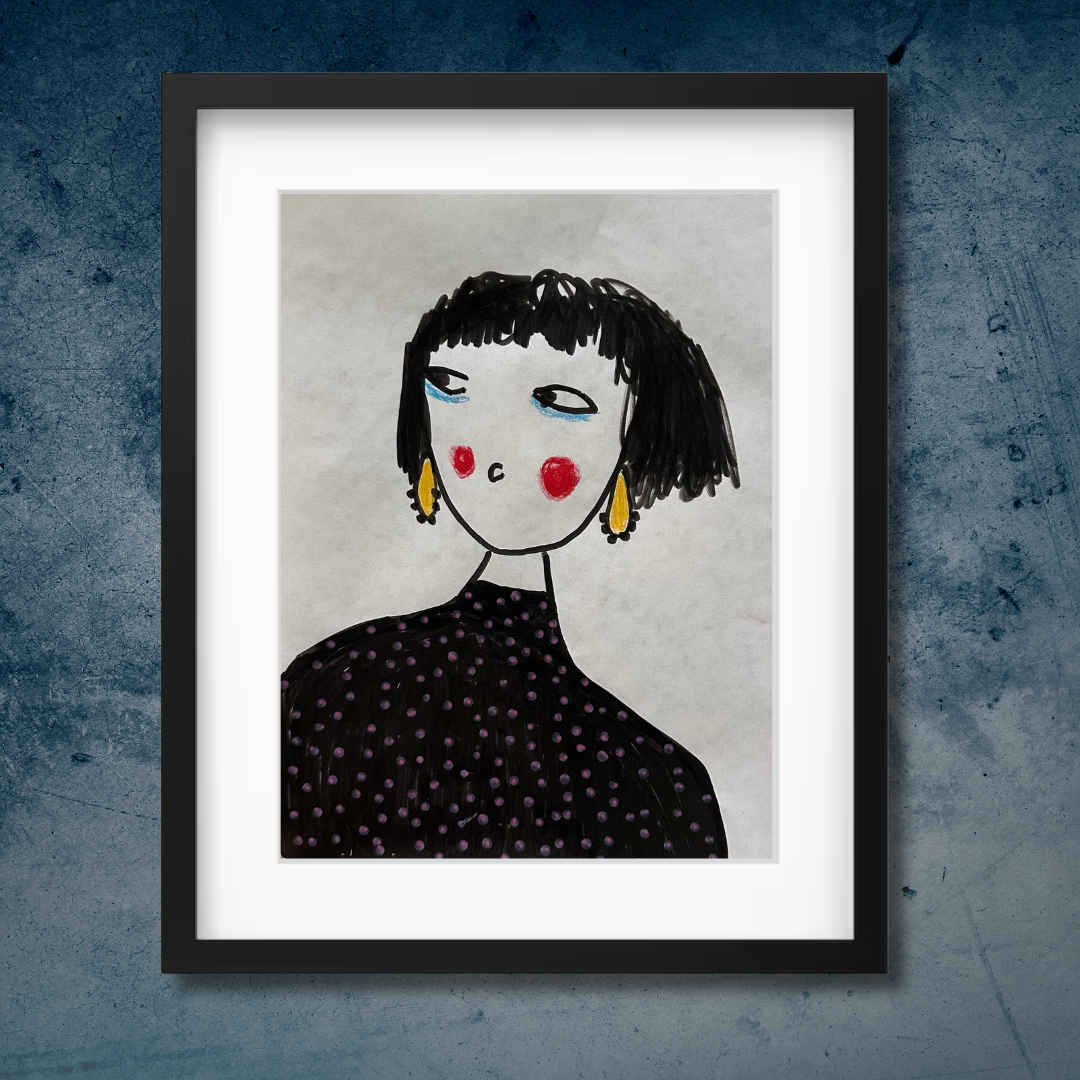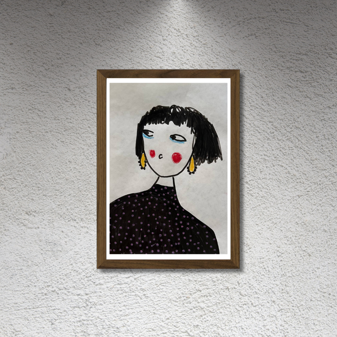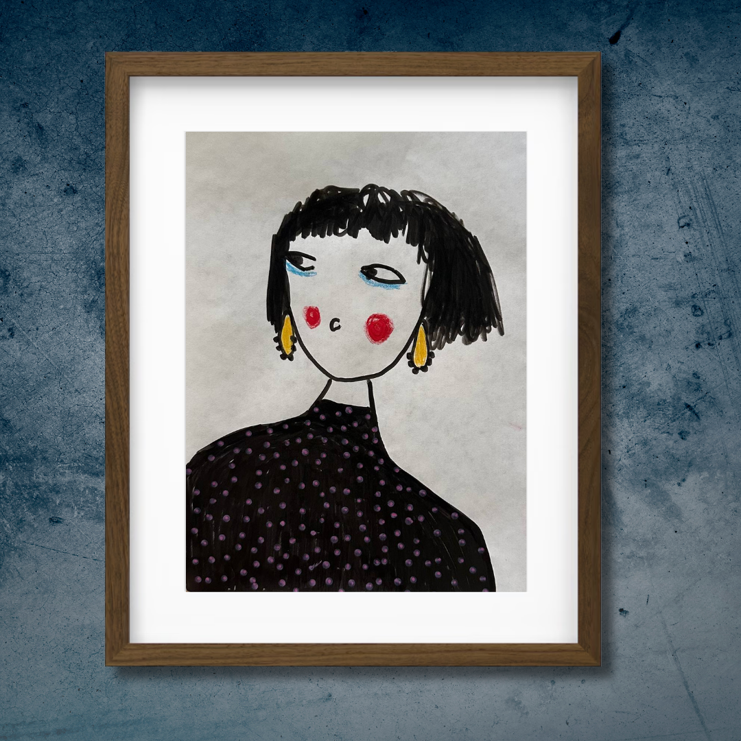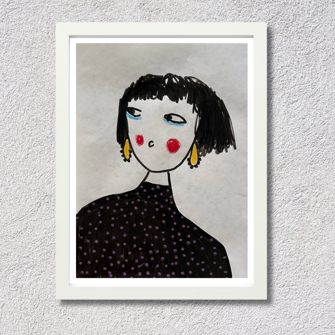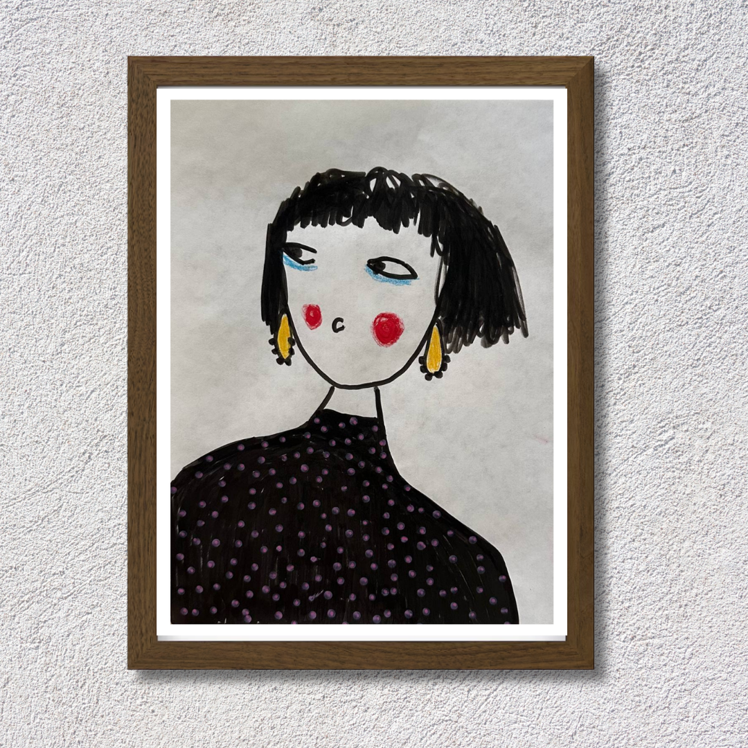 Celebrate personal style and character with this whimsical portrait by Azam Mahdavi. “My Earrings” features a stylized figure with expressive eyes, bright red cheeks, and oversized yellow earrings—all painted in bold, minimal strokes. With its hand-drawn charm and modern fashion twist, this fine art print adds personality and playfulness to any wall.