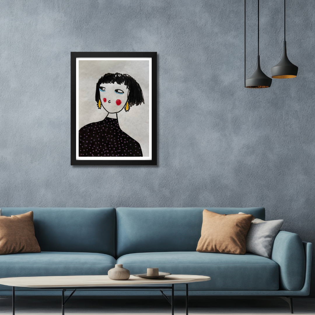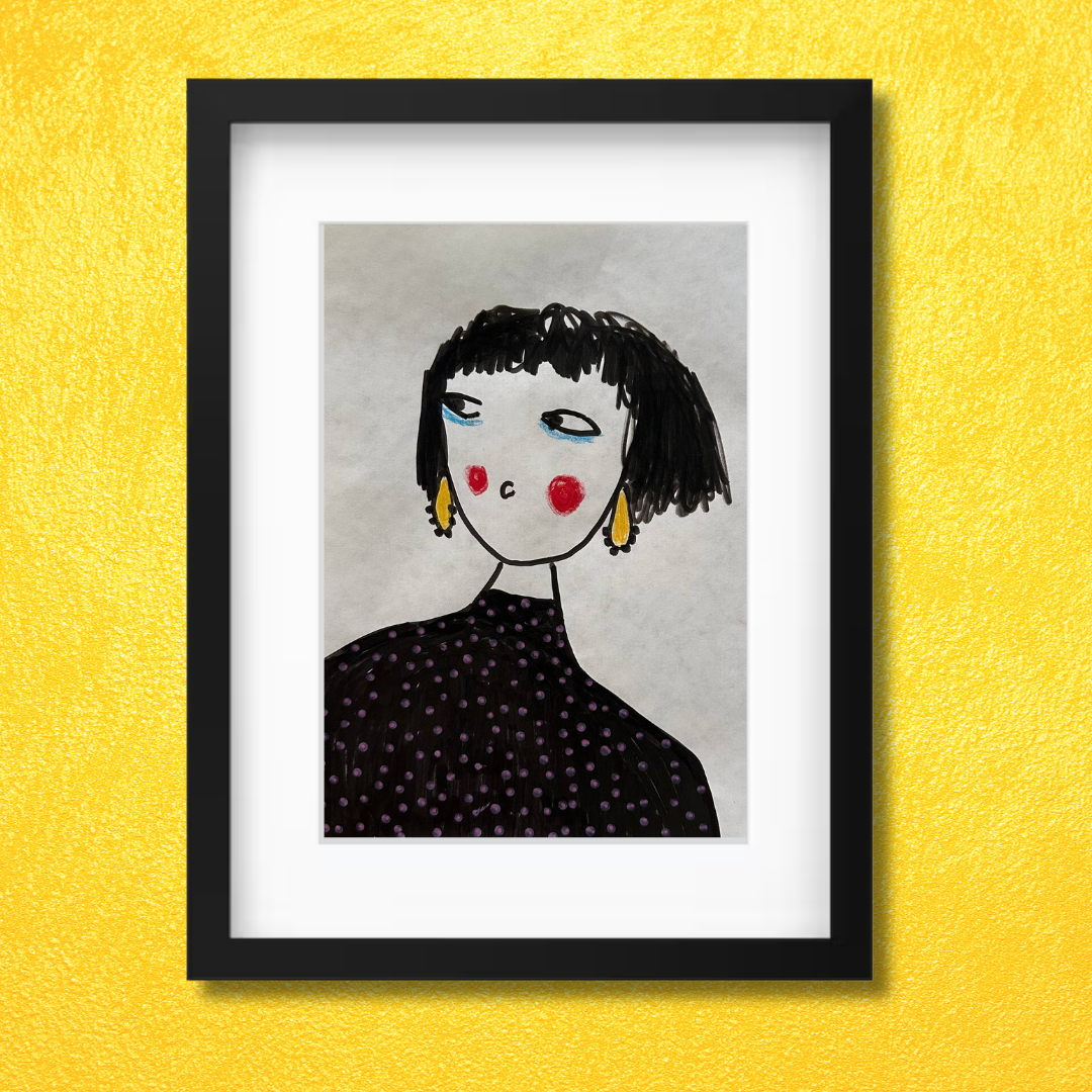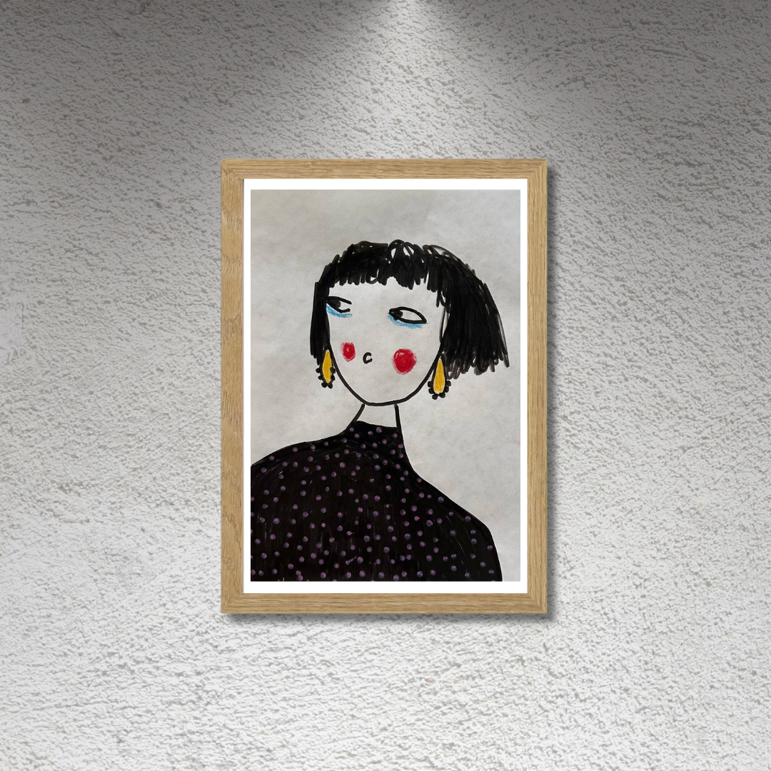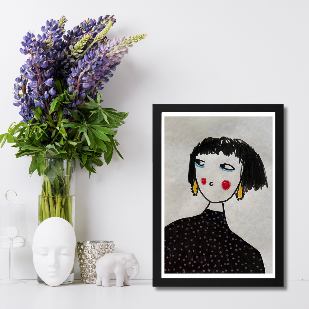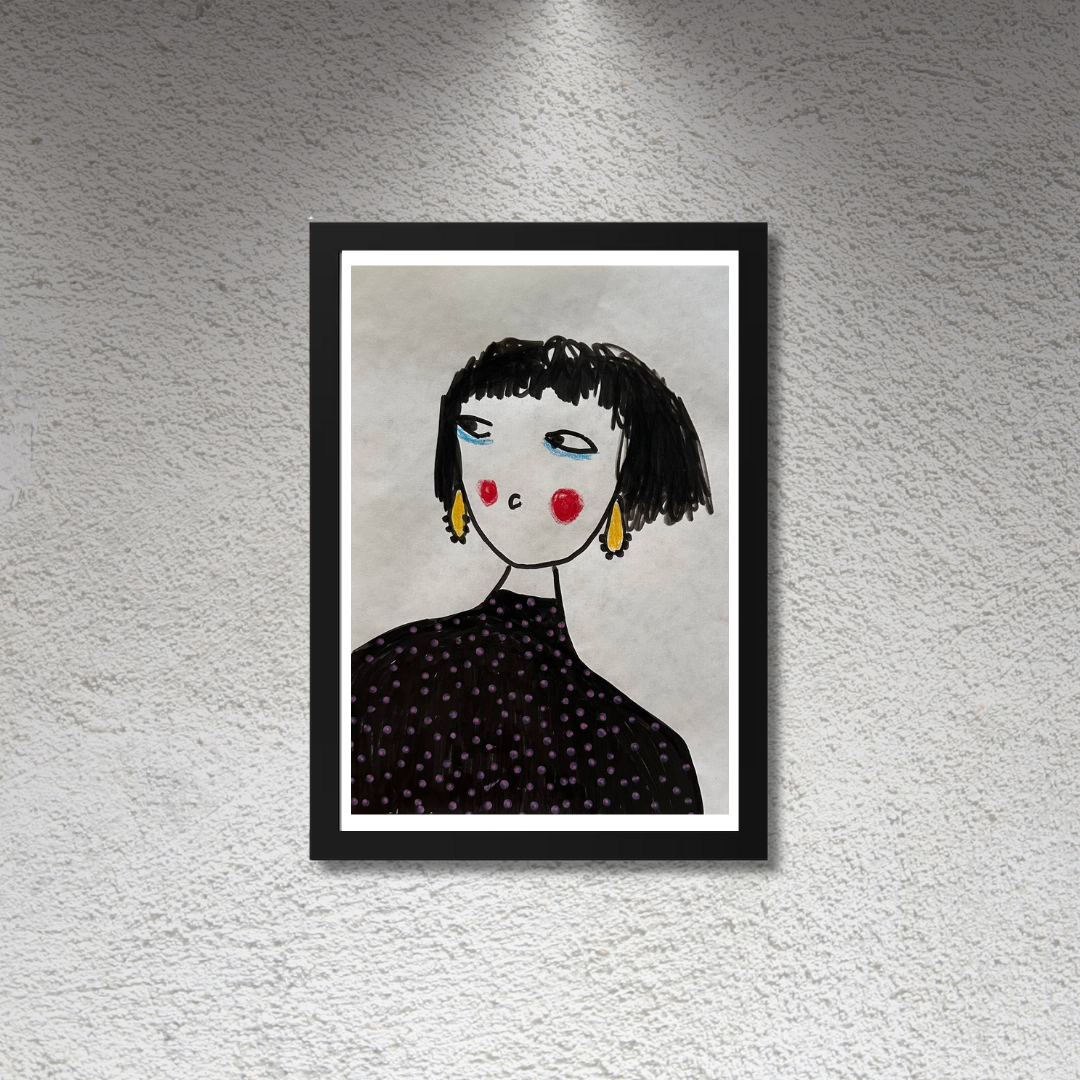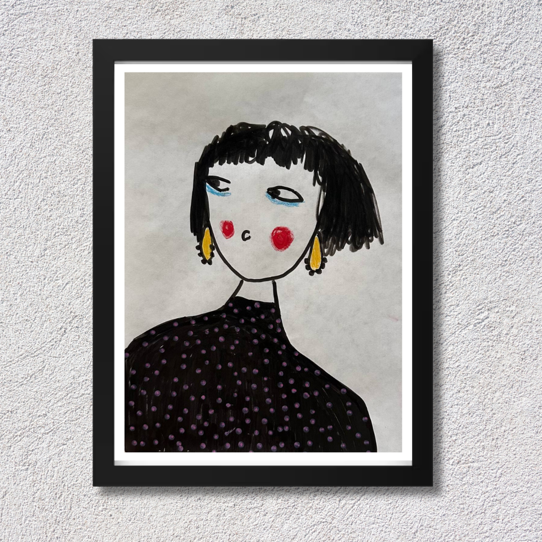 Celebrate personal style and character with this whimsical portrait by Azam Mahdavi. “My Earrings” features a stylized figure with expressive eyes, bright red cheeks, and oversized yellow earrings—all painted in bold, minimal strokes. With its hand-drawn charm and modern fashion twist, this fine art print adds personality and playfulness to any wall.