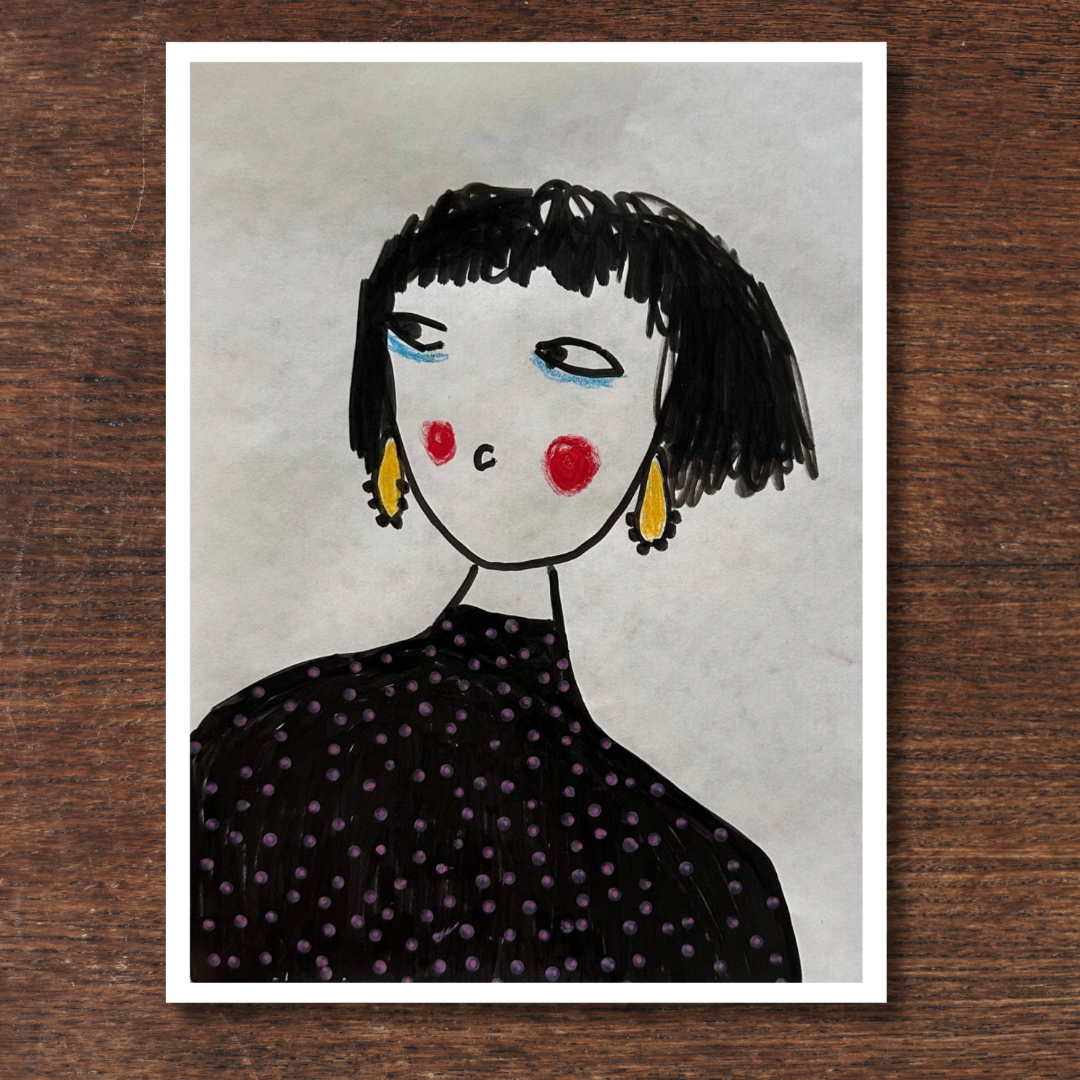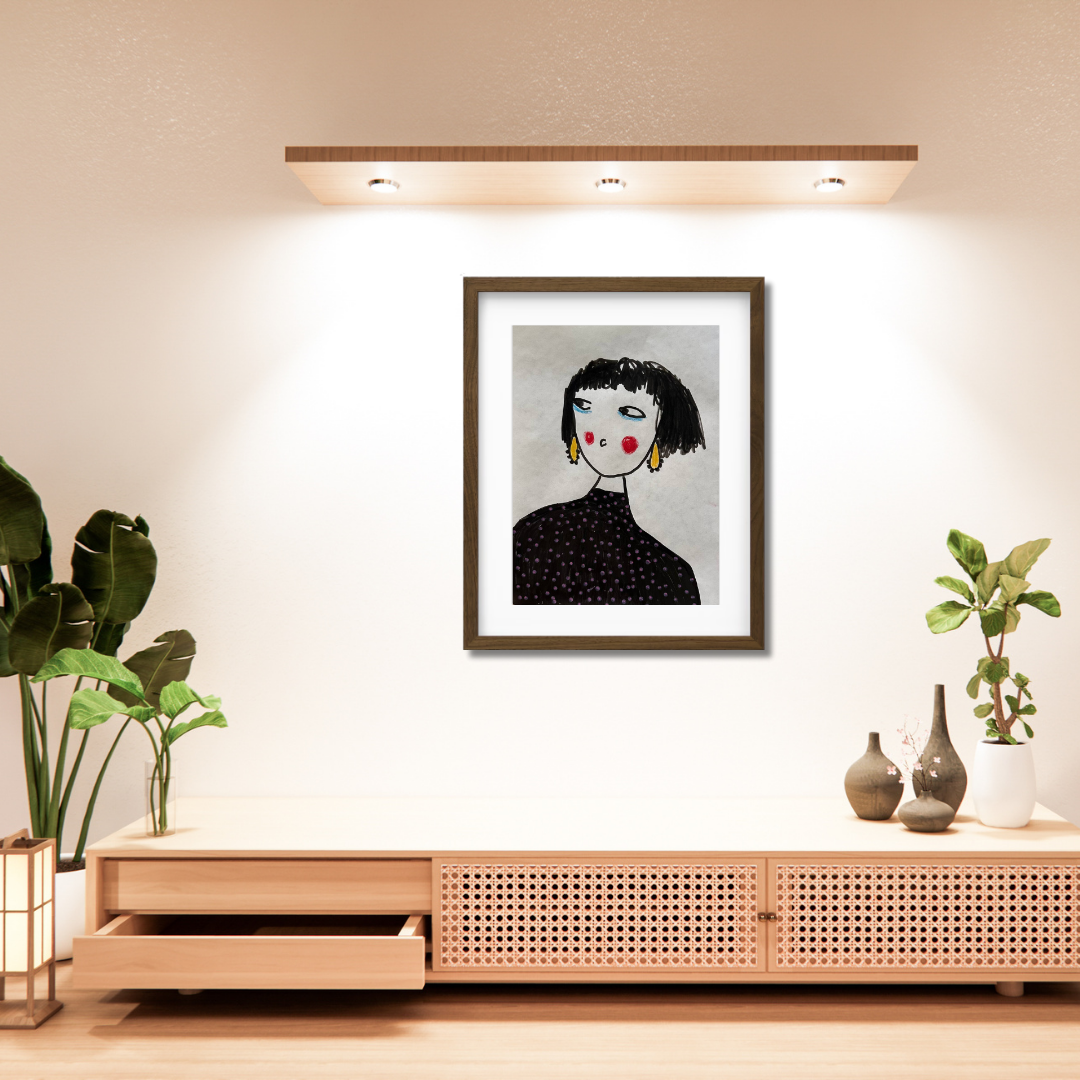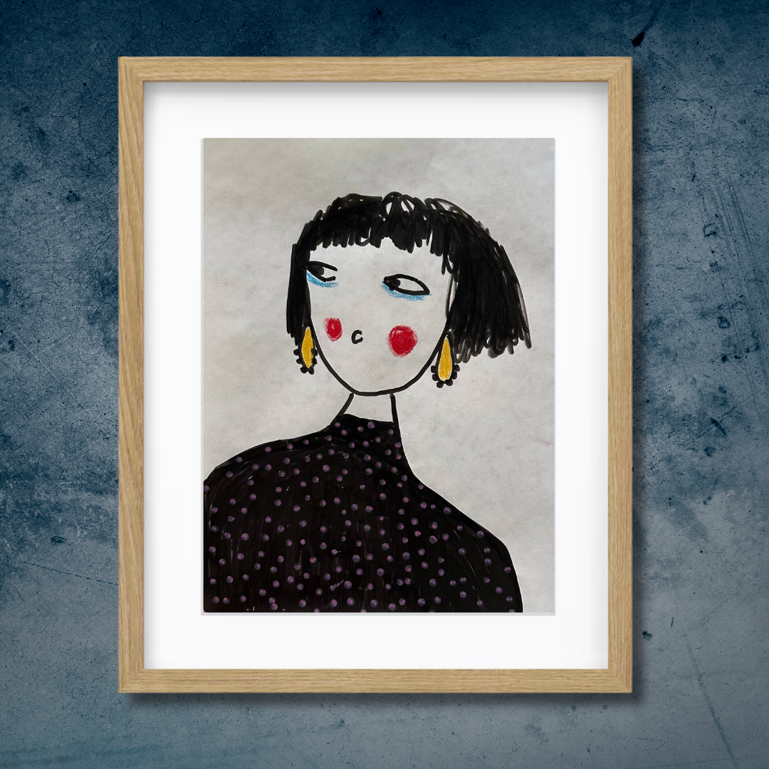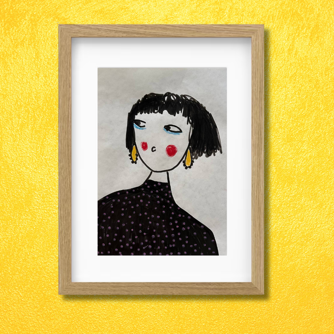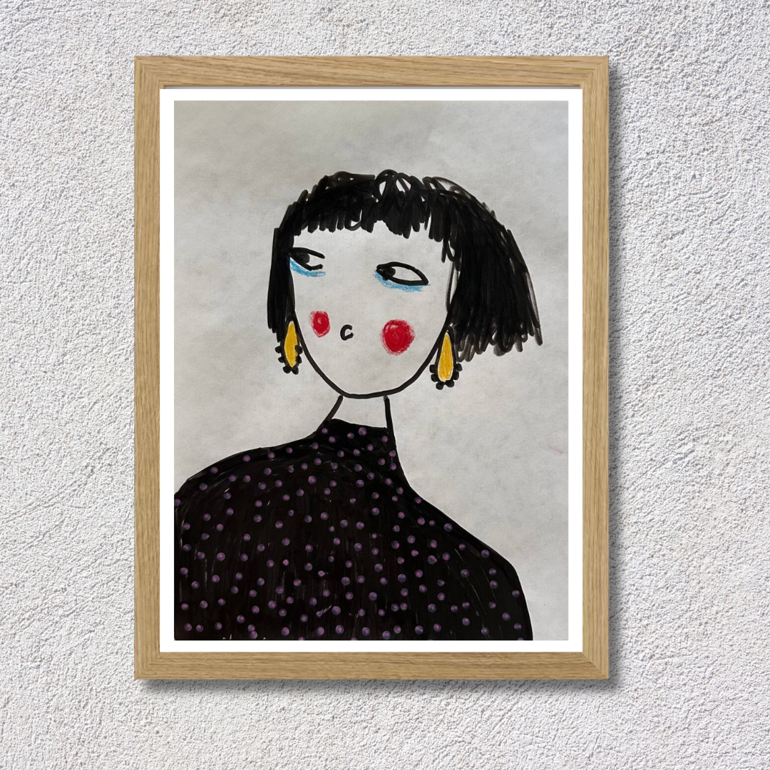Celebrate personal style and character with this whimsical portrait by Azam Mahdavi. “My Earrings” features a stylized figure with expressive eyes, bright red cheeks, and oversized yellow earrings—all painted in bold, minimal strokes. With its hand-drawn charm and modern fashion twist, this fine art print adds personality and playfulness to any wall.