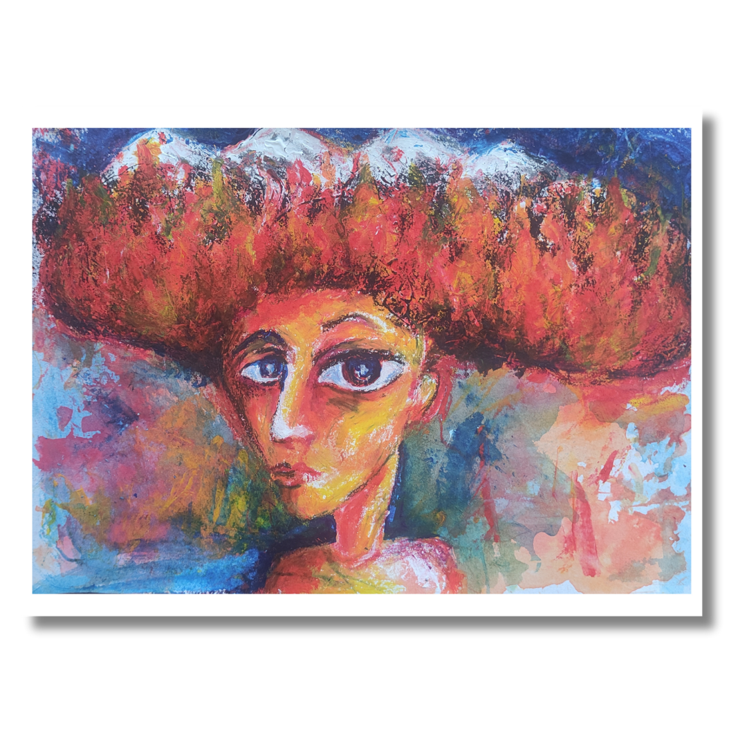 Where memory meets identity, My Home burns bright. The portrait’s crown of wild, fiery foliage evokes both inner flame and rooted land—perhaps forest, perhaps fire—blending dreamscape with soulscape. Ayda Pakzad Afshar’s vibrant use of oil pastel and ink stirs nostalgia, displacement, and a haunting love for one’s origins.