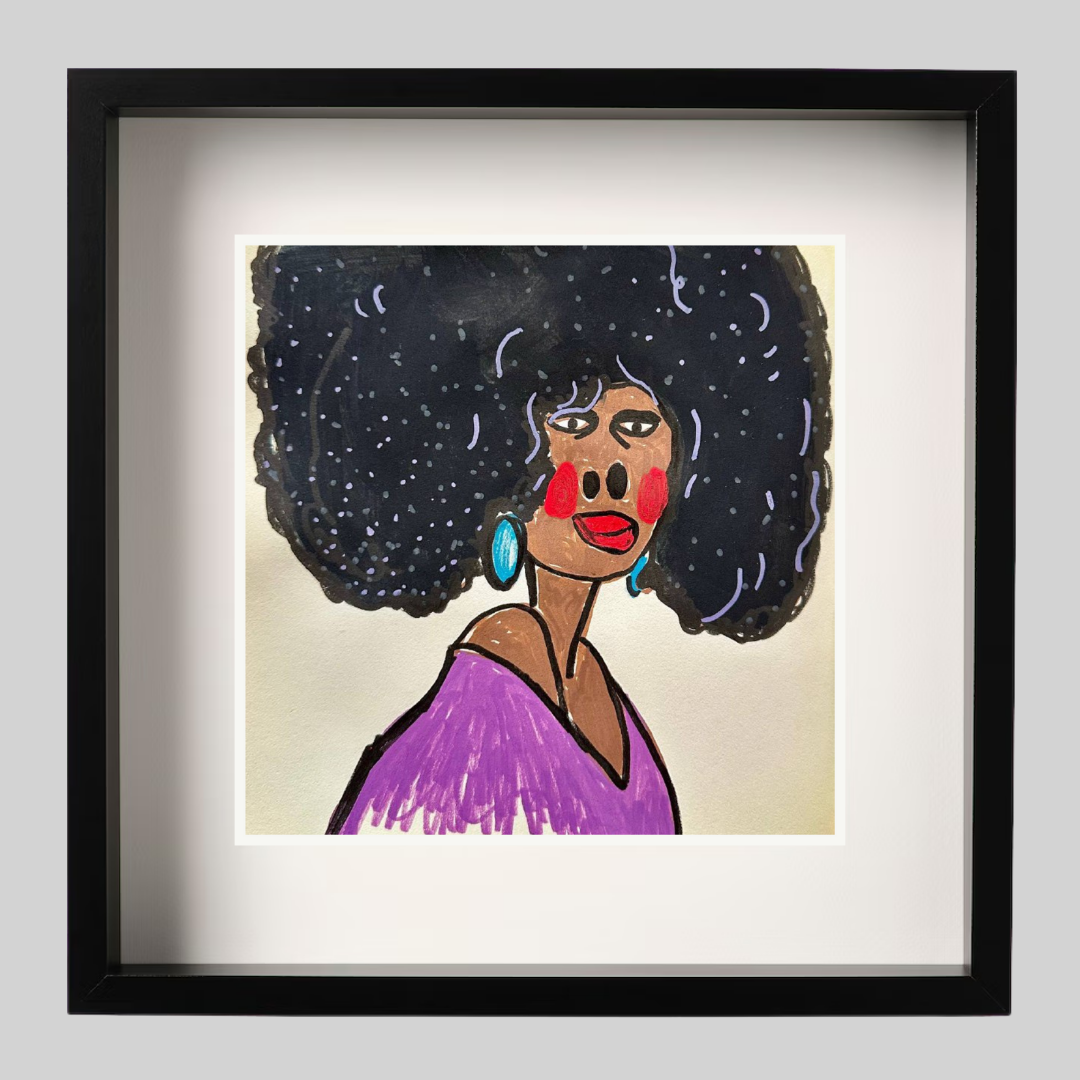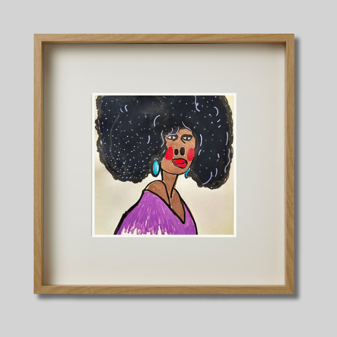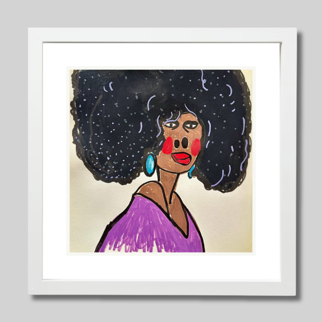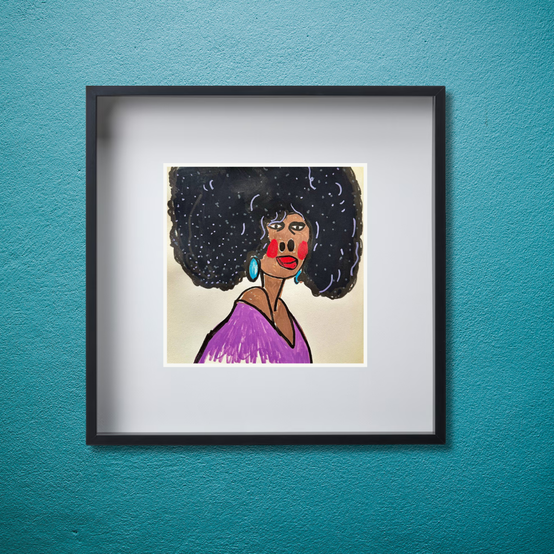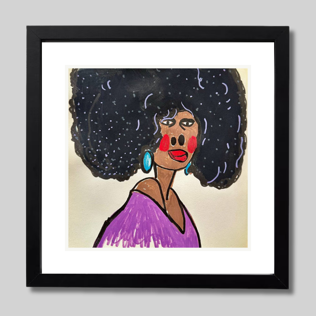 Radiating charm and individuality, “Purple” is a vibrant fine art print based on an original portrait by Azam Mahdavi. The figure's expressive face, crowned by an iconic textured afro and styled with turquoise earrings and a plum-toned top, exudes character and unapologetic presence. Playful lines and bold contrasts bring this striking personality to life.