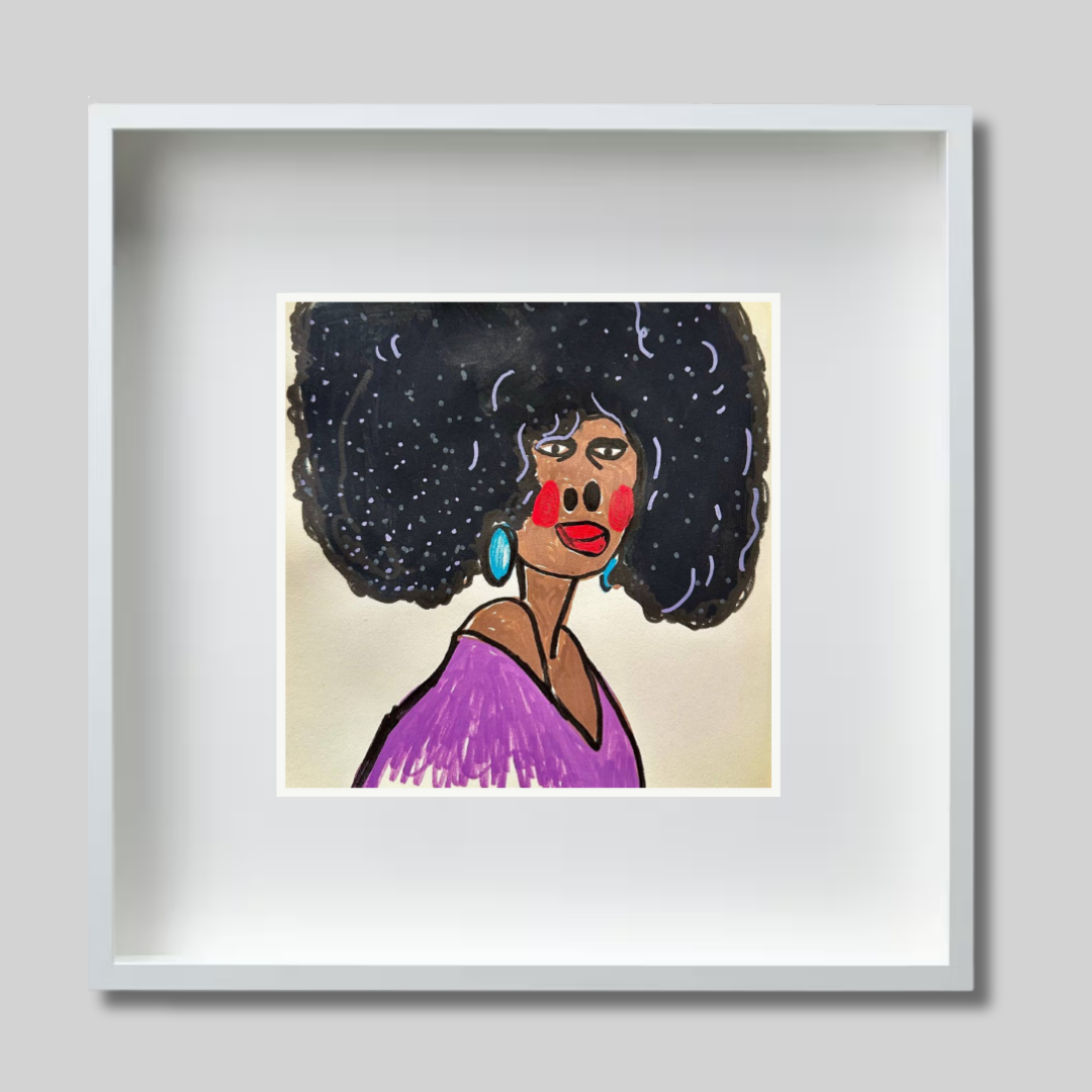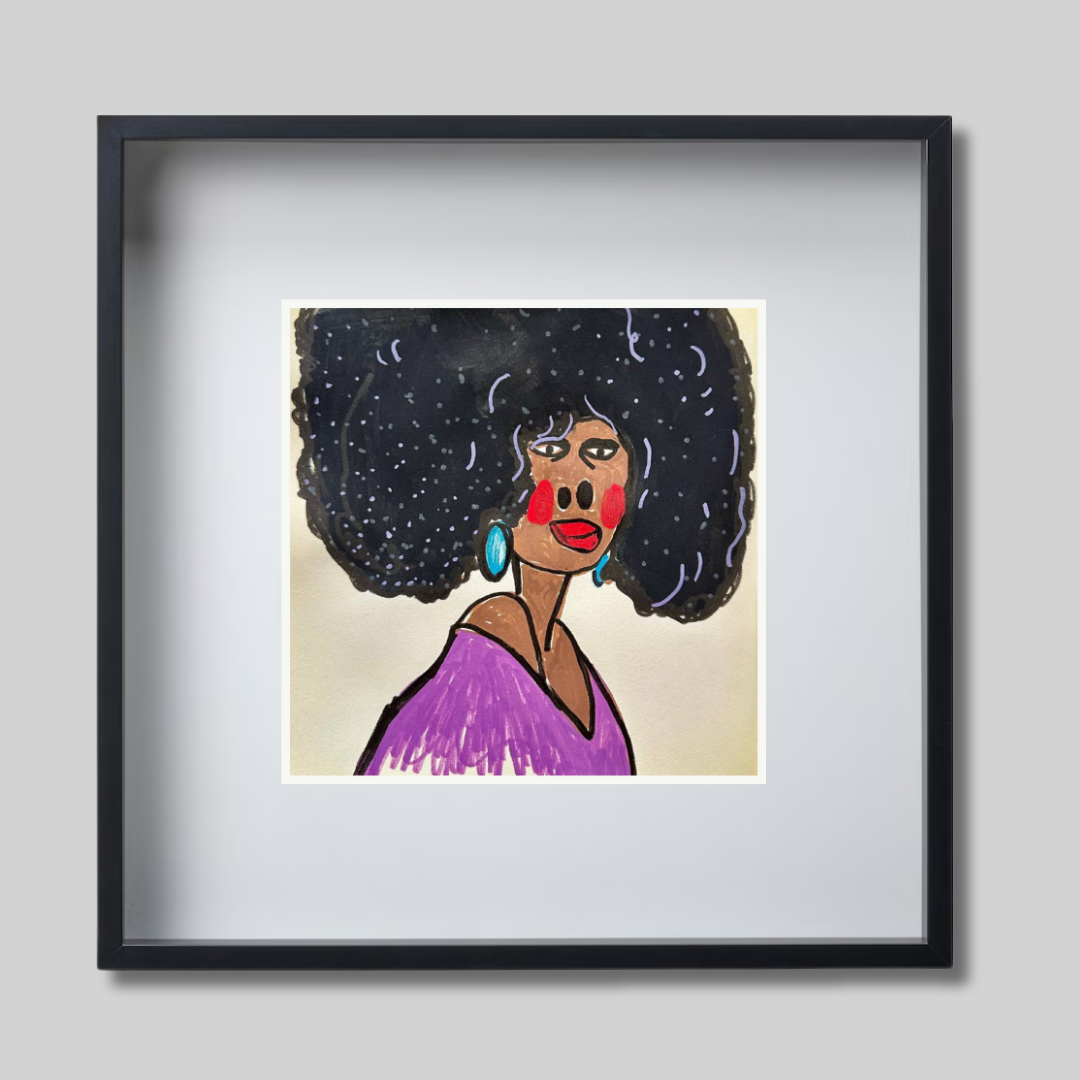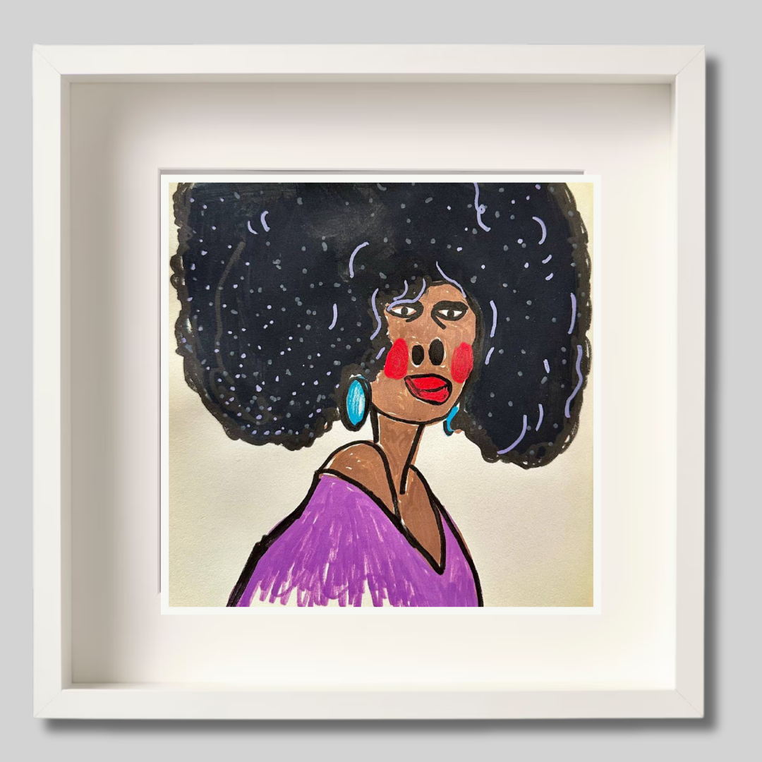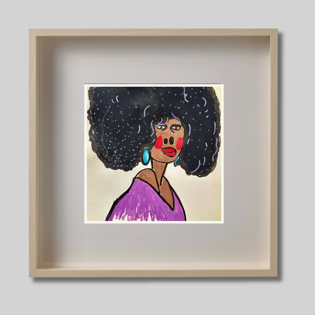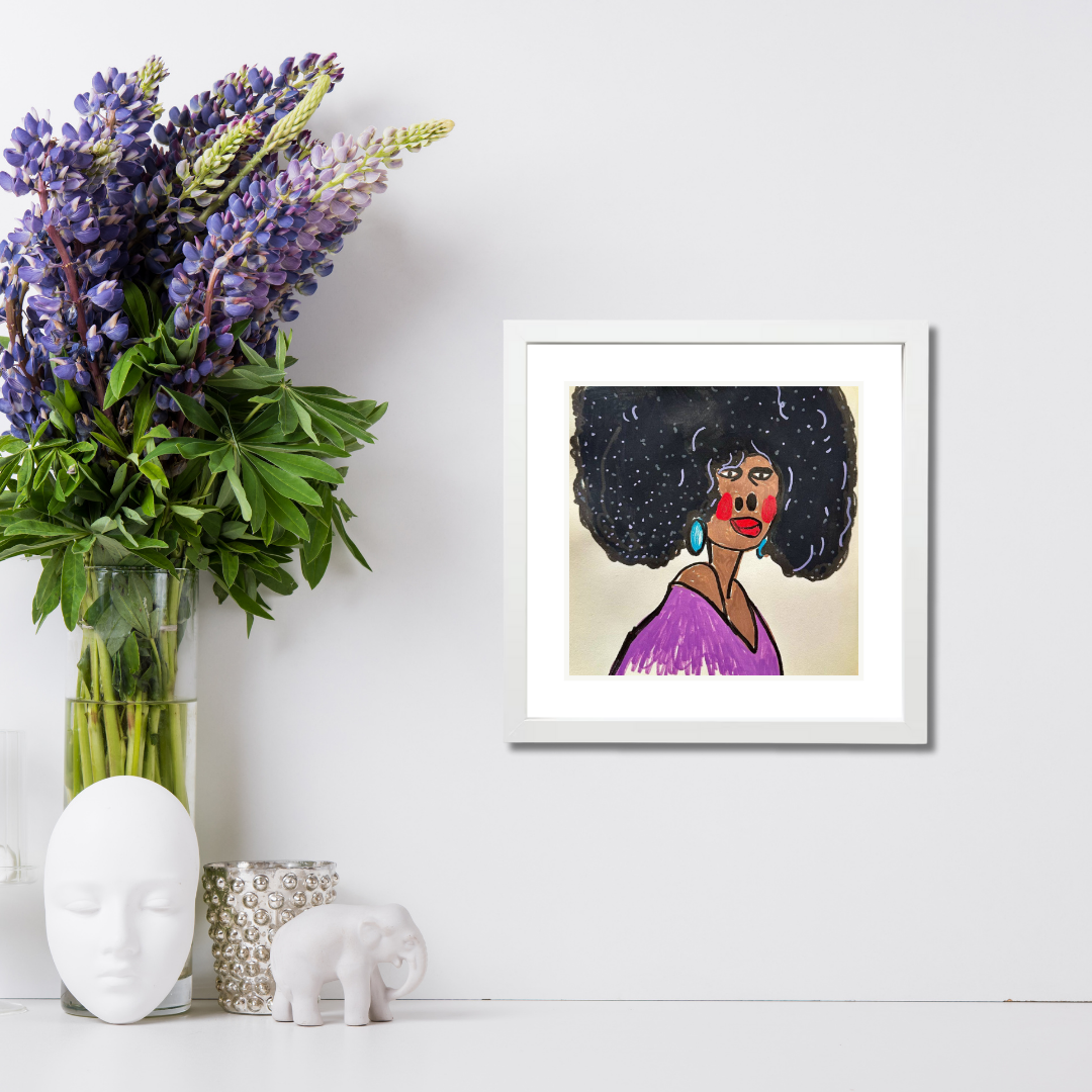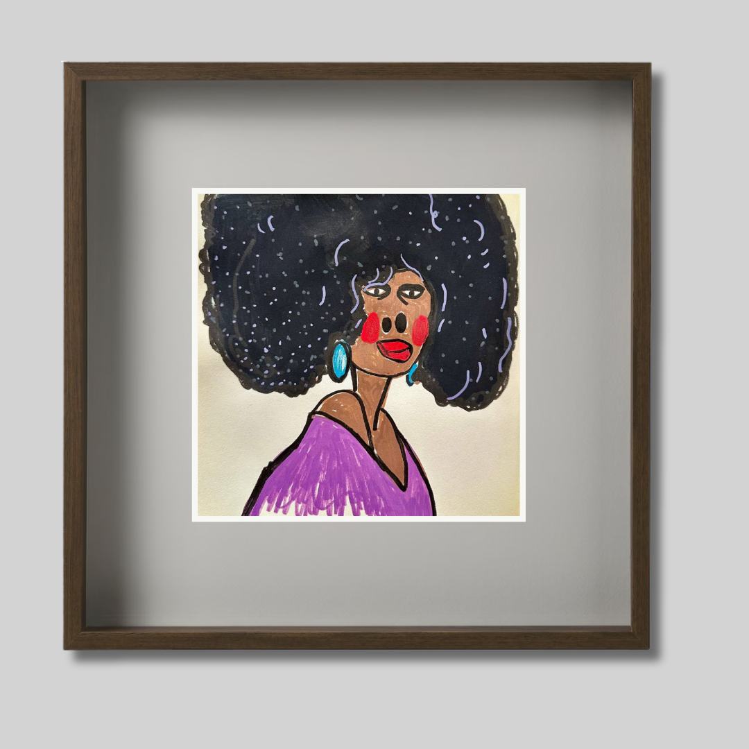 Radiating charm and individuality, “Purple” is a vibrant fine art print based on an original portrait by Azam Mahdavi. The figure's expressive face, crowned by an iconic textured afro and styled with turquoise earrings and a plum-toned top, exudes character and unapologetic presence. Playful lines and bold contrasts bring this striking personality to life.
