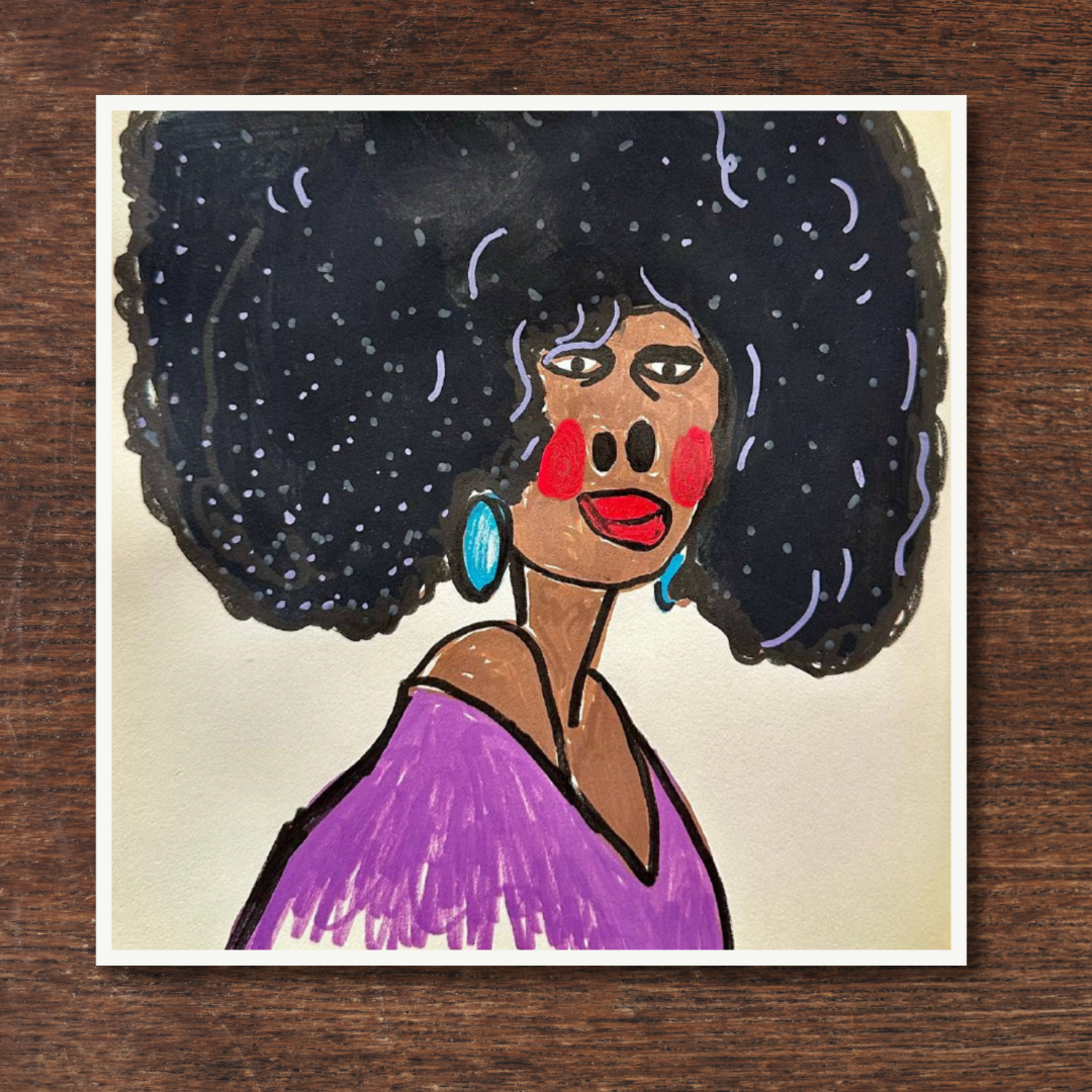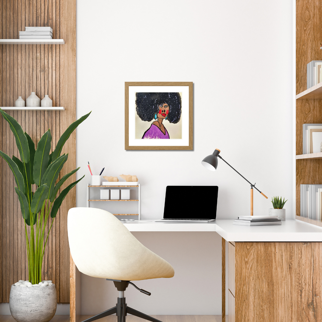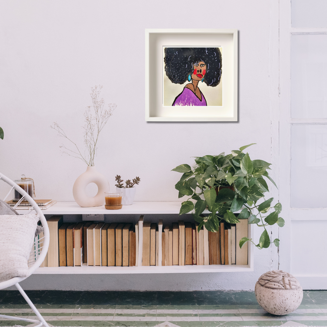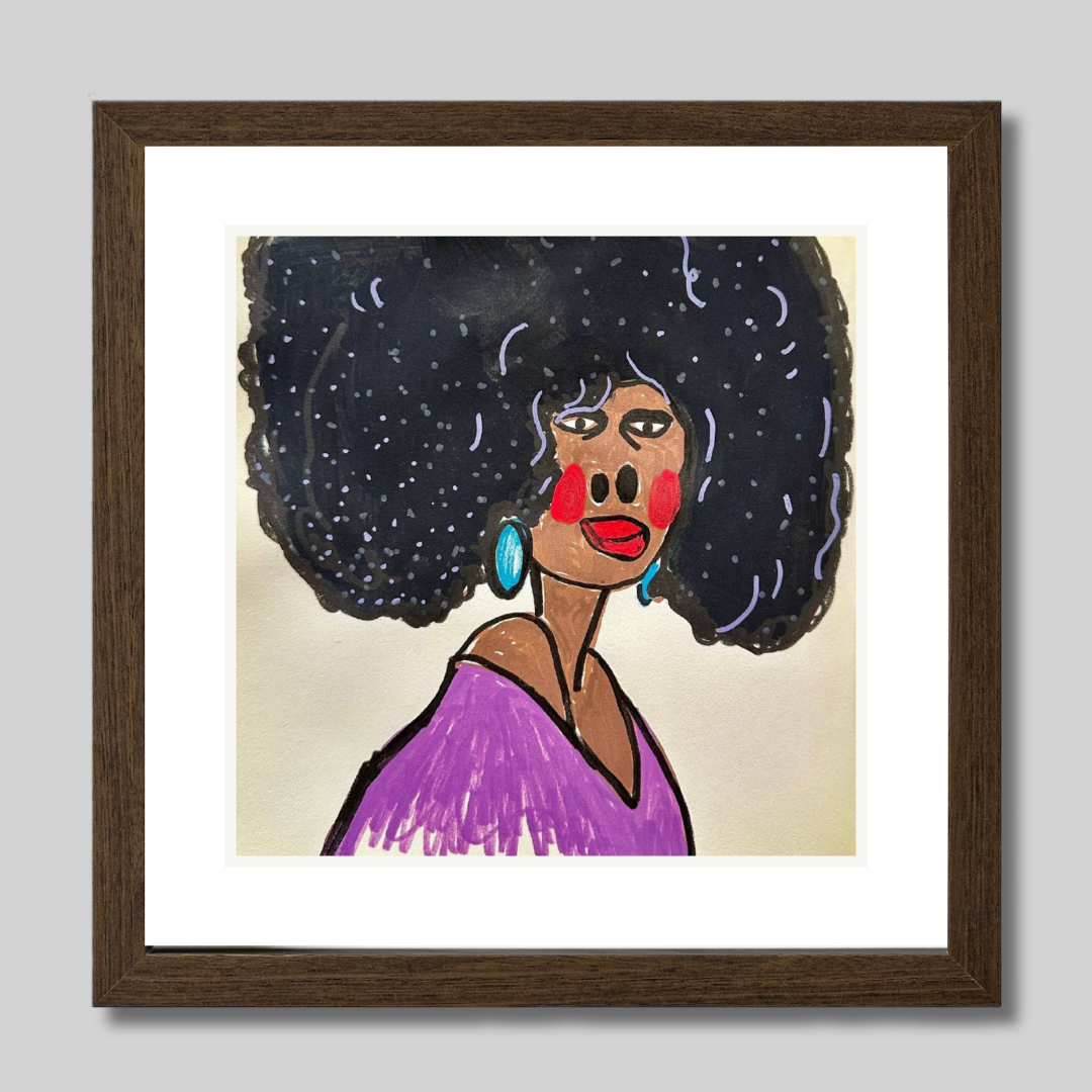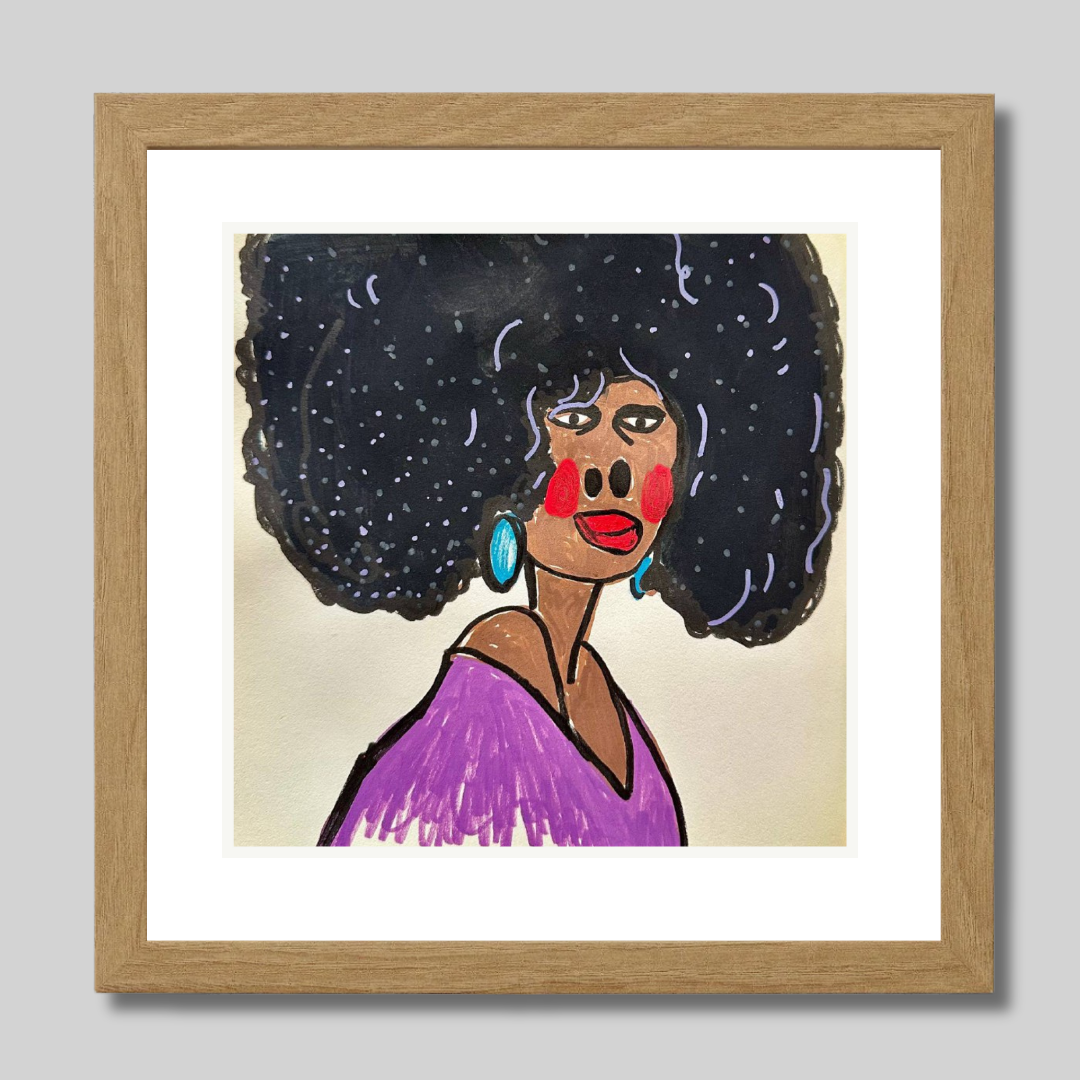 Radiating charm and individuality, “Purple” is a vibrant fine art print based on an original portrait by Azam Mahdavi. The figure's expressive face, crowned by an iconic textured afro and styled with turquoise earrings and a plum-toned top, exudes character and unapologetic presence. Playful lines and bold contrasts bring this striking personality to life.