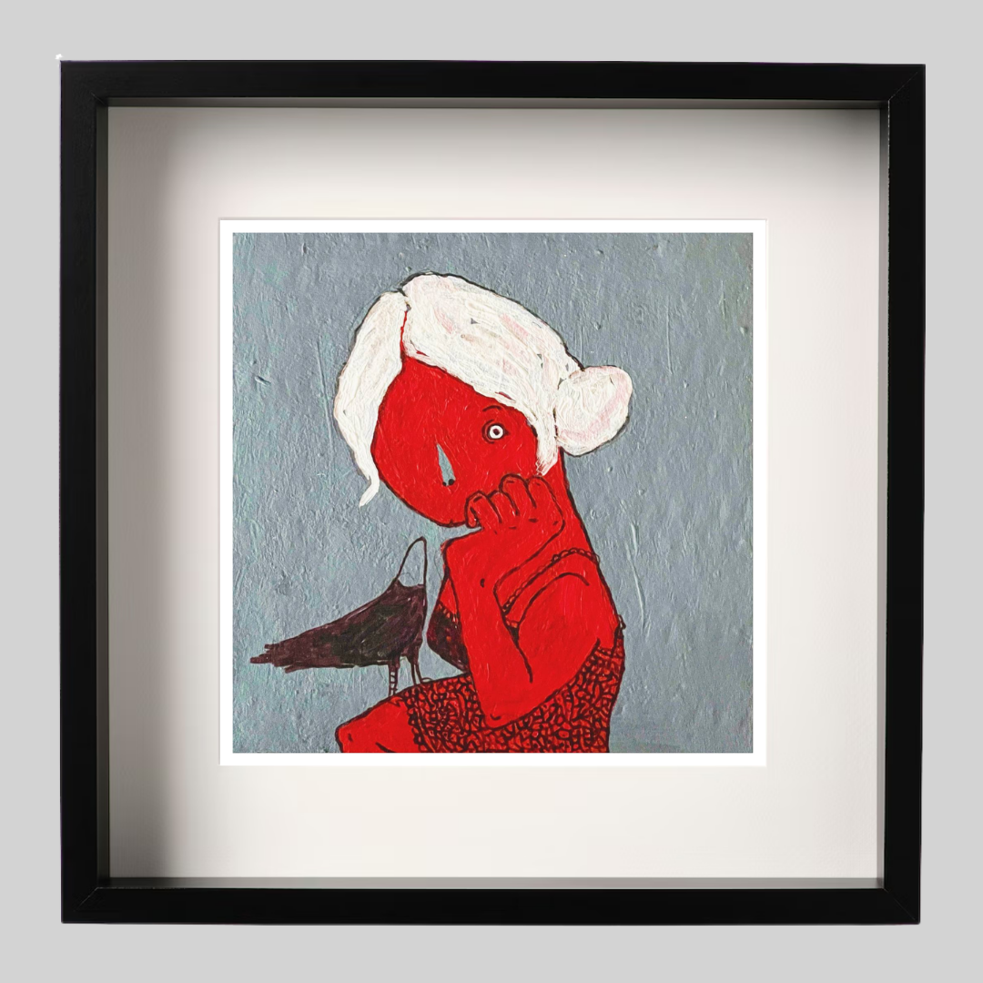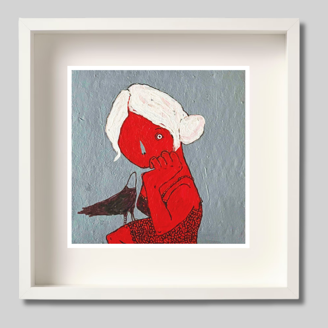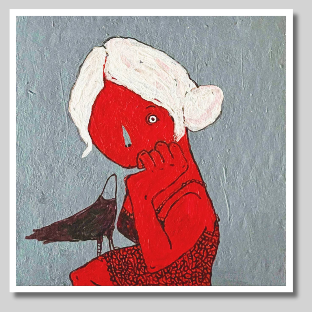 With a quiet, contemplative pose and intense visual contrast, Red 3 captures the moment of inner tension and watchful observation. A red figure, with intricately detailed clothing and stark white hair tied into a bun, turns to look back—her wide eye sharp and searching. The presence of a single black bird deepens the sense of alertness, as though something unspoken lingers just beyond the frame.