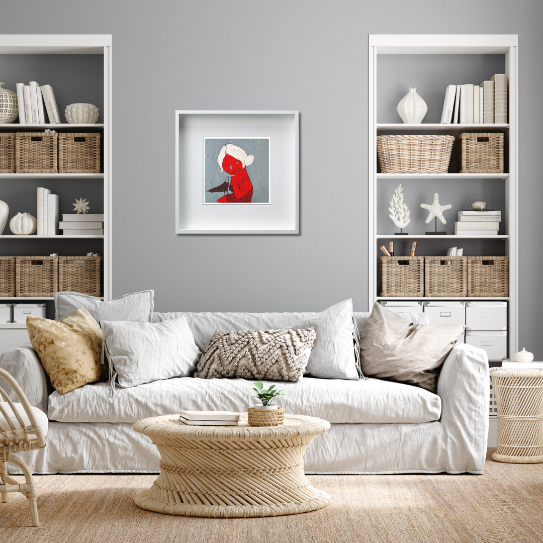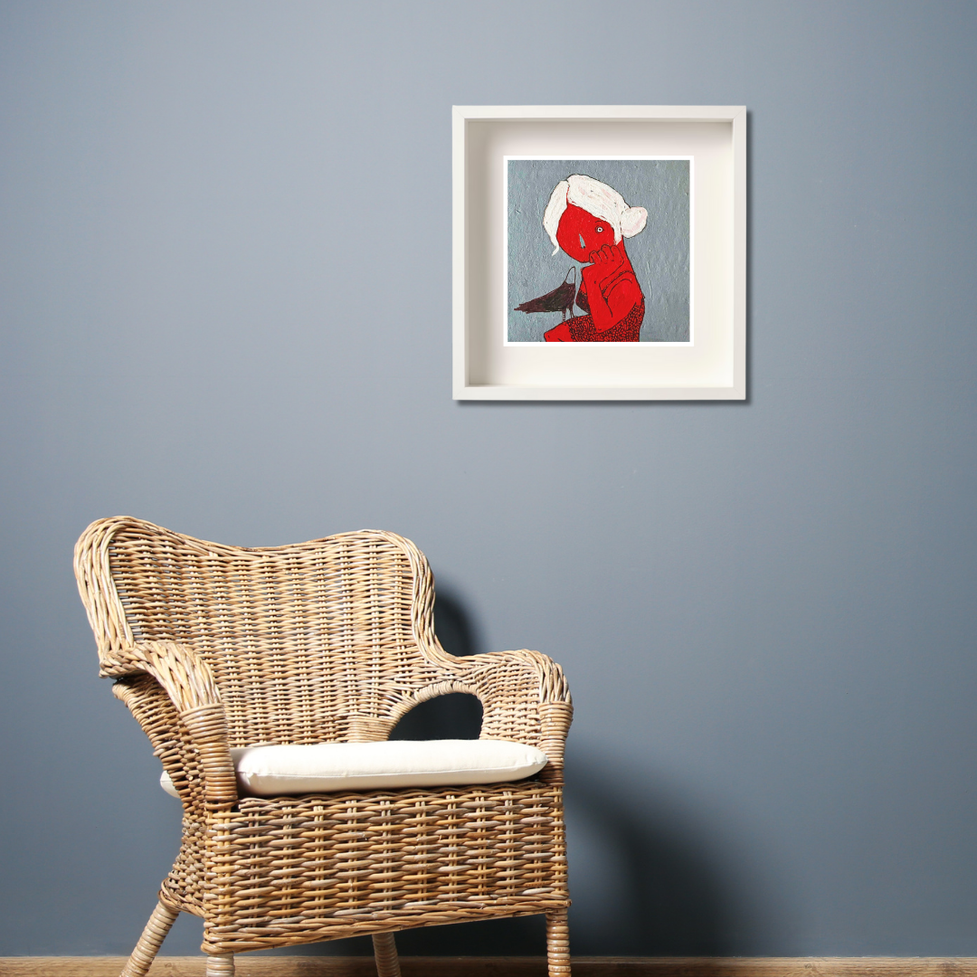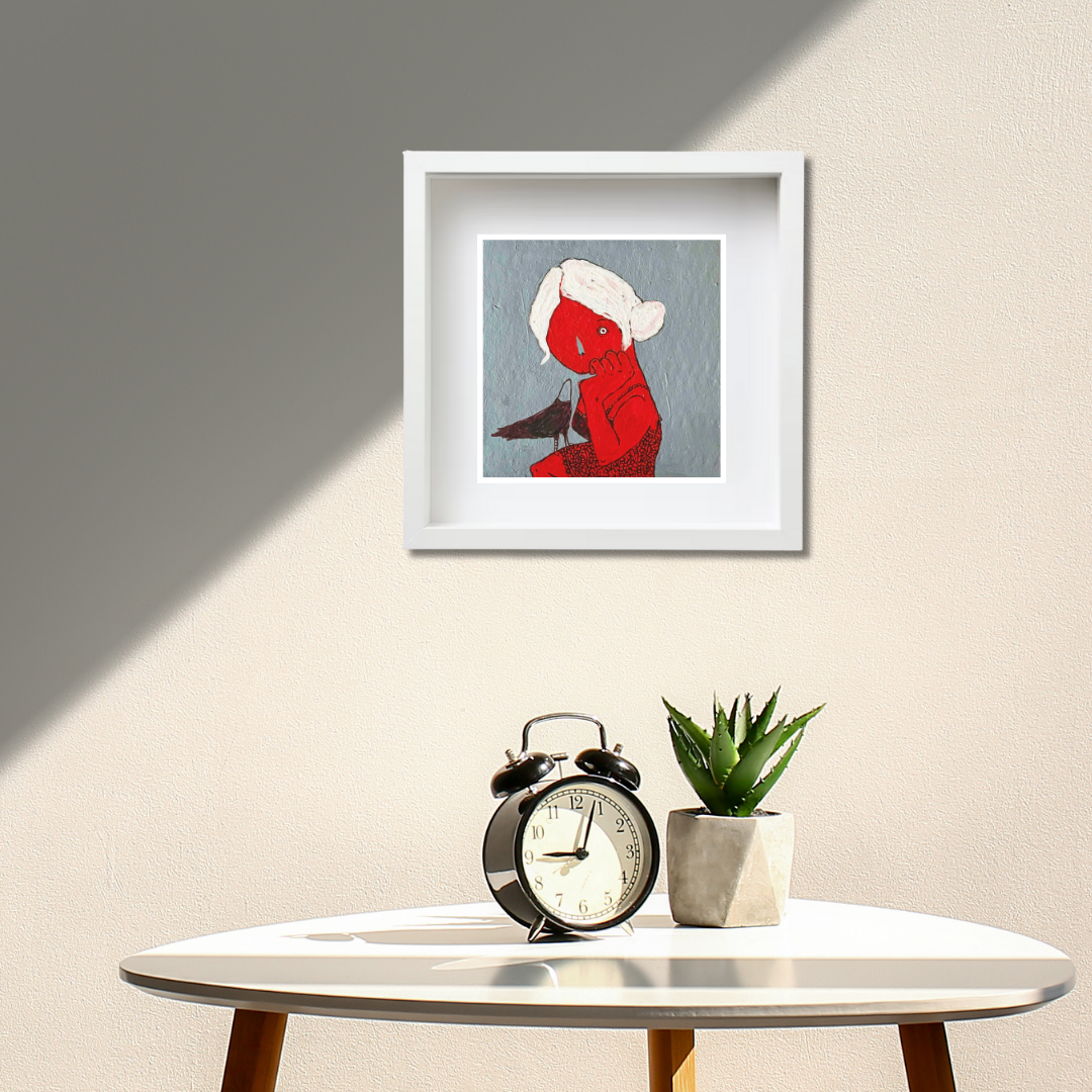 With a quiet, contemplative pose and intense visual contrast, Red 3 captures the moment of inner tension and watchful observation. A red figure, with intricately detailed clothing and stark white hair tied into a bun, turns to look back—her wide eye sharp and searching. The presence of a single black bird deepens the sense of alertness, as though something unspoken lingers just beyond the frame.