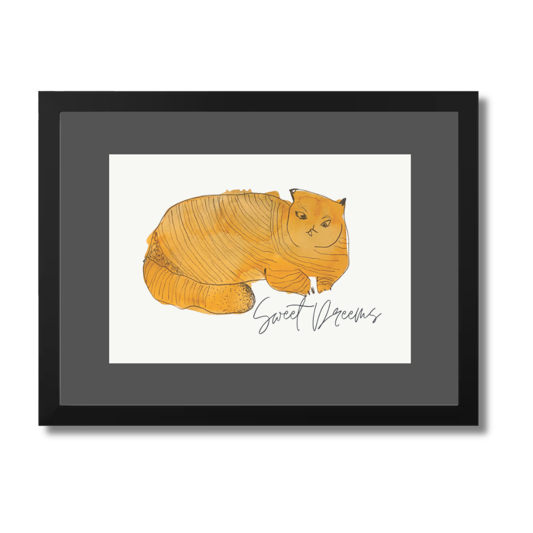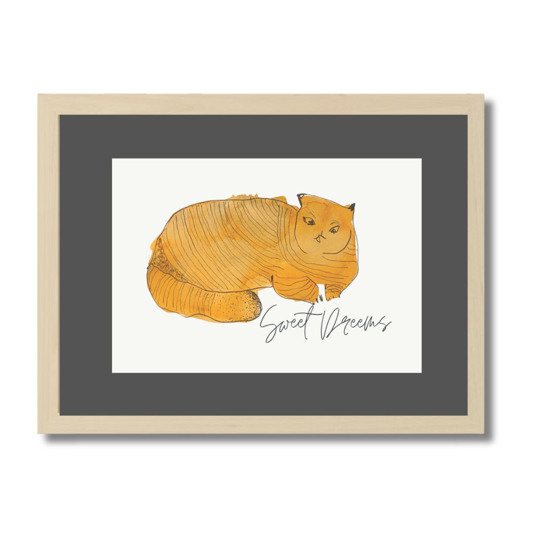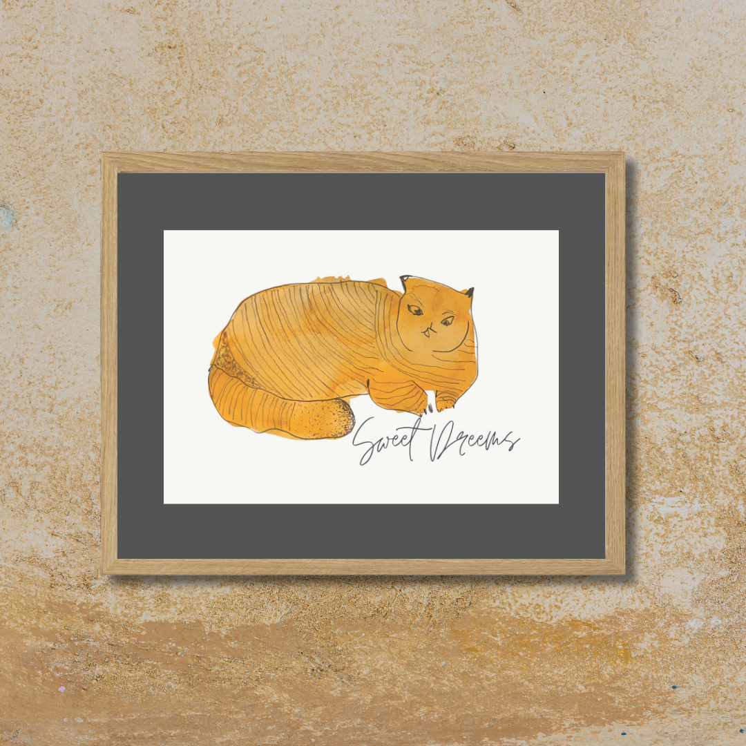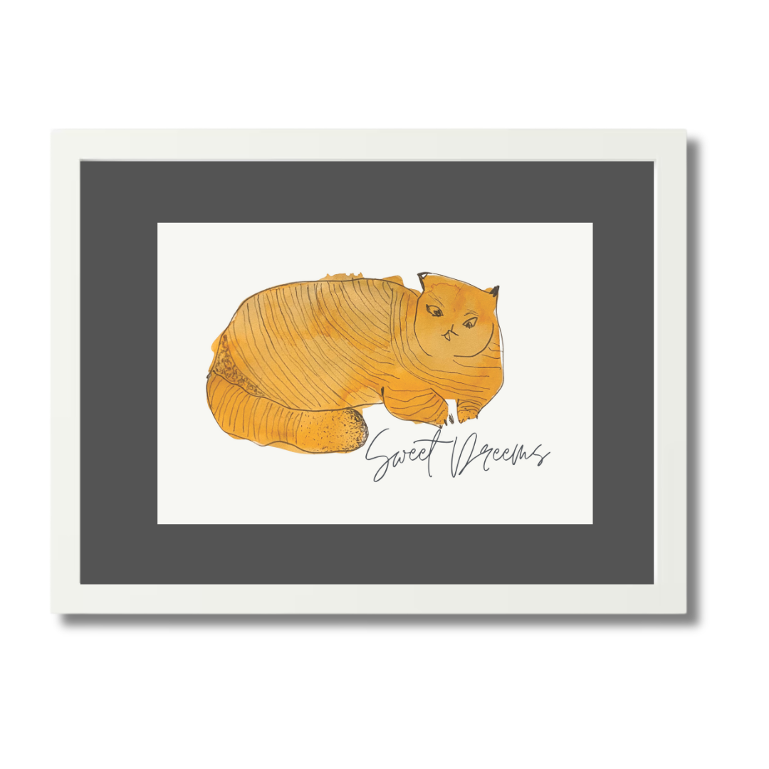 In Sweet Dreams 3, a curled golden-orange cat sleeps contentedly, capturing the stillness and satisfaction of an undisturbed nap. The simple, rounded form paired with gentle lines creates a soothing visual rhythm — one that pairs beautifully with slow mornings or bedtime stories.