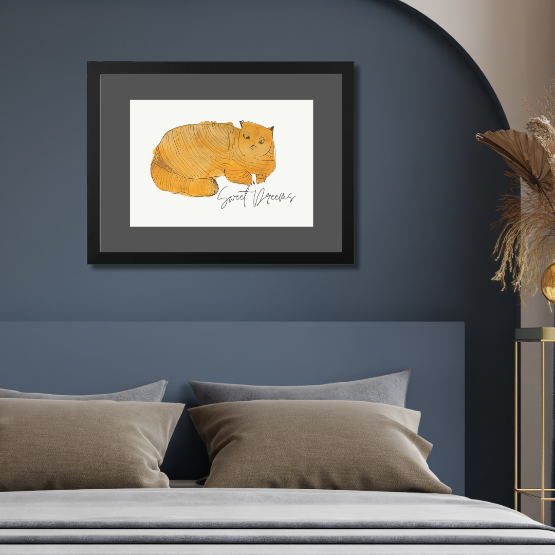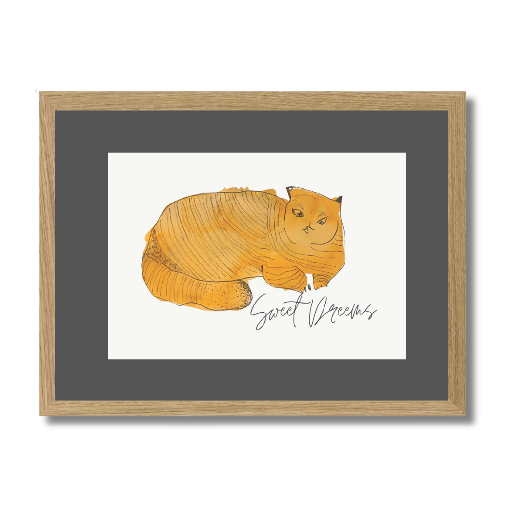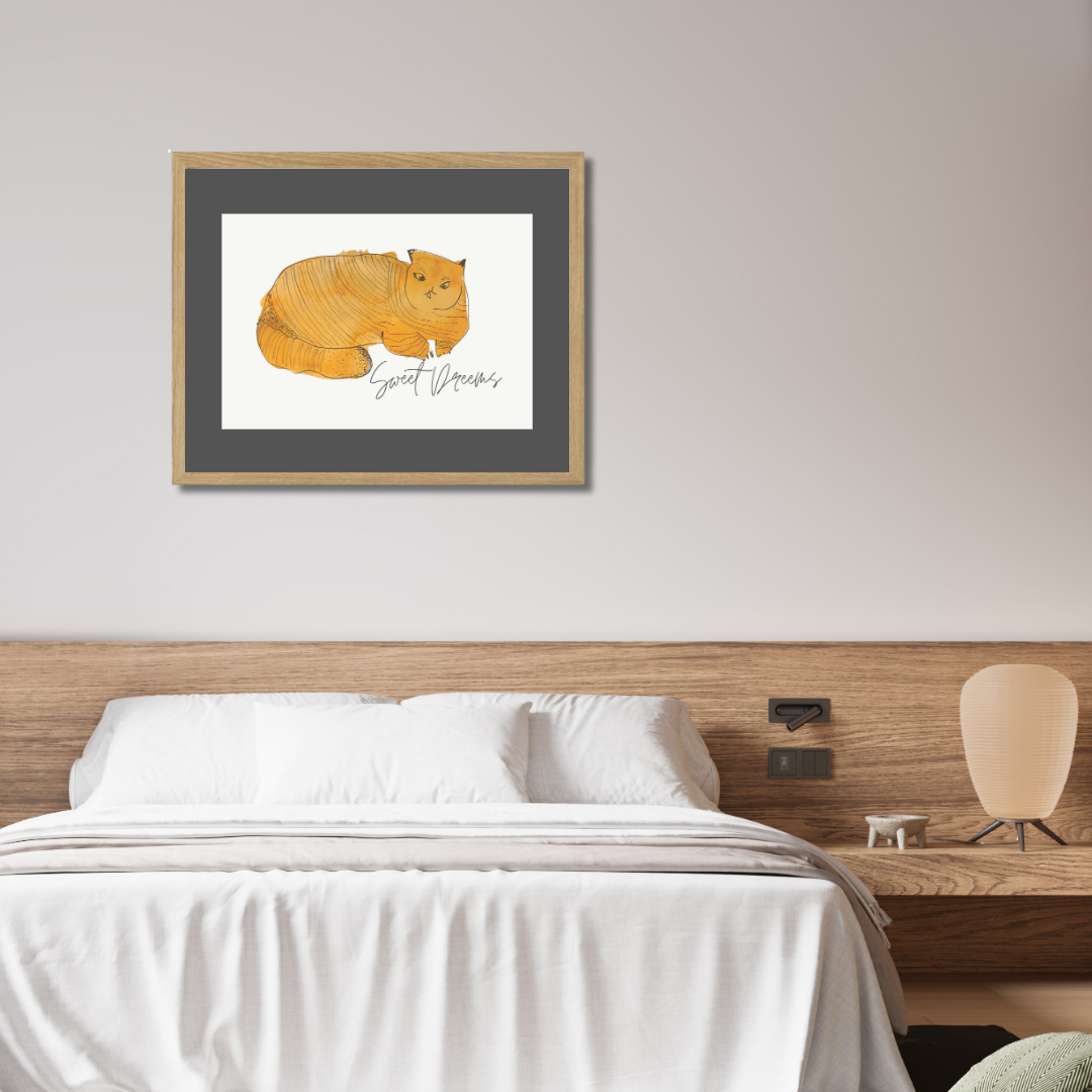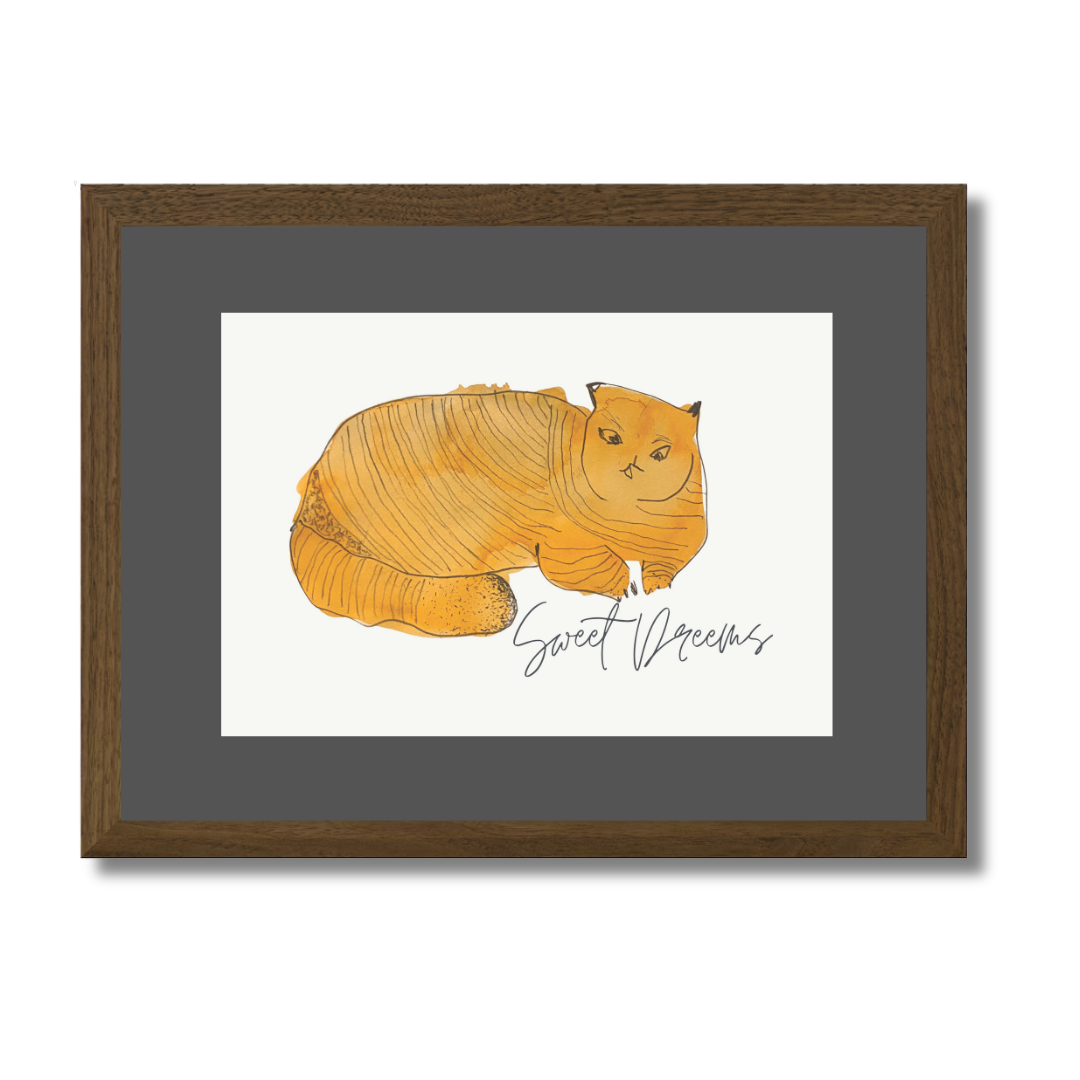 In Sweet Dreams 3, a curled golden-orange cat sleeps contentedly, capturing the stillness and satisfaction of an undisturbed nap. The simple, rounded form paired with gentle lines creates a soothing visual rhythm — one that pairs beautifully with slow mornings or bedtime stories.