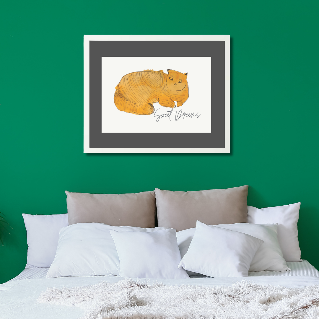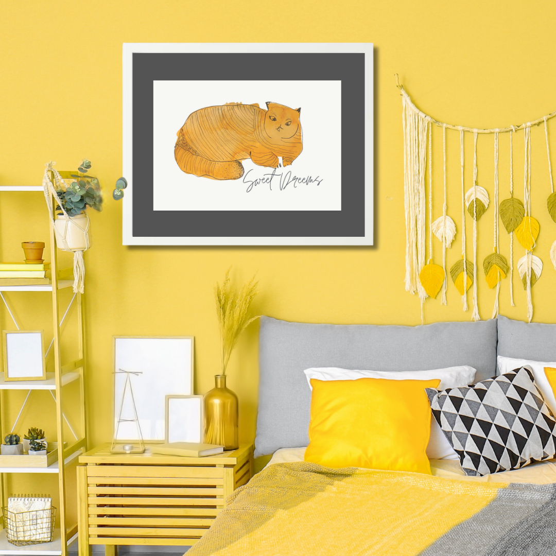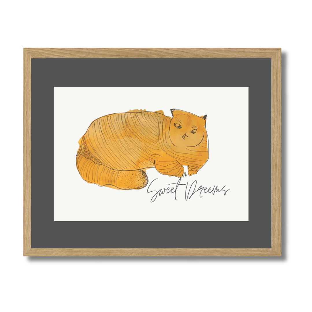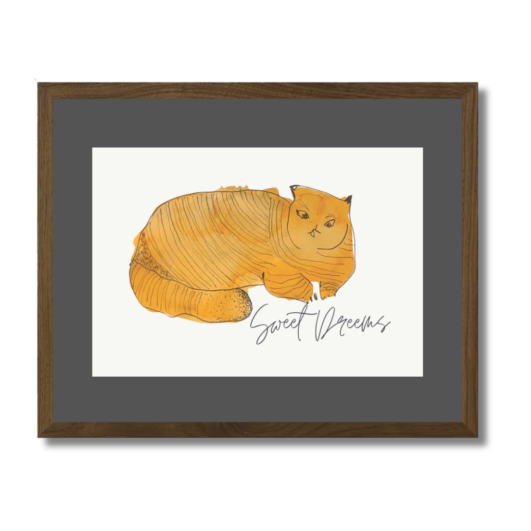 In Sweet Dreams 3, a curled golden-orange cat sleeps contentedly, capturing the stillness and satisfaction of an undisturbed nap. The simple, rounded form paired with gentle lines creates a soothing visual rhythm — one that pairs beautifully with slow mornings or bedtime stories.