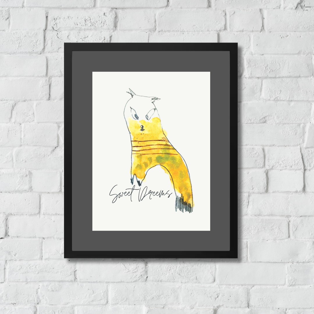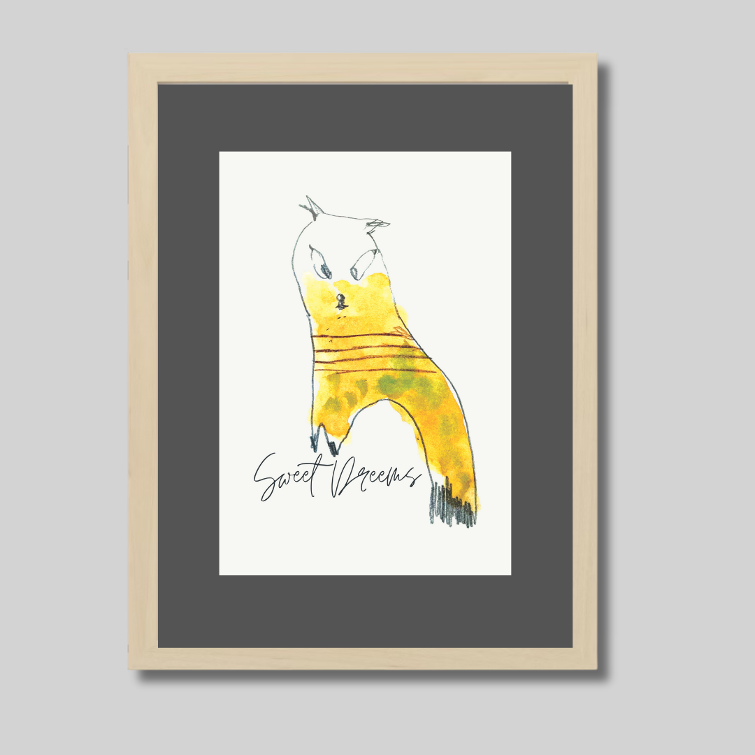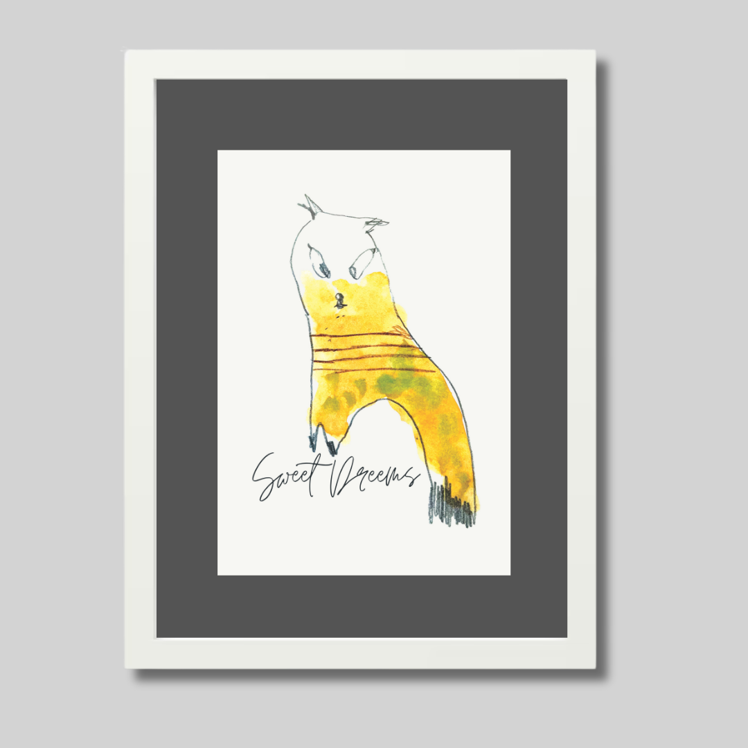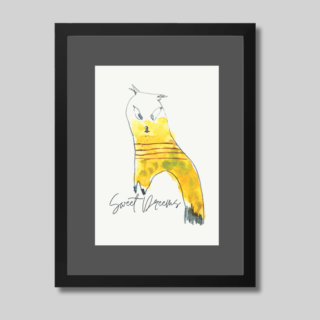 With its upright posture and sunlit yellow wash, Sweet Dreams 4 brings gentle brightness to the Sweet Dreams series. Its lightly abstract features and inky tail add a poetic sense of individuality — somewhere between a cat, a fox, and pure imagination.