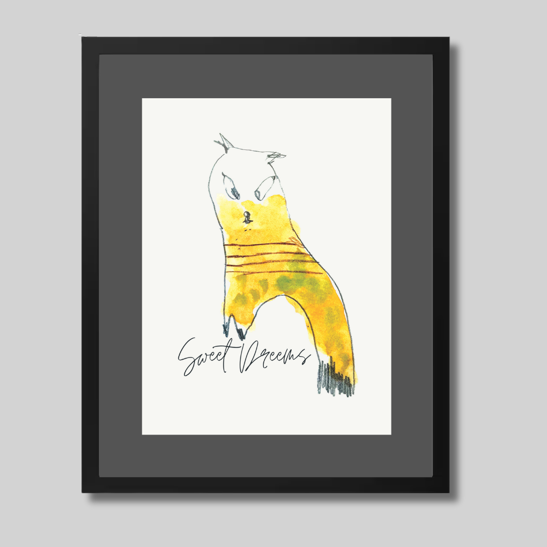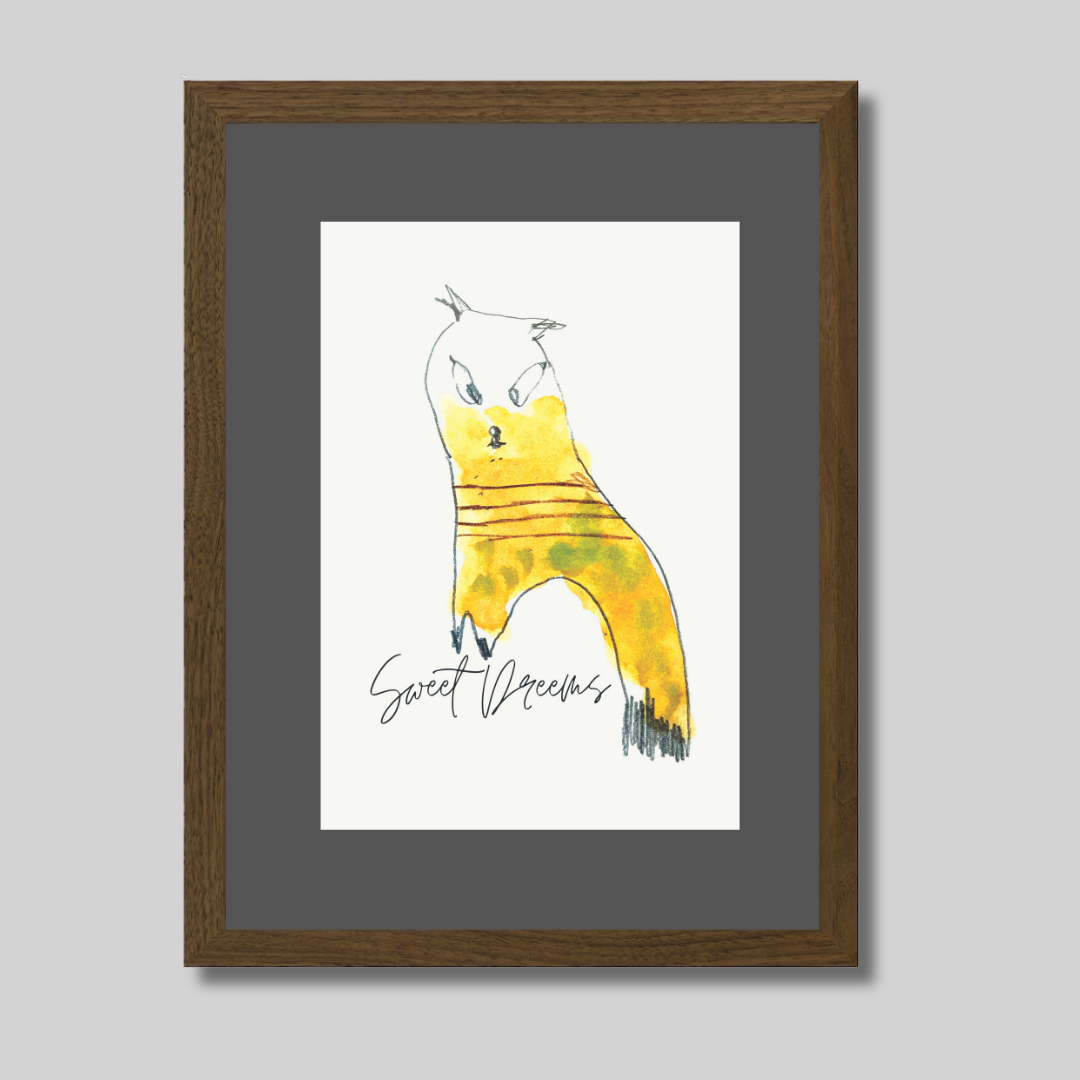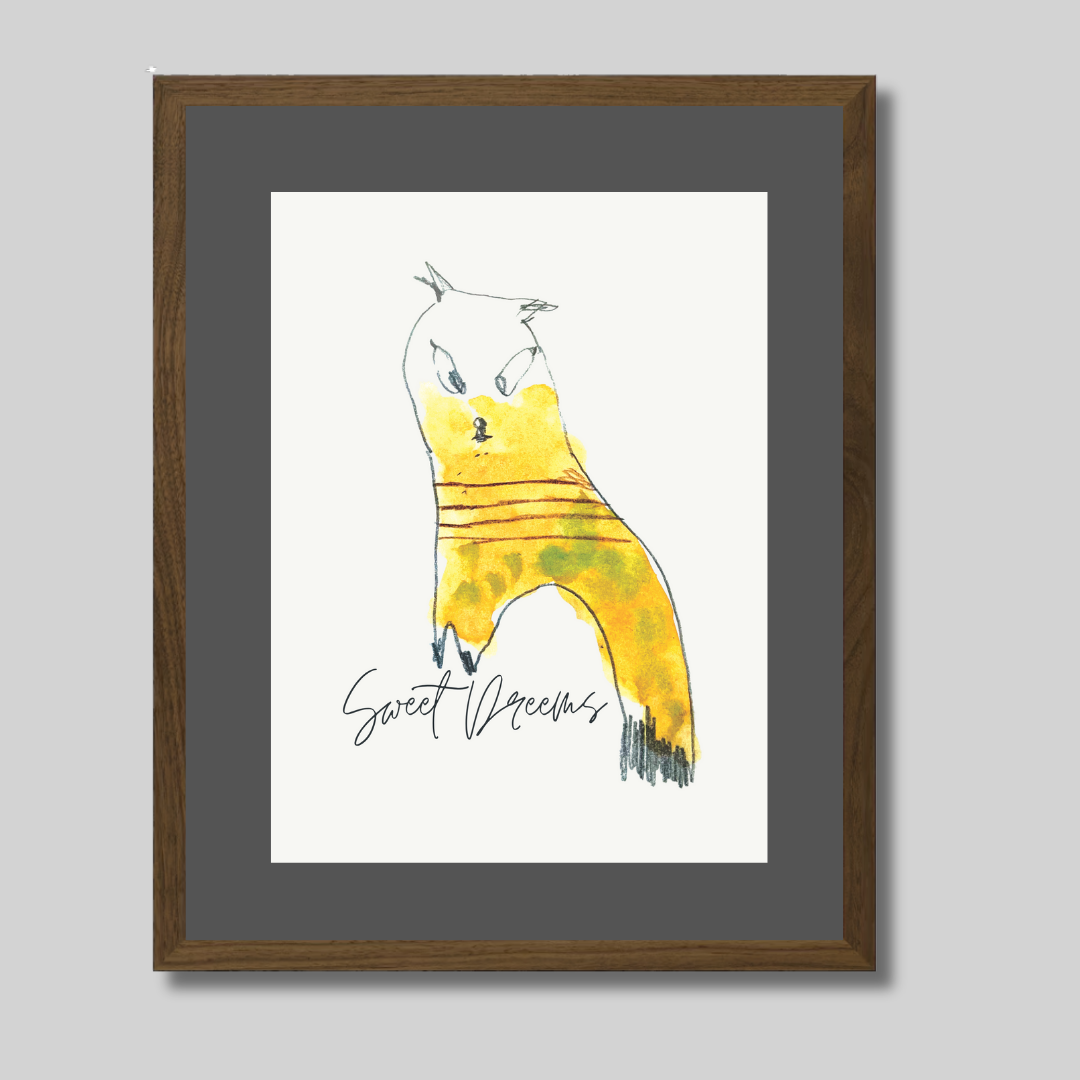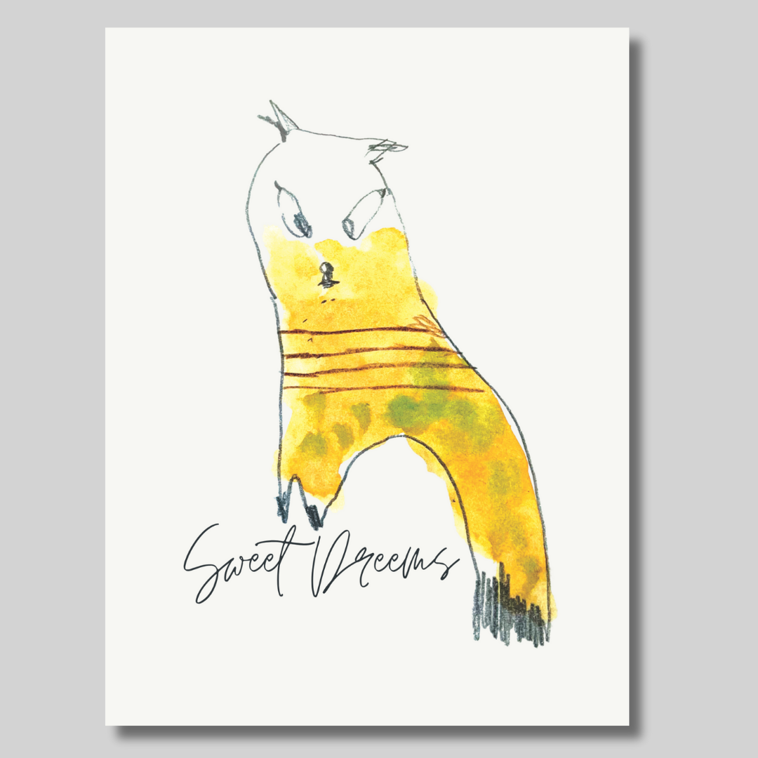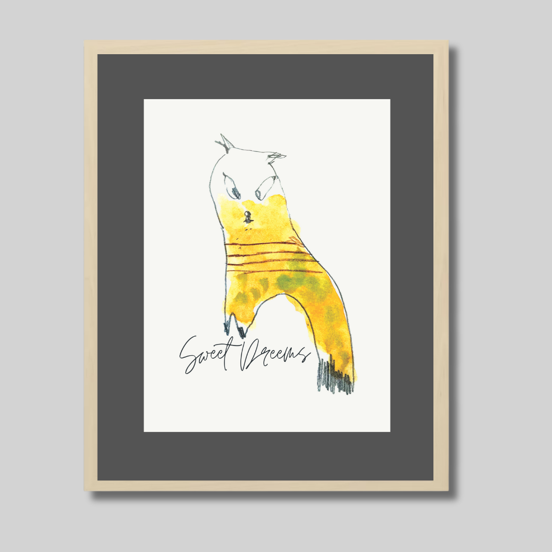With its upright posture and sunlit yellow wash, Sweet Dreams 4 brings gentle brightness to the Sweet Dreams series. Its lightly abstract features and inky tail add a poetic sense of individuality — somewhere between a cat, a fox, and pure imagination.