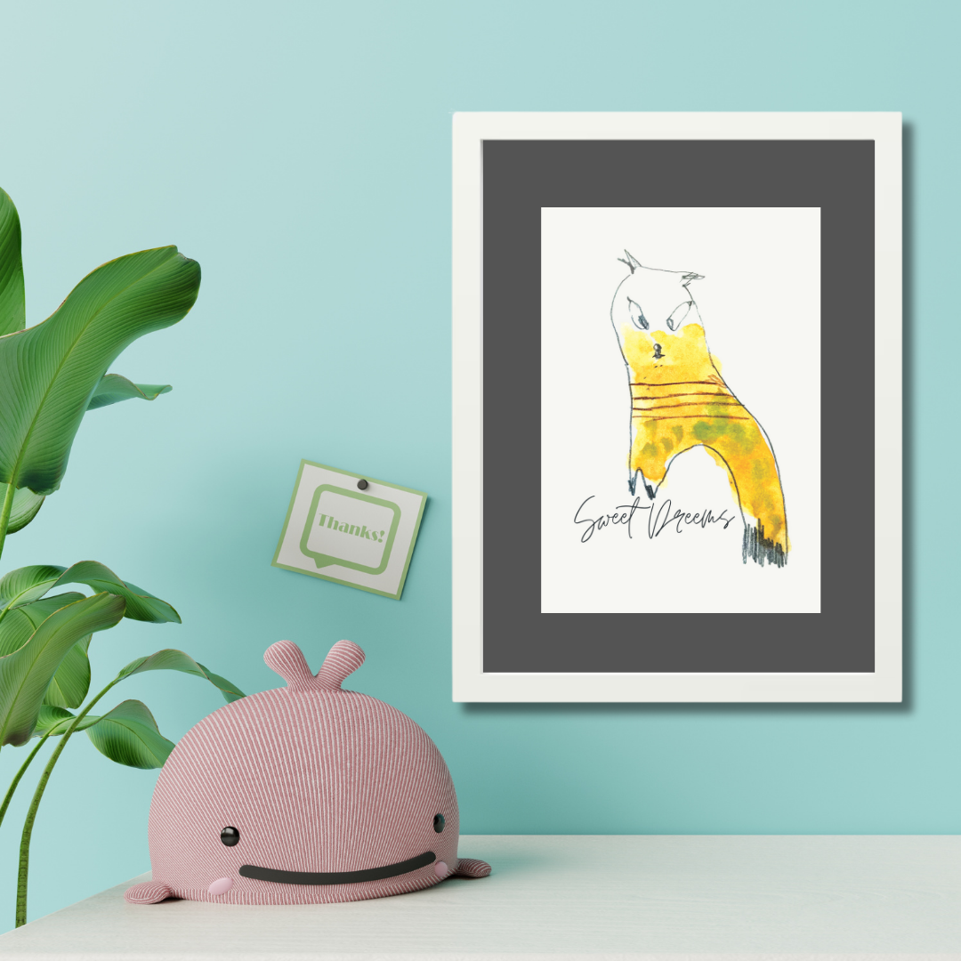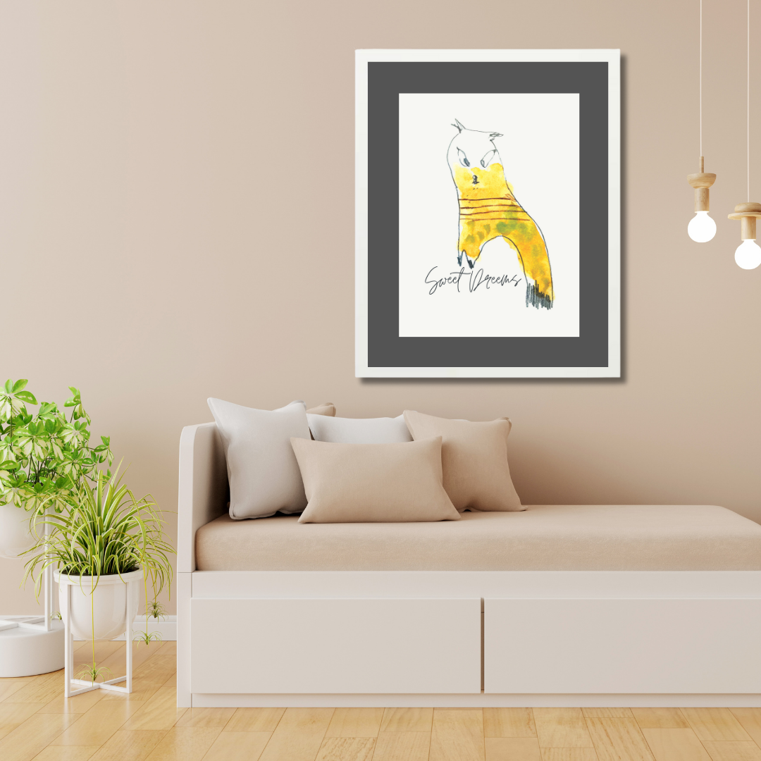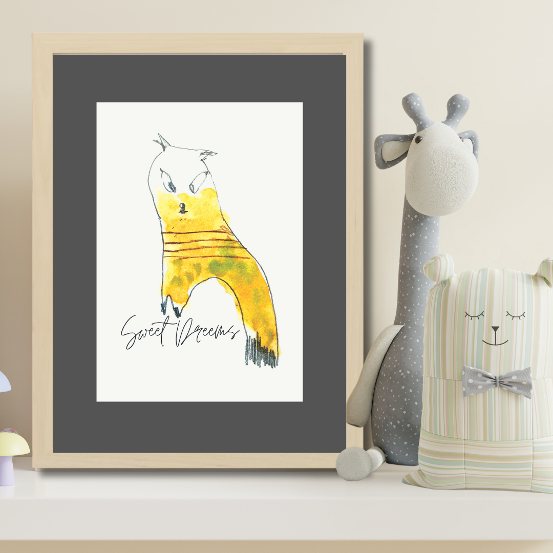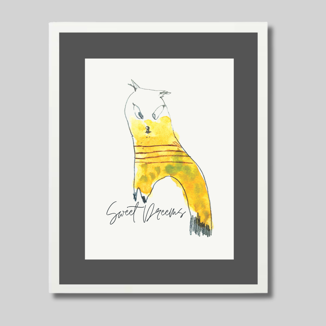 With its upright posture and sunlit yellow wash, Sweet Dreams 4 brings gentle brightness to the Sweet Dreams series. Its lightly abstract features and inky tail add a poetic sense of individuality — somewhere between a cat, a fox, and pure imagination.