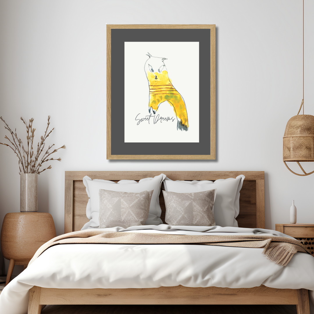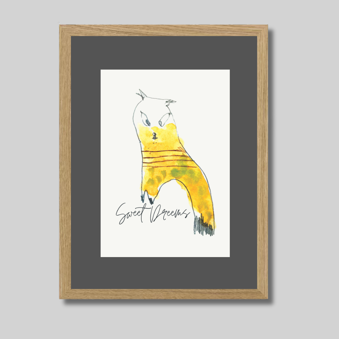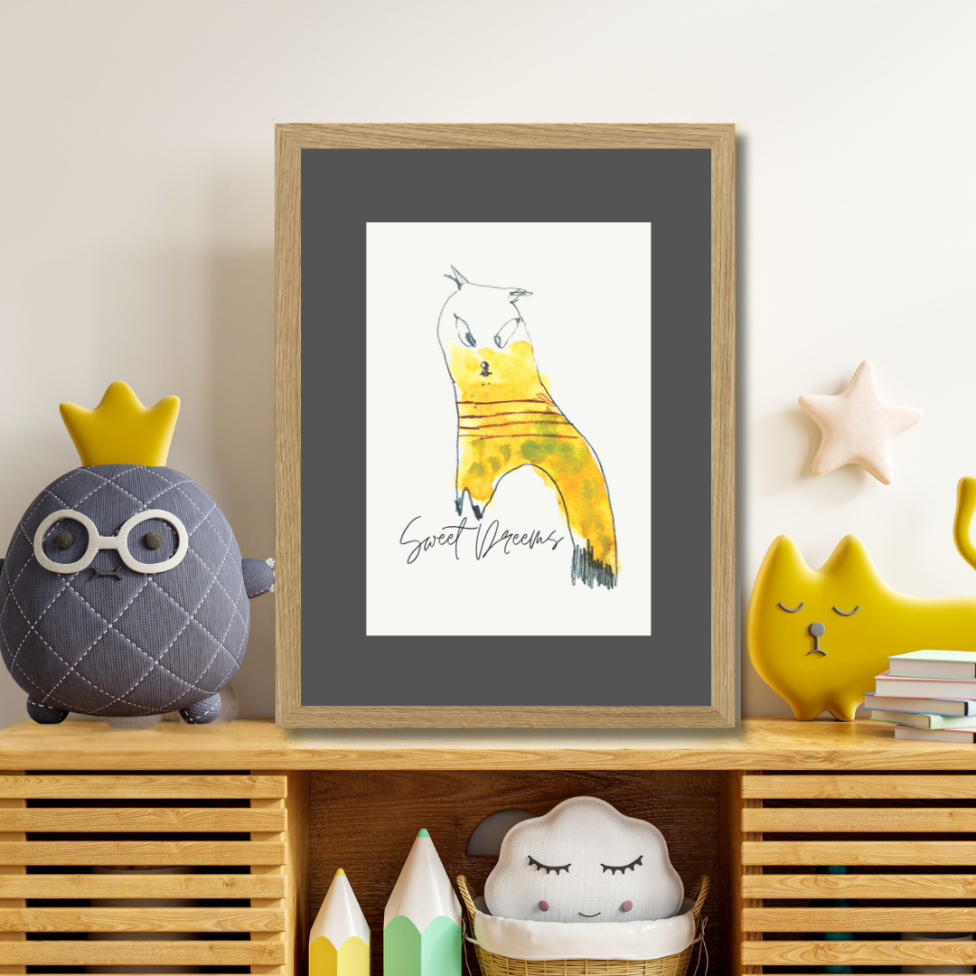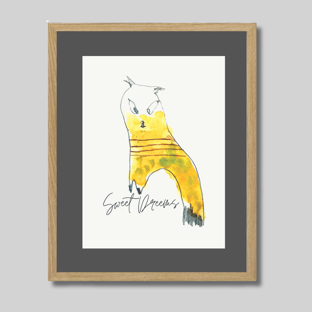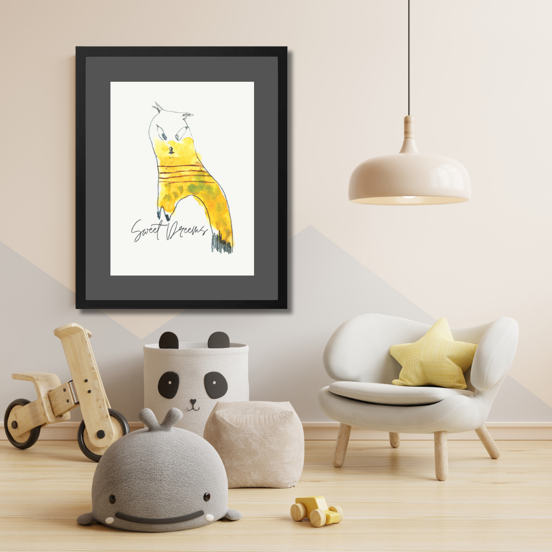 With its upright posture and sunlit yellow wash, Sweet Dreams 4 brings gentle brightness to the Sweet Dreams series. Its lightly abstract features and inky tail add a poetic sense of individuality — somewhere between a cat, a fox, and pure imagination.