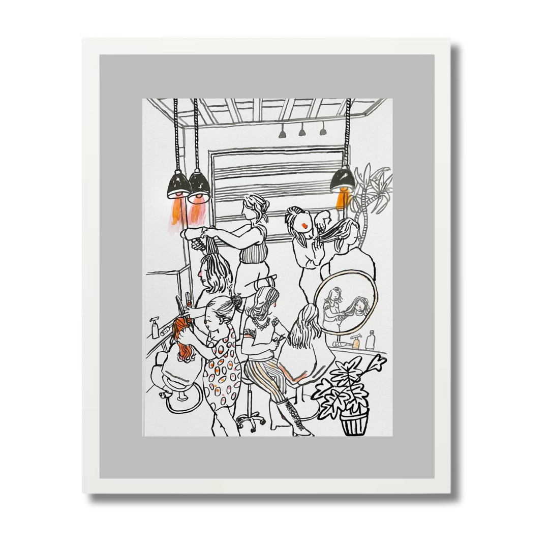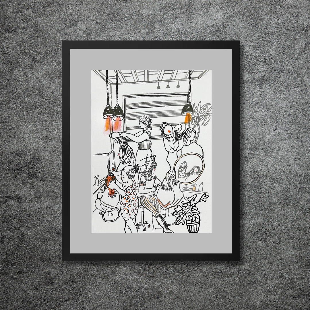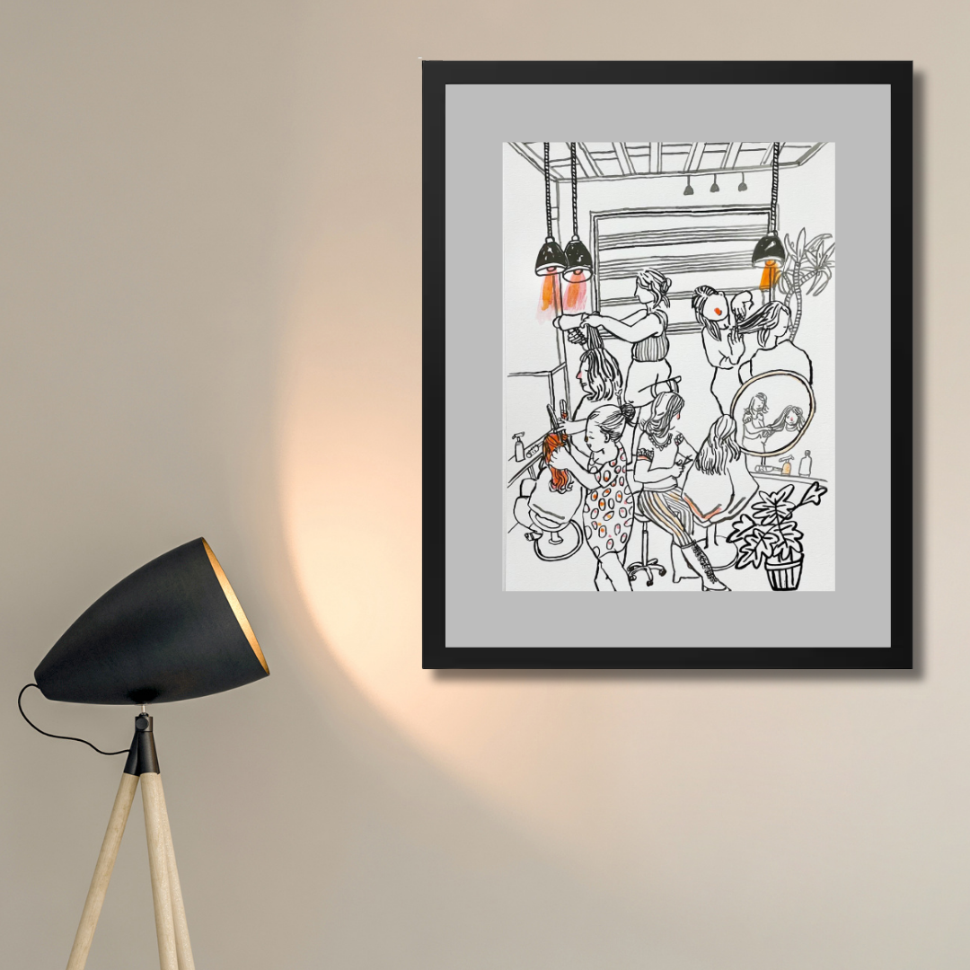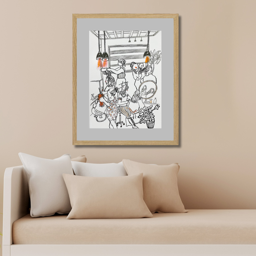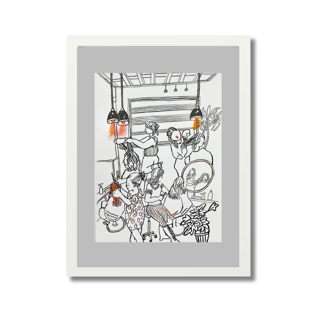 With fluid ink lines and washes of muted colour, Mahboobeh Yazdani captures the gestures, moods, and textures of a beauty salon space—subtle fragments of life seen through an artist’s lens. Full of emotional resonance and hand-drawn charm, this work stands alone or beautifully complements its companion piece.