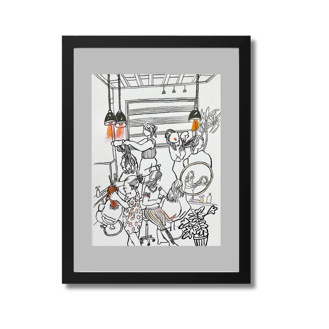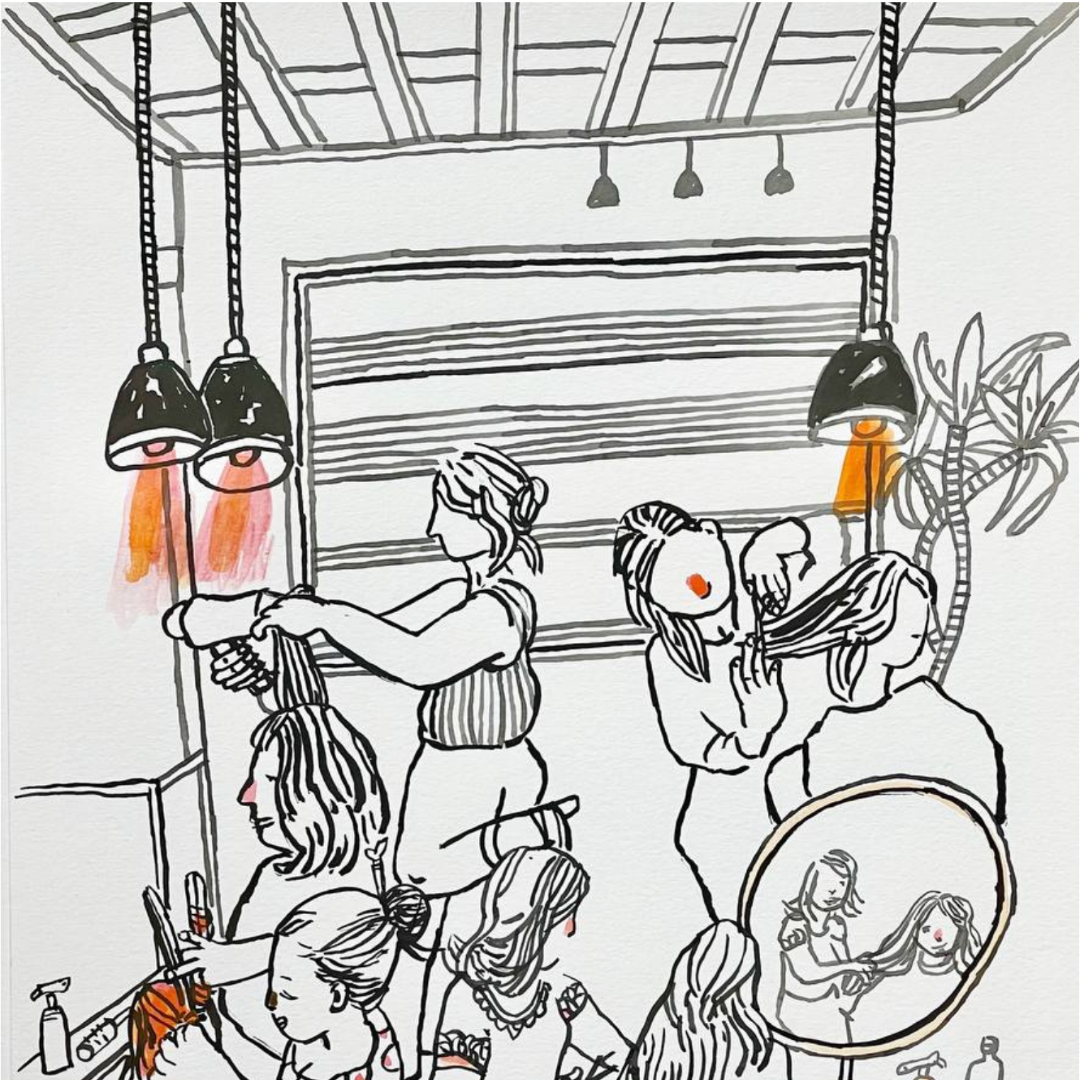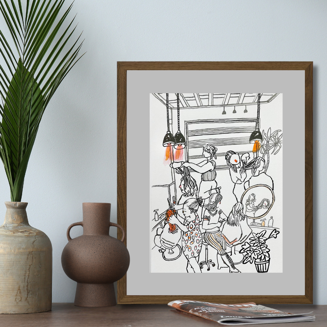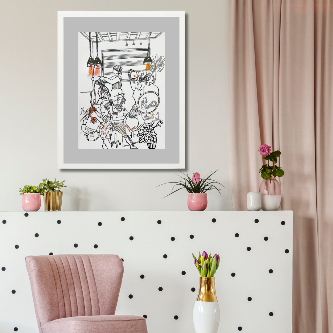 With fluid ink lines and washes of muted colour, Mahboobeh Yazdani captures the gestures, moods, and textures of a beauty salon space—subtle fragments of life seen through an artist’s lens. Full of emotional resonance and hand-drawn charm, this work stands alone or beautifully complements its companion piece.