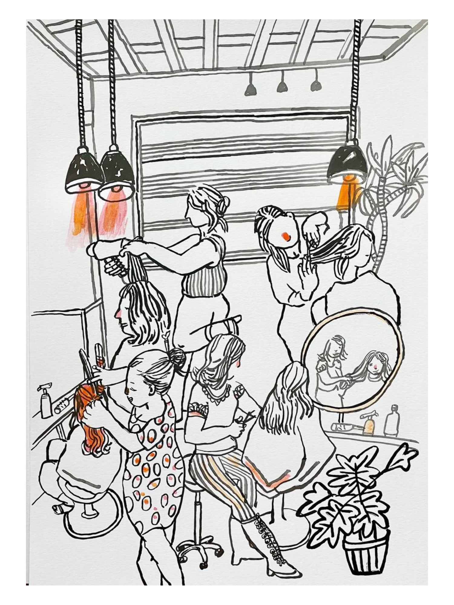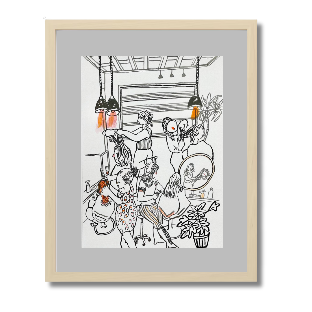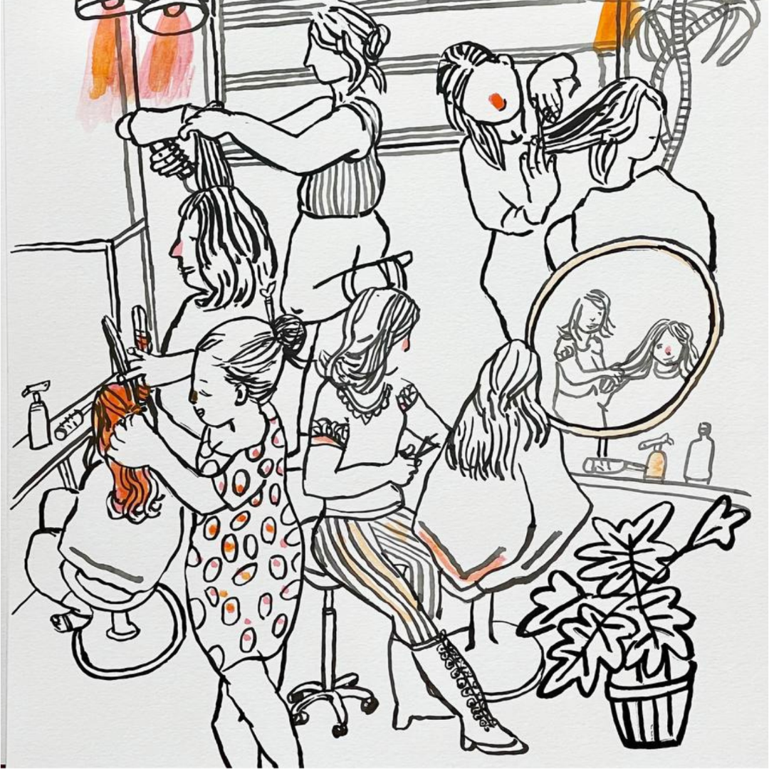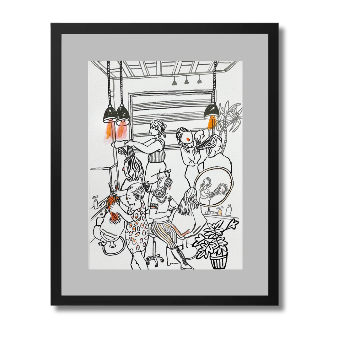 With fluid ink lines and washes of muted colour, Mahboobeh Yazdani captures the gestures, moods, and textures of a beauty salon space—subtle fragments of life seen through an artist’s lens. Full of emotional resonance and hand-drawn charm, this work stands alone or beautifully complements its companion piece.