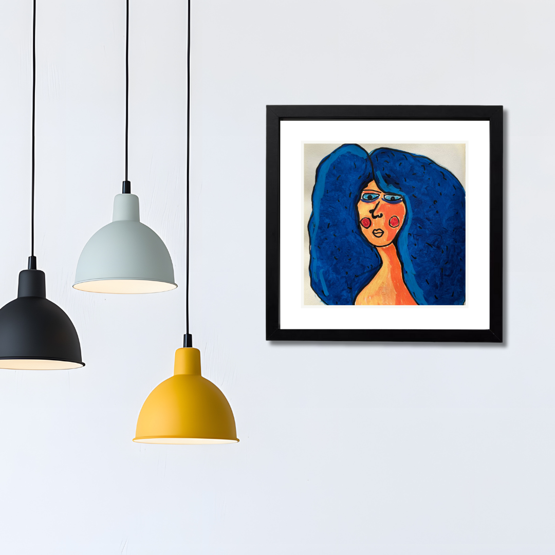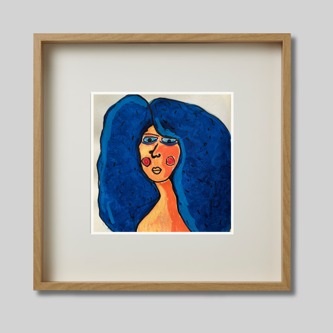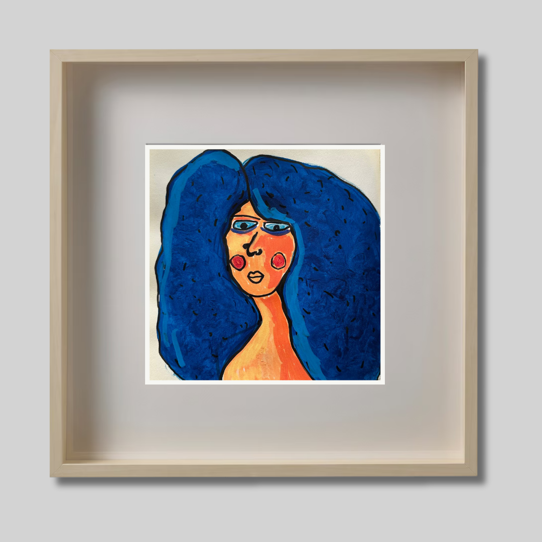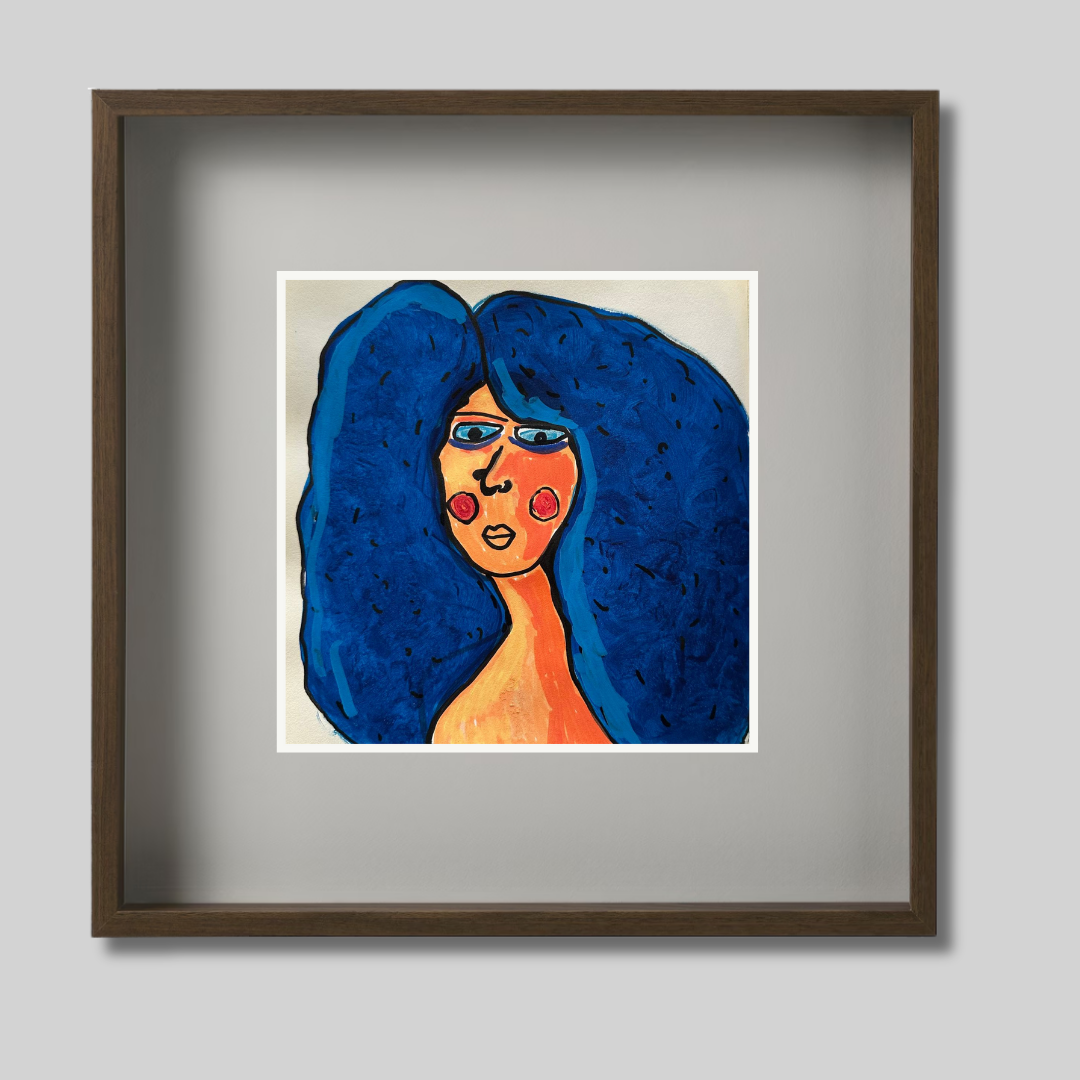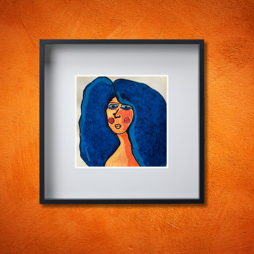 “Warm Blue” captures contrast and character in a minimalist yet expressive portrait by Azam Mahdavi. With deep cobalt hair cascading around a warm orange face and bright red cheeks, this stylized figure blends playful tones with a calm, introspective mood. A perfect fusion of bold colour and whimsical expression.