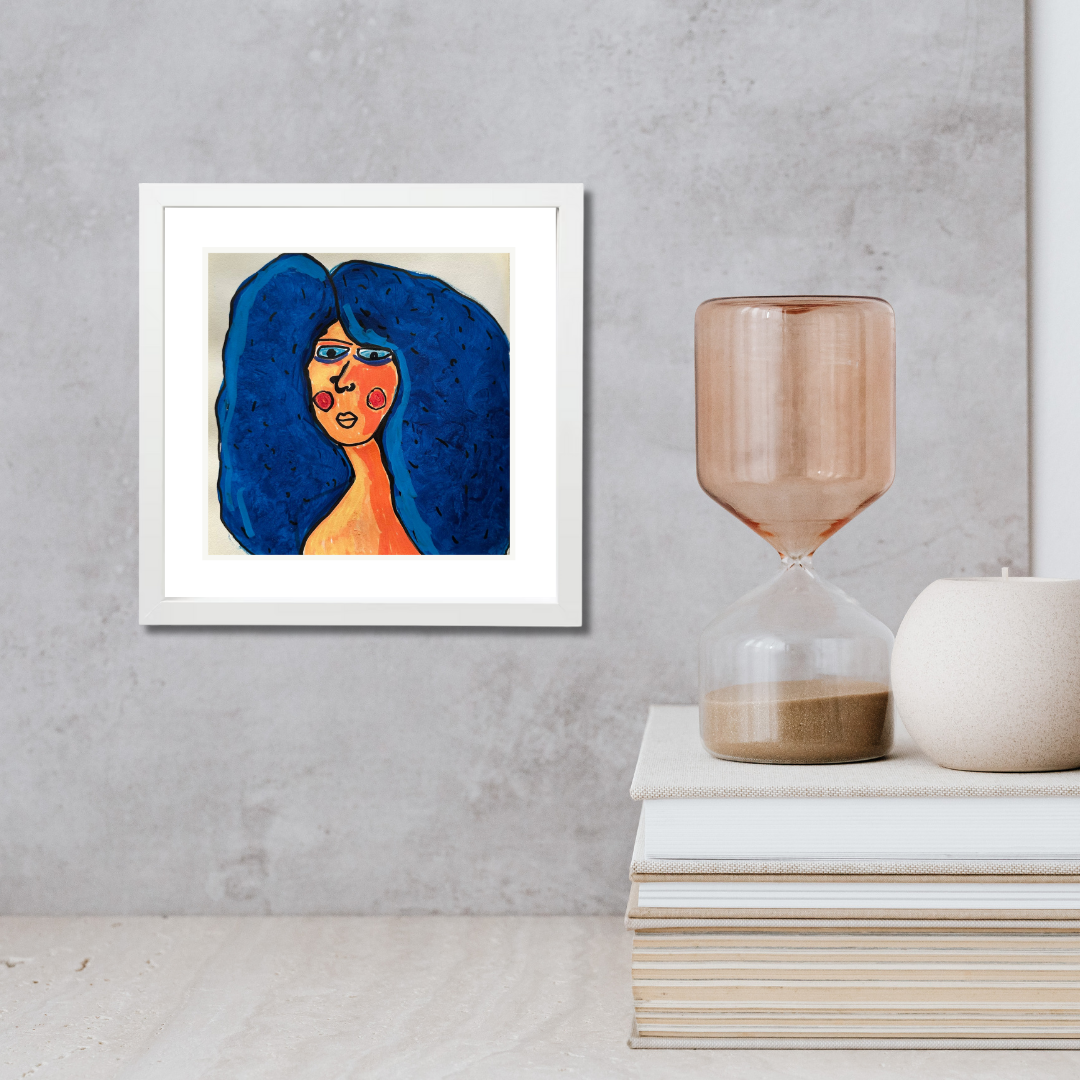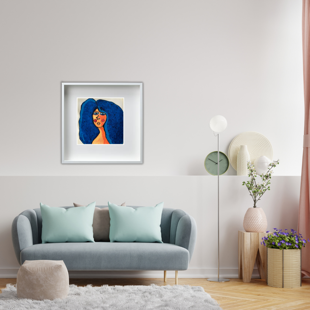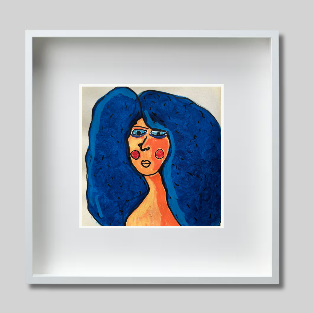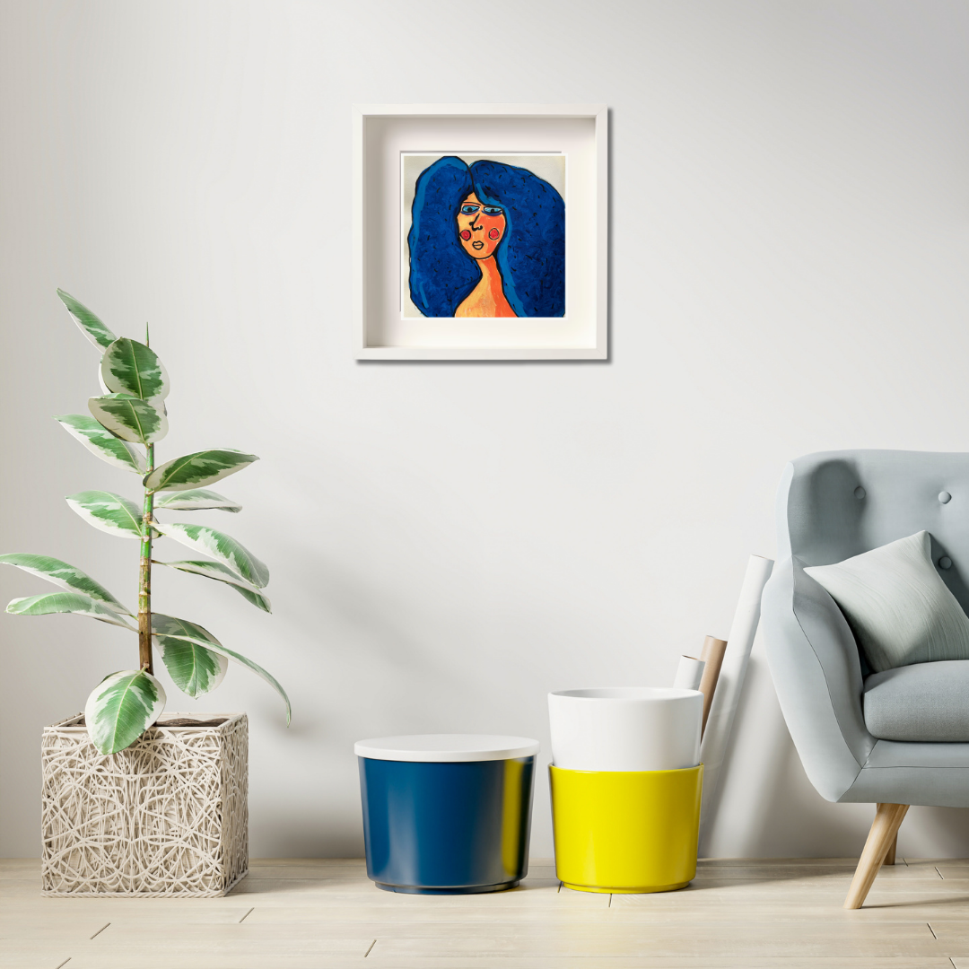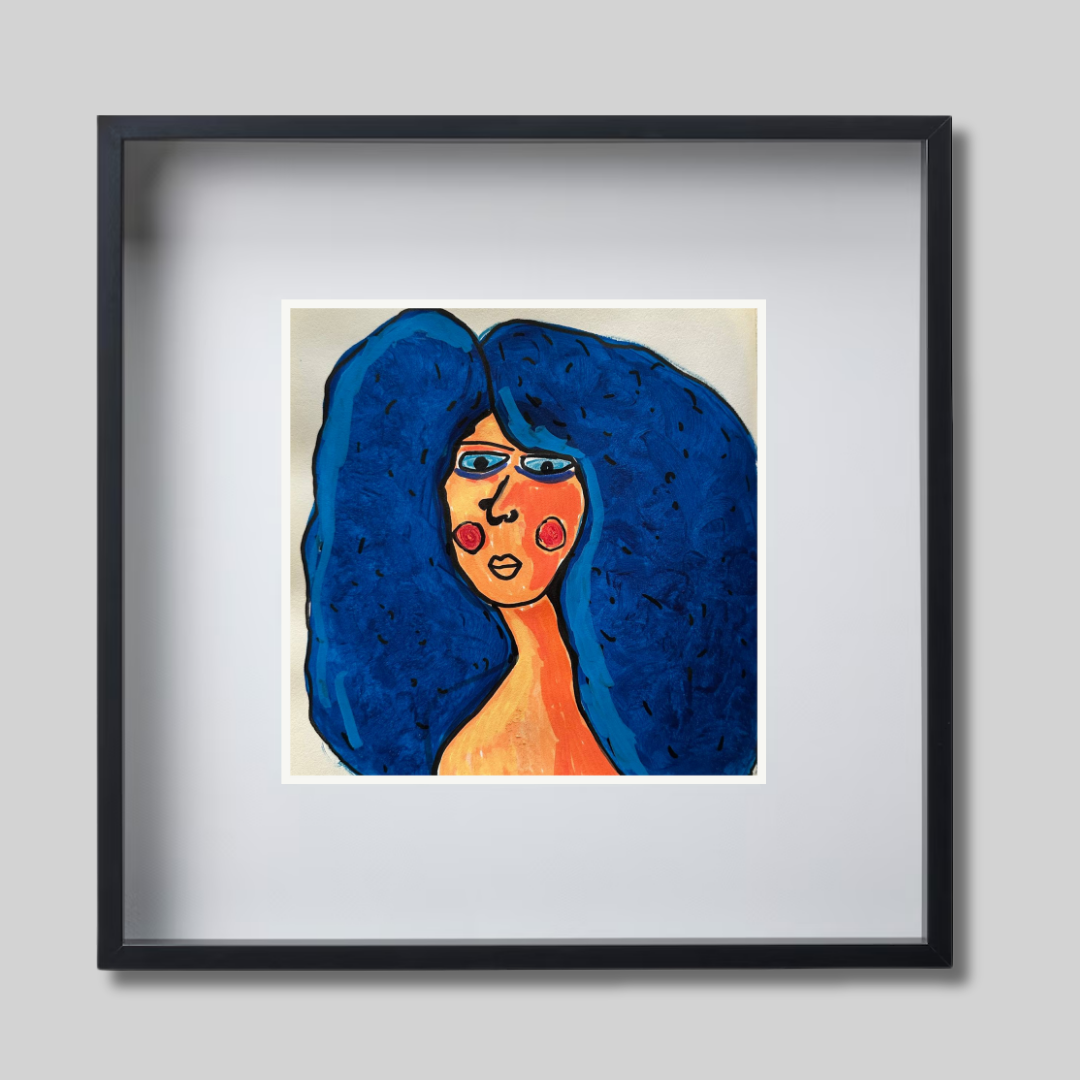 “Warm Blue” captures contrast and character in a minimalist yet expressive portrait by Azam Mahdavi. With deep cobalt hair cascading around a warm orange face and bright red cheeks, this stylized figure blends playful tones with a calm, introspective mood. A perfect fusion of bold colour and whimsical expression.